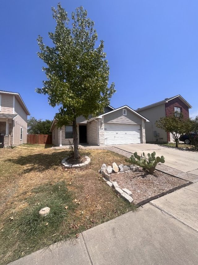This beautiful home in Manor, Texas features 3 bedrooms, 1 bath with an open floor plan and a 2-car garage with a fenced backyard. The entry way opens up to the living room and dining area.