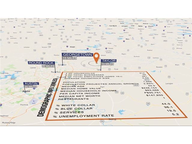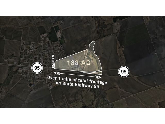 Commercial or mixed-use development property located just north of Austin in one of the fastest growing counties in Texas. Located on the south side of Granger, the property includes over 1 mile of total frontage on State Highway 95, ~250 feet of frontage on Doss Lane and ~3,800 feet on County Road 347. Located just 11 miles north of where the huge $17 billion dollar Samsung semiconductor facility will be built near Taylor. A small portion of the property is located within the city limits of Granger and the remainder is in the Granger ETJ. Water and utilities are available and the two houses on the property currently utilize city water. Currently under cultivation and grazing and the property is under a 1-d-1 Ag appraisal keeping the taxes low. There are currently two small rental homes on the property that need some work. There is also a cell tower with a long-term lease located on the southeast edge. Willis Creek runs through the south end of the property creating some floodplain.