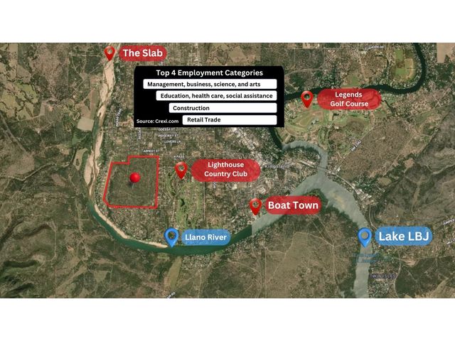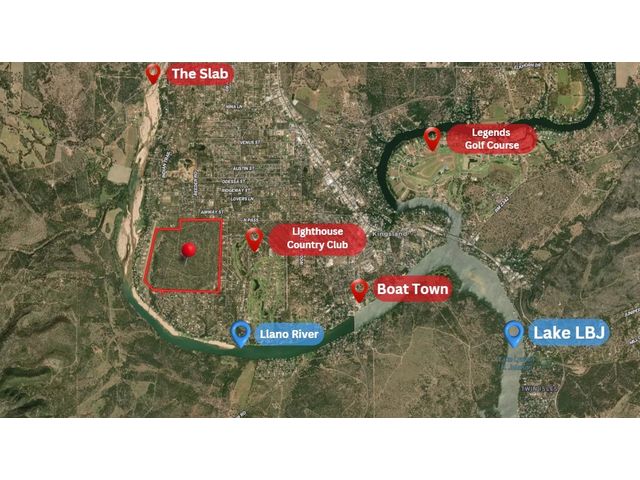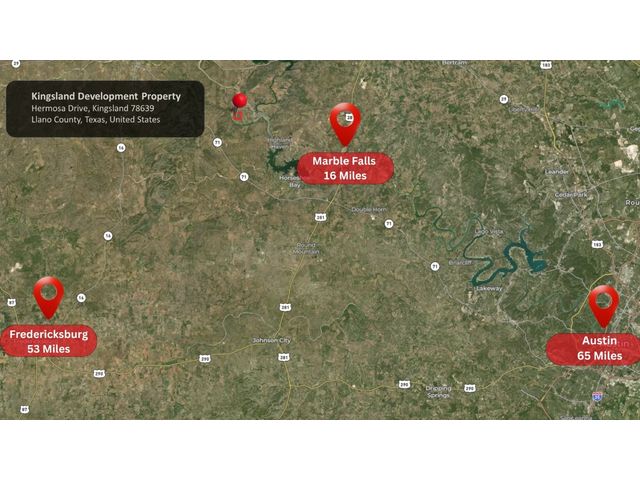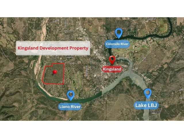 Back on the market! Huge Price Reduction! Bring your offers! Once-in-a-lifetime opportunity to purchase a very large, ~363-acre, contiguous, development tract of land inside the unincorporated city of Kingsland, TX. This undeveloped tract is surrounded by housing and housing infrastructure. Water and wastewater infrastructure surrounds the property supplied and managed by Kingsland Water Supply Corp. and the Kingsland Municipal Utility District. The Lighthouse Country Club golf course is close by. The Llano River arm of Lake LBJ is within easy walking distance. There is a private airstrip just on the west side of the property. This tract is currently a blank slate as far as development. Highest and best use will require some imagination and design work, but the possibilities are endless. The property has fertile sandy loam soil and is currently covered by native vegetation, including many large oak trees and native elm, cedar, and mesquite trees. The property is presently under a 1-d-1 Ag valuation which keeps the taxes very low. Kingsland is unincorporated and is a census-designated place (CDP) with a population of over 7,000. As per the Kingsland/Lake LBJ Chamber of Commerce, Kingsland is nestled between the beautiful waters of the Llano and Colorado Rivers, and on the banks of Lake LBJ. The Highland Lakes area attracts many vacationers as well as second homeowners. The property is relatively flat and is accessible at four different locations, with the main entrance on the south side of the property from Hermosa Street. This tract has the potential to connect to Lake LBJ via a channel. Location: Walking distance to Lake LBJ, 3 ½ miles to downtown Kingsland, 16 miles to Marble Falls, 18 miles to Horseshoe Bay, 18 miles to Llano, 65 miles to downtown Austin.
