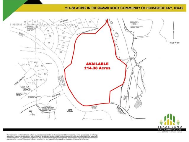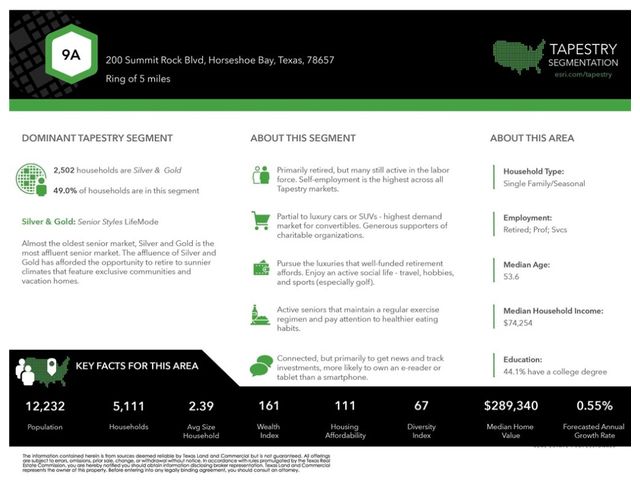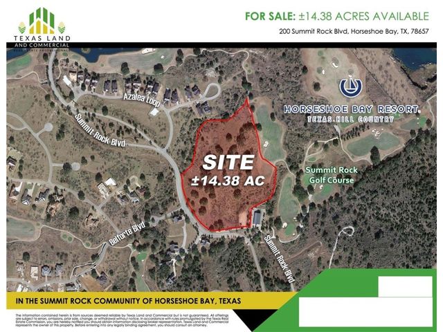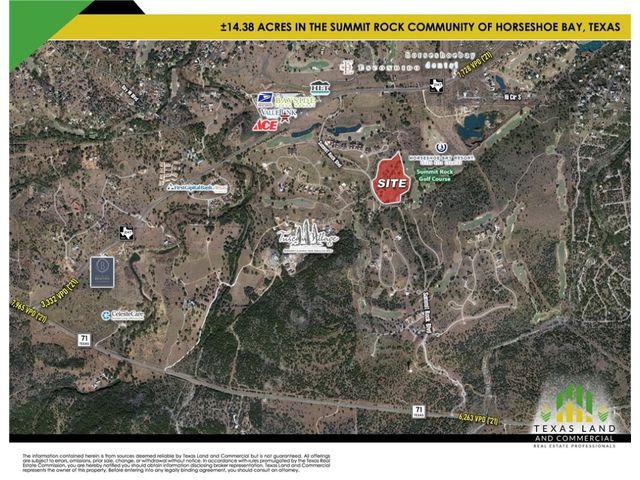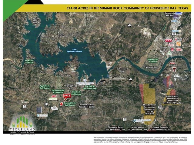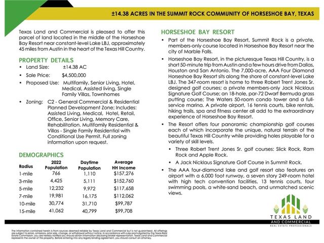 Pleased to present this listing in the middle of Horseshoe Bay Resort near constant-level Lake LBJ, approximately 45 miles from Austin in the heart of the Texas Hill Country. •Summit Rock is a private, members-only course located in Horseshoe Bay Resort near the city of Marble Falls. • Horseshoe Bay Resort, in the picturesque Texas Hill Country, is a short 50-minute trip from Austin and a few hours drive from Dallas, Houston and San Antonio. The 7,000-acre, AAA Four Diamond Horseshoe Bay Resort sits along the shore of constant-level Lake LBJ. The 347-room resort is home to three Robert Trent Jones Sr. designed golf courses; a private members-only Jack Nicklaus Signature Golf Course; an 18-hole, par-72 Dwarf Bermuda grass putting course; The Waters 50-room condo tower and a full- service marina. A private airport, 16 tennis courts, bike rentals, hiking trails, spa and fitness center all add to the extraordinary experience of Horseshoe Bay Resort. • The Resort offers four panoramic championship golf courses each of which incorporate the unique, natural terrain of the beautiful Texas Hill Country while providing holes playable for a variety of skill levels. • Three Robert Trent Jones Sr. golf courses: Slick Rock, Ram Rock and Apple Rock. • A Jack Nicklaus Signature Golf Course in Summit Rock. • The AAA four-diamond lake and golf resort also features an airport with a 6,000 foot runway, a seven story 249-room hotel with high tech convention facilities, 13 tennis courts, four swimming pools, a white-sand beach and scenic views. Proposed use: Multifamily, Senior Living, Hotel, Medical, Assisted living, Single Family Villas, Townhomes • Zoning: C2 - General Commercial & Residential Planned Development Zone; Includes: Assisted Living, Medical, Hotel, Retail, Office, Senior Living, Memory Care, Rehabilitation. Multifamily Residential & Villas - Single Family Residential with Conditional Use Permit. Full zoning information upon request.
