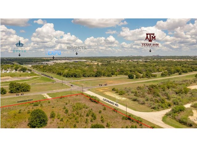 This 18.929 acre tract of land in a Bryan Opportunity Zone at the center of the upcoming Riverside Innovation Corridor project is close to TAMU, TAMU Health Science Center, Easterwood Airport, TAMU Rellis Campus, and the Brazos County Expo Center. It is located on the hard corner of Highway TX-47 (Riverside Parkway) and Leonard Road. There are no pipelines or easements running through the property, no significant elevation changes, and Wellborn Water is available on site. There is a City of Bryan 3-phase transmission line across from Emily Drive at the west boundary line and single-phase electricity on site along Leonard Road. The property provides 810+/- feet of Hwy 47 (Riverside Parkway) frontage, 1300+/- feet of Leonard Road frontage, and 700+/- feet of Emily Drive frontage. The City of Bryan has 2023-2025 planned sewer line upgrades and extensions. Targeted for massive growth in the next 2-5 years, this area is prime for investment.