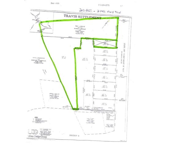 20 Acres with 400 ft frontage in the dynamic, fast-growing, Hwy 71 W growth corridor. Consisting of (2) ten Acre tracts - 1 fronting Hwy 71 and 1 fronting Reimers Peacock Rd (see plat). No Zoning or Restrictions. Lake Travis views. Excellent Development tracts at grade level with great visibility and views of Lake Travis. Unrestricted and priced to sell at under $6.54/SF. Older (tear down) home on back of property occupied - Do Not disturb tenant - dogs will bite. Call agent with any questions before showing.