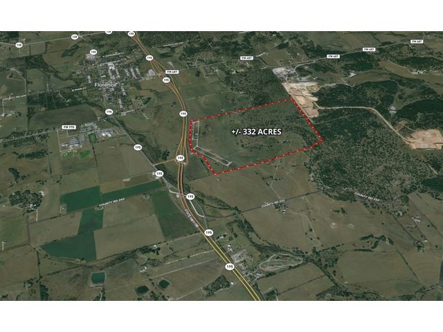 NEW to market 332-acre ranch with gentle, rolling topography, beautiful live oaks, multiple stock tanks and well-maintained open spaces. 1,700+ feet of frontage on Hwy 195 feeder road. Outside the city limits of Florence, TX and inside Williamson County.