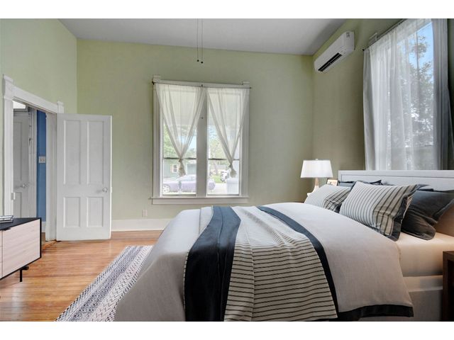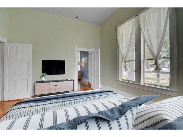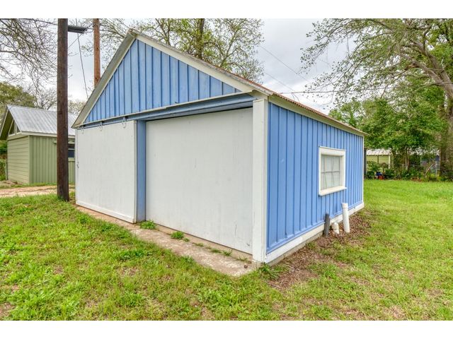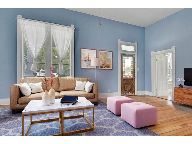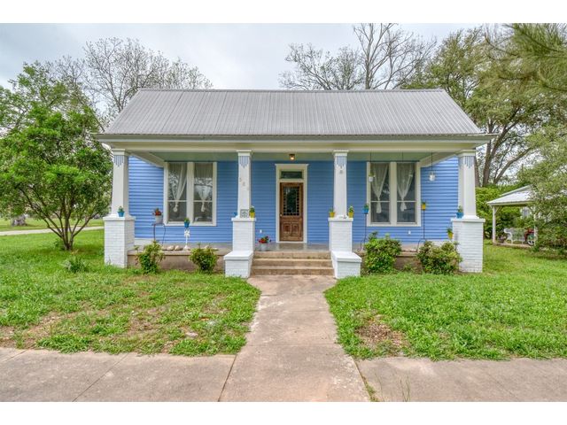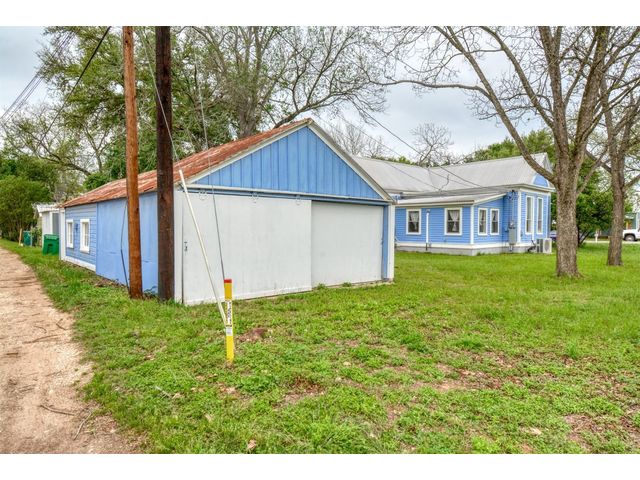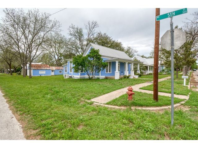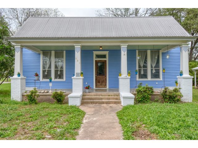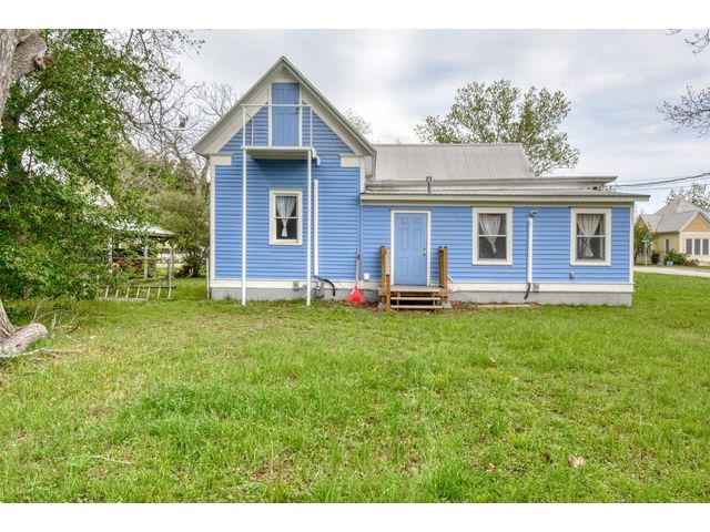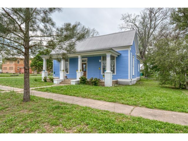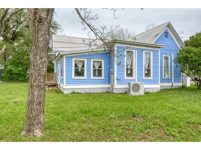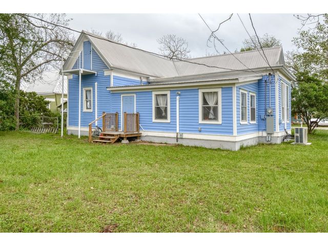 Timeless Classic! Step back in time and admire the Craftsmanship of this move in ready home, wonderfully located in the sought after historic district on a large corner lot! Enjoy the bright and open rooms, large windows and original decorative trim on interior walls with 12ft - 14ft ceilings throughout the house. The front door has stained glass and transom. This home retains the period correct details original to the house while incorporating essential modern upgrades such as the metal roof, house completely rewired in 2018 and is up to code with 6 smoke detectors. Stay comfortable with the incredibly efficient 5 zone Daikan mini split system (installed in 2022 comes with a 10 yr warranty) that allows heating or cooling of individual rooms, saving money monthly without having to heat or cool the entire house at once. The Hardwood floors were refinished in 2022. The interior was repainted in 2021 and the exterior was repainted in 2022. Enjoy the Cast Iron claw foot bathtub in the main bathroom. The detached 2 car garage is has an attached 250 SF workshop. The garage space is on a cement slab, and could possibly be converted to a rental living space as electricity, water and sewer fixtures are at the garage exterior. The next owner of this home will be just the fourth owner of this classic piece of downtown Smithville history! You will be within walking distance of historic downtown antique stores, shops, restaurants and Train park. Note: This home was virtually staged.