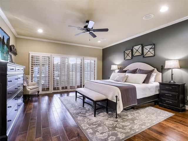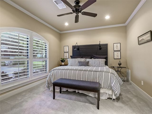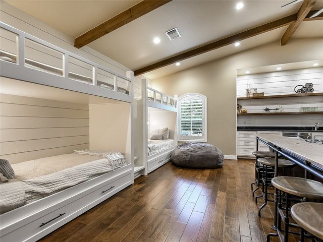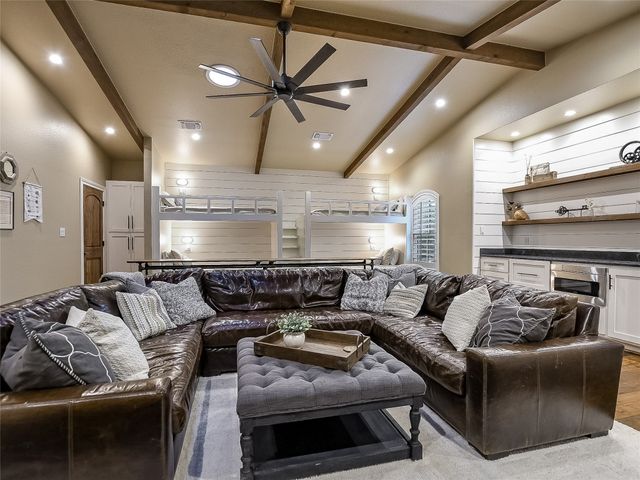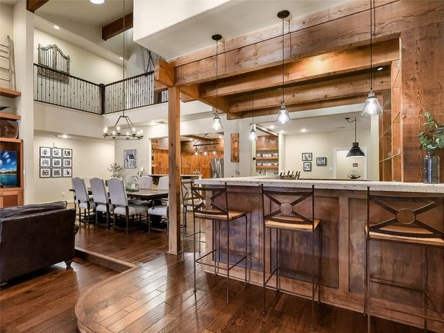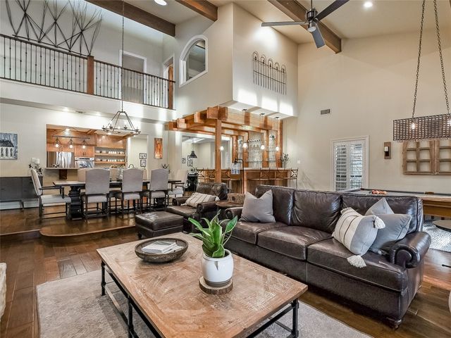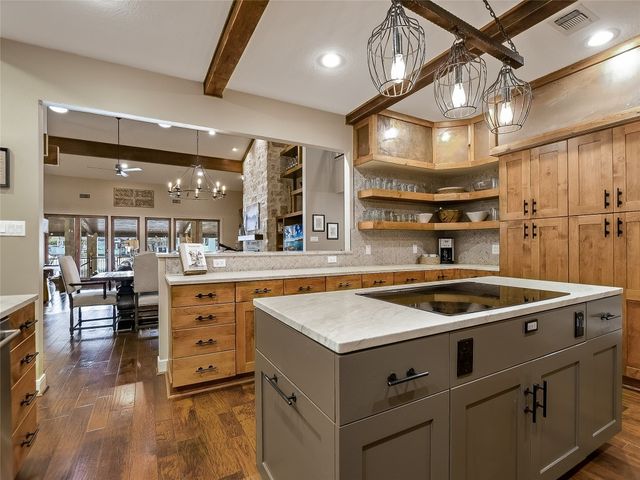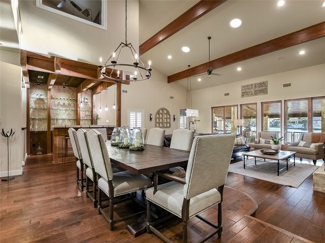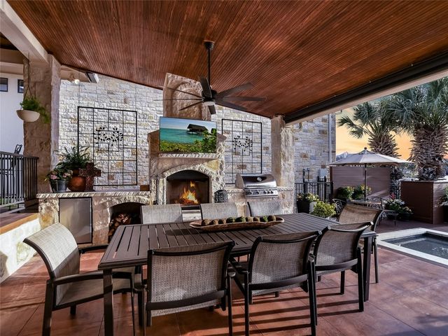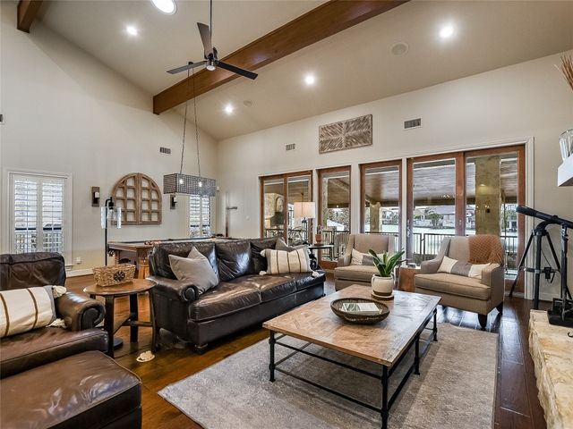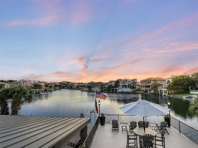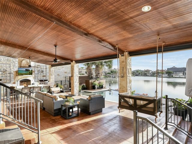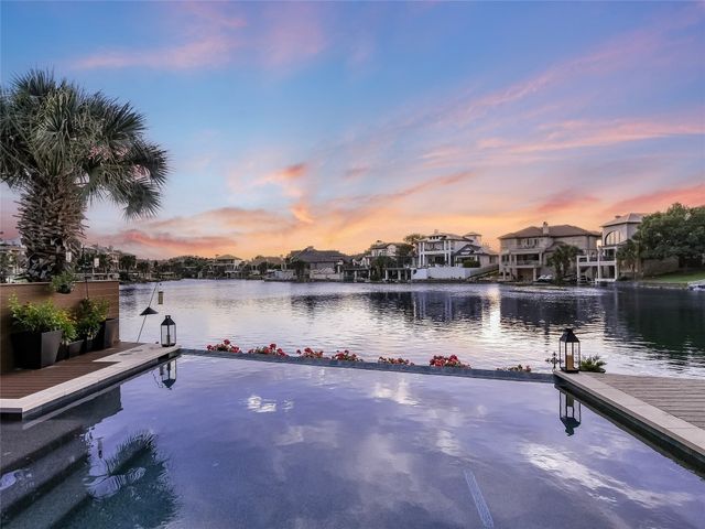 Experience stunning evening sunsets, where this elegant retreat makes every nightfall unforgettable. An unbelievable value at $654/Sqft, step inside to an open-concept living, dining, and kitchen area where craftsmanship abounds—copper-clad soffits, wood cabinetry, stainless steel appliances, and quartzite countertops, are enhanced by serene water views. The formal dining room, anchored by a wooden-beamed bar, is ideal for hosting, while the stone fireplace adds warmth. The primary suite features lake views, a walk-in closet, and an ensuite bath with double sinks, soaking tub, separate glass shower, and WC. The secluded first-floor guest suite ensures privacy for visitors. Upstairs, accessible by stairs or elevator, the ultimate kids' retreat awaits, complete with built-in bunk beds, a mini kitchen, and an entertainment center—it’s a bunkroom for play and relaxation. The fifth bedroom and bunk room share a full bath. Three more generously sized bedrooms, each with an ensuite bath, provides comfort for guests and a restful study with custom cabinetry and a media center offers a quiet workspace. Outdoor living is effortless with an infinity-edge pool, large covered living and dining areas, and an outdoor gourmet kitchen. Relax poolside or on the boathouse patio, where the dog run is steps away and the Island’s amenity center is a short walk away. Recent renovations, including a new roof and HVAC in 2017, ensure long-term comfort. A Horseshoe Bay Resort Membership is included upon application and acceptance.