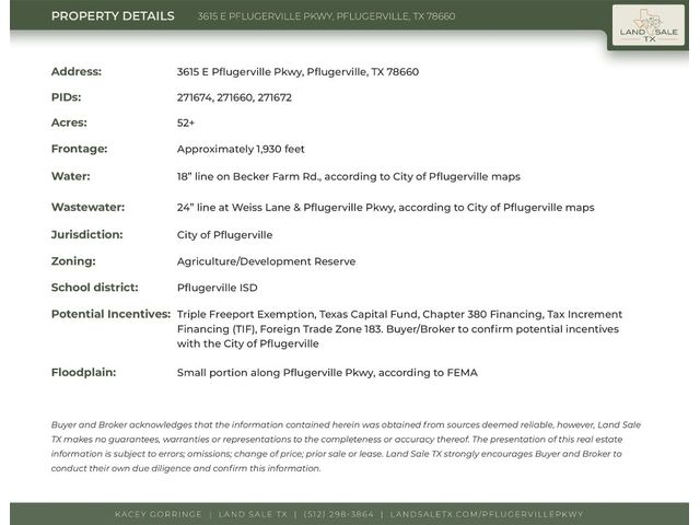 This is a remarkable opportunity to own a sprawling 52-acre Ag Exempt property in a prime location! This exceptional parcel of land offers a plethora of possibilities for prospective buyers in an area with rapid development including the adjacent Lakeside Meadows (416 Acre Mixed-Use Development w/ Pepsi Co. as the anchor tenant taking down approximately 500,000 SF), the proposed 219 Acre Mixed-Used Domain-Like Development 10 minutes away, and a new H-E-B that just broke ground 2 minutes away and set to open in the Fall of ’24. There's a 24” Wastewater Line located at Weiss Lane & Pflugerville Pkwy, and an 18” Water Line on Becker Farm Rd. The property is situated just 6 minutes away from Baylor, Scott & White, Walmart, Target, Costco, Home Depot, and many more retail options. Adventure awaits just 5 minutes away at the thrilling Texas Typhoon Waterpark and the prestigious Blackhawk Golf Club, perfect for outdoor enthusiasts seeking leisure and relaxation. Enjoy a thrilling day out at the acclaimed Kalahari Indoor Waterpark Resort & Conventions, just 18 minutes away. Families will also appreciate the property's proximity to Pflugerville ISD schools, ensuring a short commute of 4 minutes or less for students to reach their Elementary, Middle & High School campuses. Save time on your daily commute with quick access to the 130 toll road, located just 2 minutes away. Don't miss out on this rare chance to acquire 52 acres of prime land with an ideal location and impressive amenities. Buyer and Broker acknowledge that the information contained herein was obtained from sources deemed reliable, however, Land Sale TX makes no guarantees, warranties or representations to the completeness or accuracy thereof. The presentation of this real estate information is subject to errors; omissions; change of price; prior sale or lease. Land Sale TX strongly encourages Buyer and Broker to conduct their own due diligence and confirm this information.