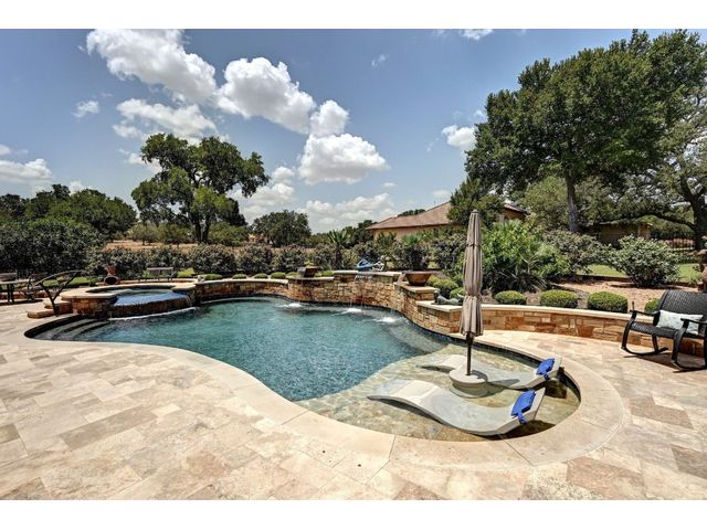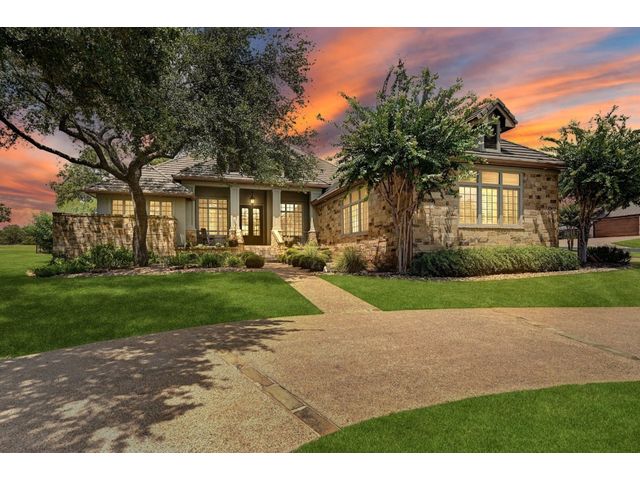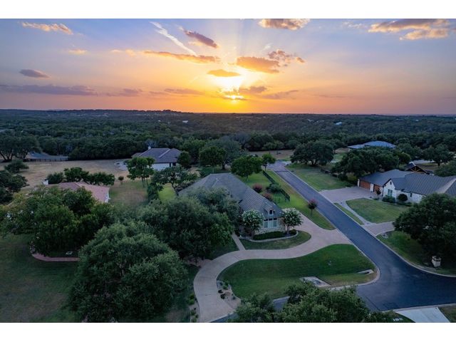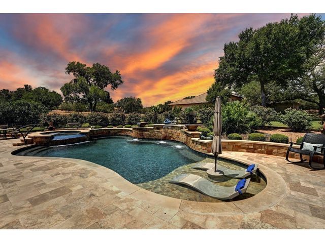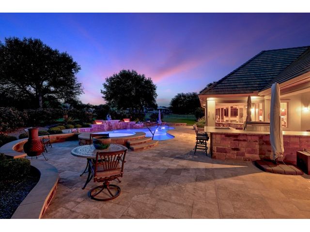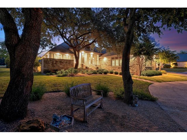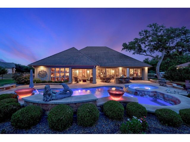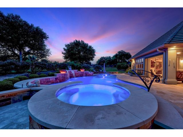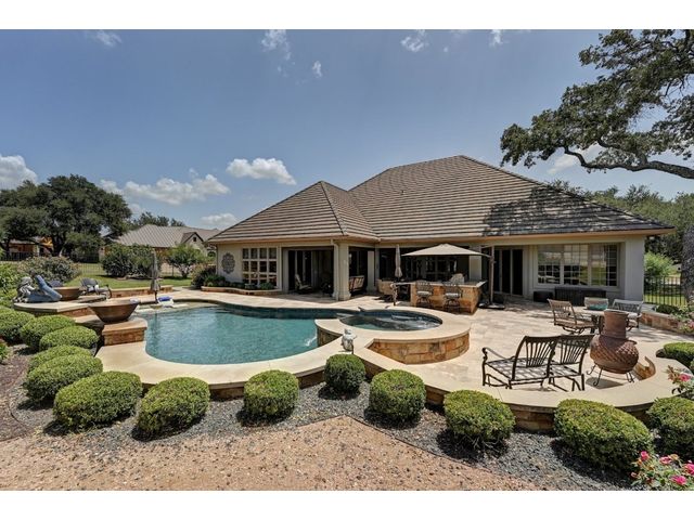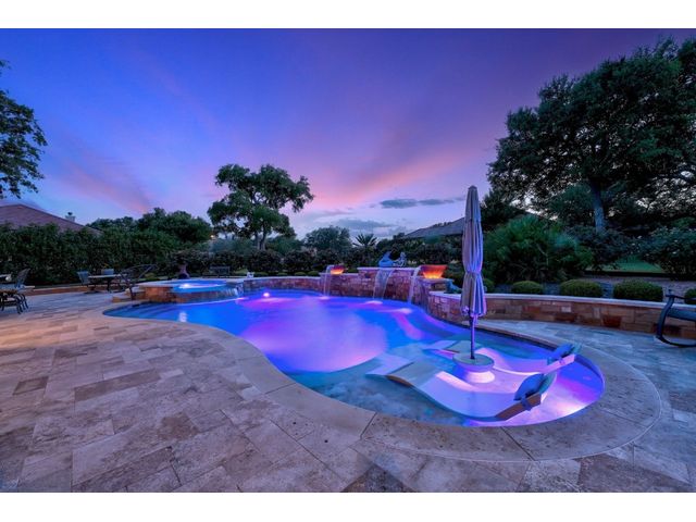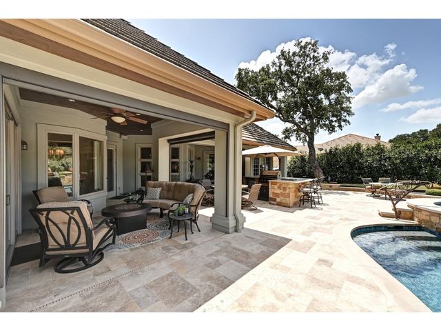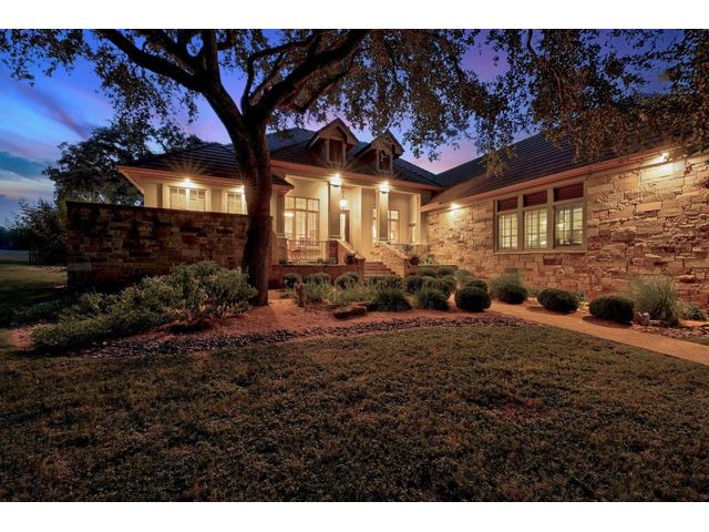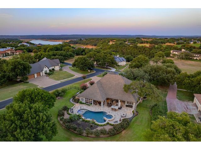 You’ll fall in love with this captivating custom home located in the exclusive gated community of Barton Creek Lakeside. From the minute you step into the inviting entry foyer, you are surrounded by unparalleled quality. This one level home contains a kitchen any chef would love to create in. It boasts beautiful granite countertops, stainless steel appliances, quality lighting, and several eating areas. The family room is warm and inviting with a gorgeous gas log fireplace with views of the sparkling pool and yard. The primary suite is quiet with walls of windows also overlooking the pool and yard. The primary bath is stunning, with double vanities and a jetted tub for relaxing. The home has coffered ceilings and many other upgrades. In addition to the two secondary/guest bedrooms, there is a separate office with cutting edge technology including high speed fiber optics. Recent (2018 & 2021) Energy Efficient HVAC units. The home sits on a .66 acre corner lot with majestic mature oak trees. The impressive custom heated pool was added in 2018 along with a travertine patio, professional landscaping, and wrought iron fenced back yard with Zoysia grass. To complete this backyard oasis, there is an outdoor kitchen with a 36” gas grill, stainless steel cabinets, and an outdoor under-counter refrigerator. Just think of the wonderful memories you could build. The neighborhood has a 24 hour security guard gated entrance, and access to Lake Travis via a boat ramp & marina. The exclusive Omni Barton Creek Lakeside Country Club is located within the gates of the subdivision. It includes an 18 hole Arnold Palmer golf course, stunning pool, clubhouse with gym, tennis courts, pickleball courts, restaurant, and cottages to rent for guests. (Golf and Social memberships are optional) All of this is located in the unique Texas Hill Country within 30 minutes of the Hill Country Galleria, 45 minutes from Austin, and 30 minutes to the picturesque city of Marble Falls.