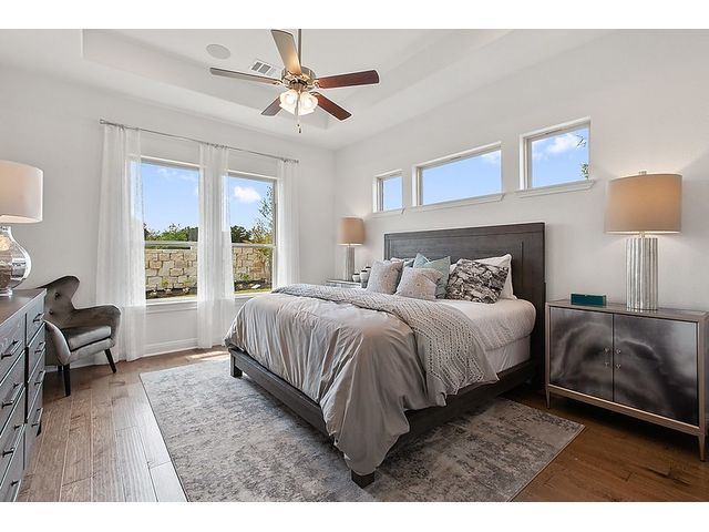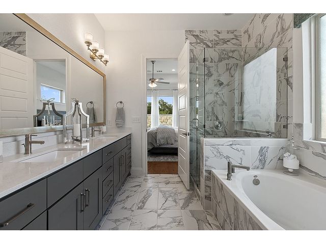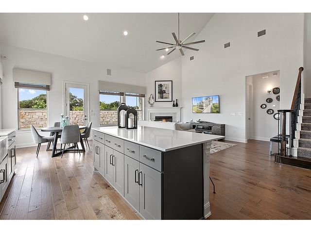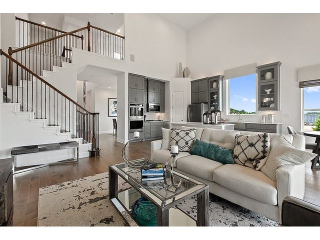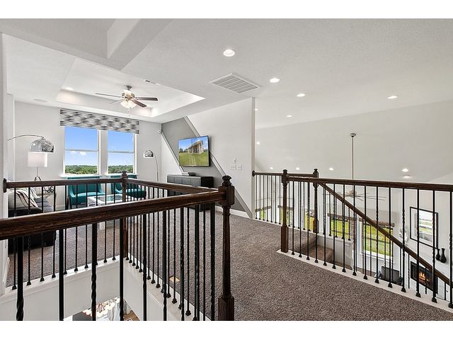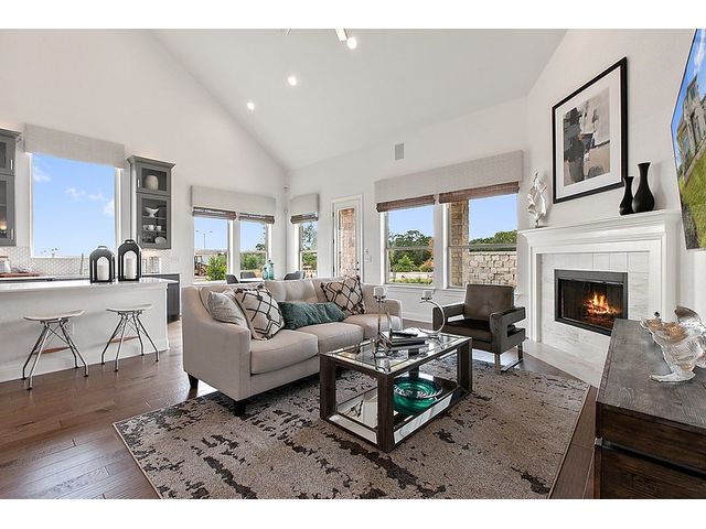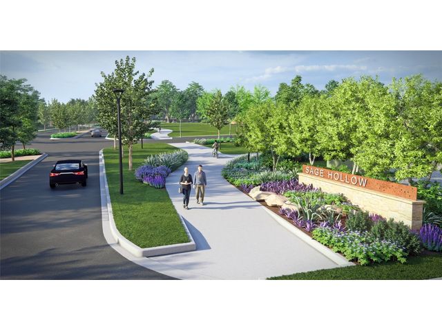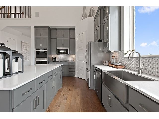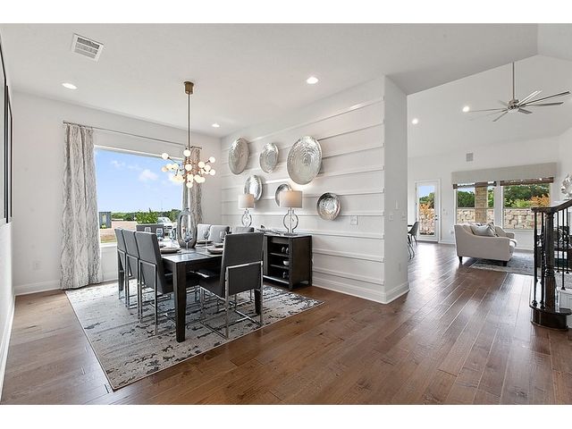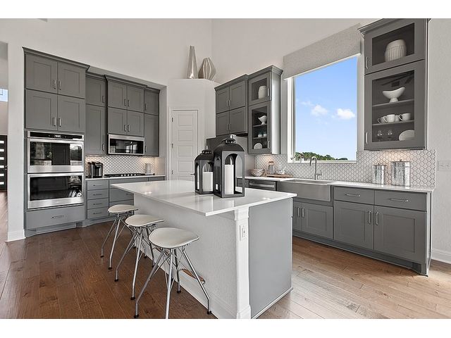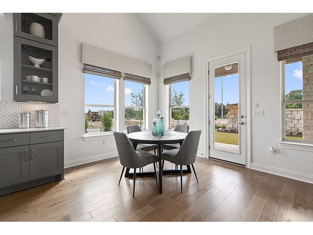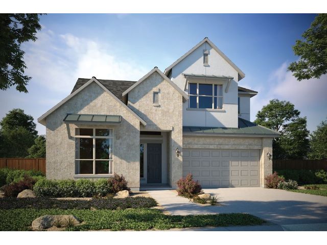 Upon entry to the Trinity plan you are greeted with soaring ceiling and will find luxury finishes throughout! This open-concept two-story offers a grand staircase, large primary suite, plus an additional first floor bedroom with an attached full bath and walk-in shower. The formal dining space and breakfast nook are located conveniently near the gorgeous kitchen! Features include; built-in stainless steel double-ovens, white Kent Moore cabinetry set to 10 feet for maximum storage, a large center island and upgraded pendant lighting. Quartz counter tops are featured throughout the kitchen and all bathrooms. The private owner's suite features trace ceilings, a huge closet, and an extended mud-set shower. Upstairs you will find 2 additional spacious bedrooms, a recreation space over-looking the first floor through open railing, and an office nook. Home is pre-plumbed with a water softener loop and will come complete with four sides-masonry, and a large covered patio. Boutique neighborhood with lots of mature trees, a dog park, walking trails, and a pool already under construction! Zoned to highly desirable schools.