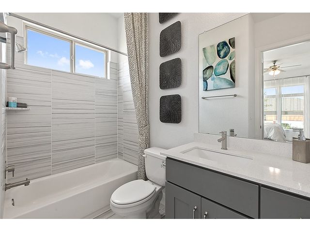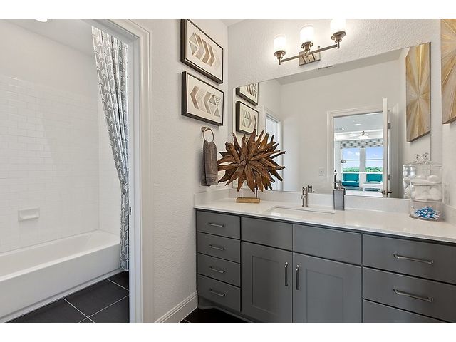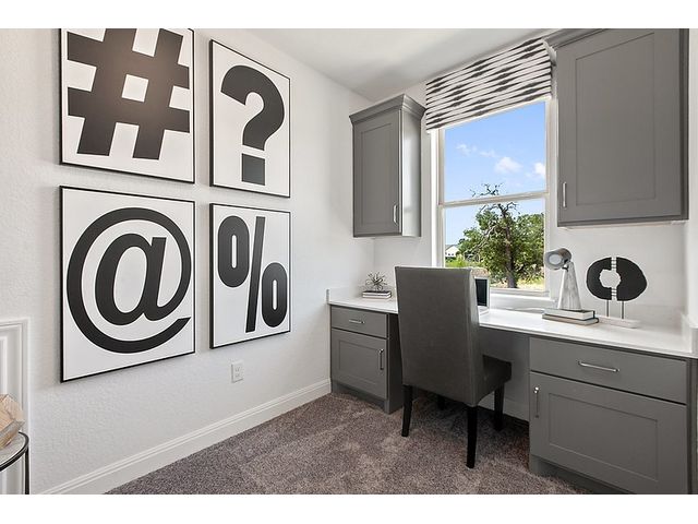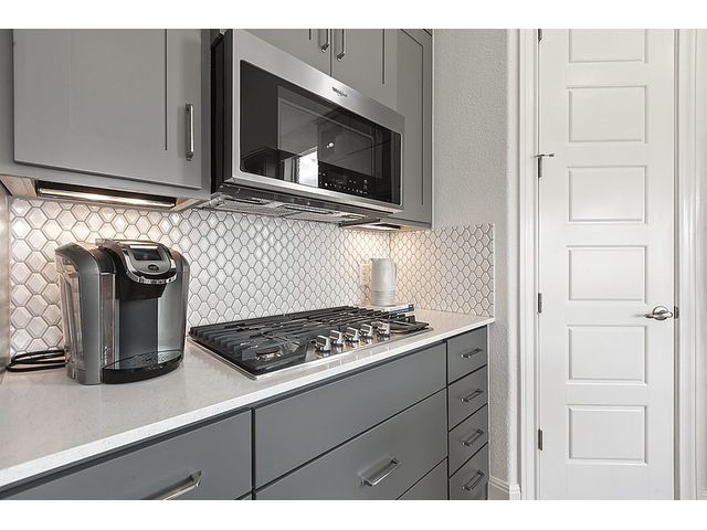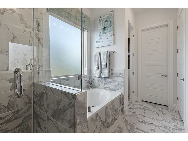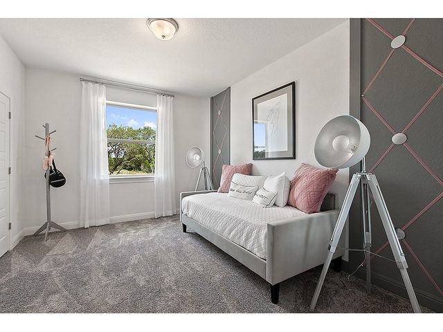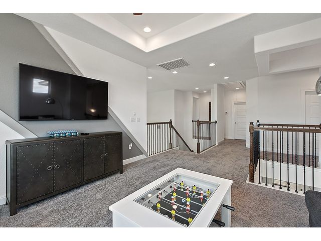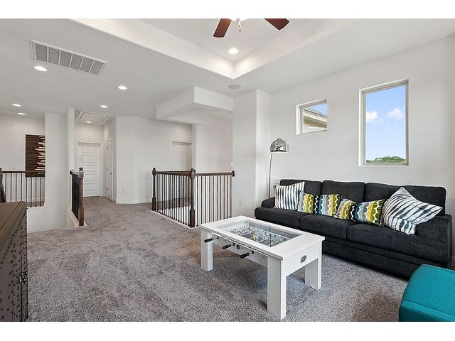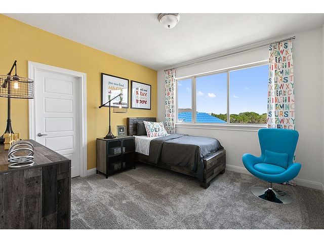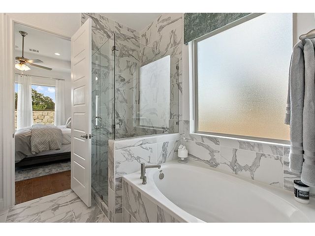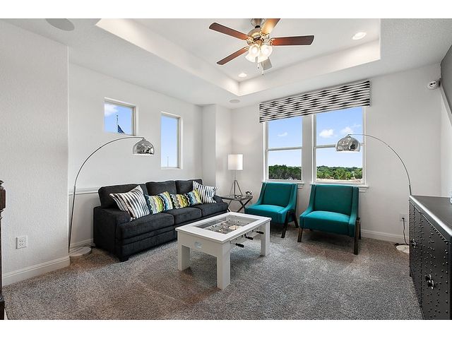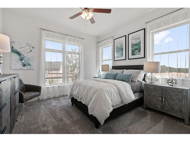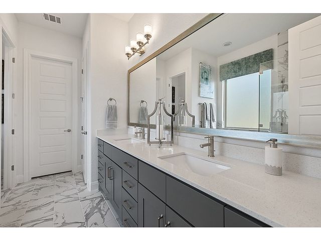 Upon entry to the Trinity plan you are greeted with soaring ceiling and will find luxury finishes throughout! This open-concept two-story offers a grand staircase, large primary suite, plus an additional first floor bedroom with an attached full bath and walk-in shower. The formal dining space and breakfast nook are located conveniently near the gorgeous kitchen! Features include; built-in stainless steel double-ovens, white Kent Moore cabinetry set to 10 feet for maximum storage, a large center island and upgraded pendant lighting. Quartz counter tops are featured throughout the kitchen and all bathrooms. The private owner's suite features trace ceilings, a huge closet, and an extended mud-set shower. Upstairs you will find 2 additional spacious bedrooms, a recreation space over-looking the first floor through open railing, and an office nook. Home is pre-plumbed with a water softener loop and will come complete with four sides-masonry, and a large covered patio. Boutique neighborhood with lots of mature trees, a dog park, walking trails, and a pool already under construction! Zoned to highly desirable schools.