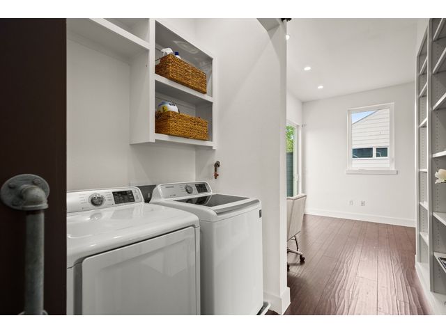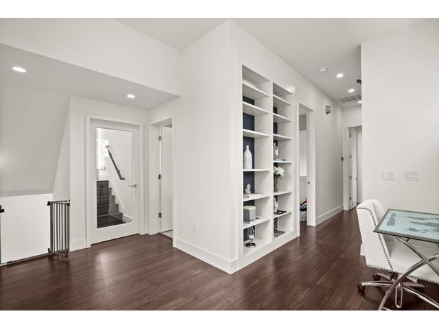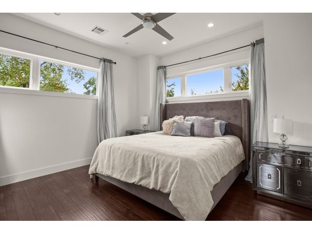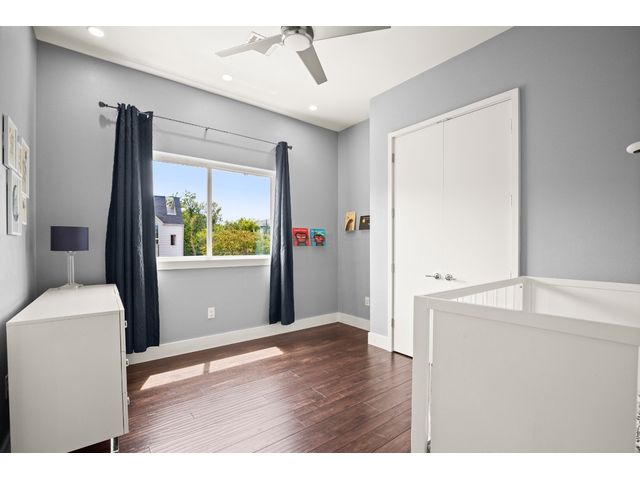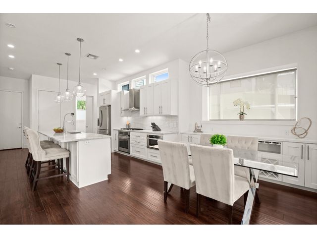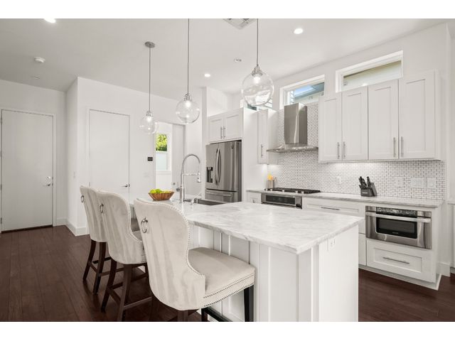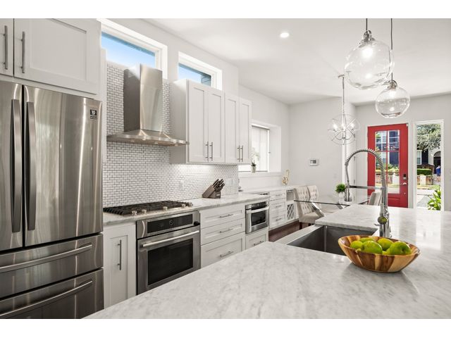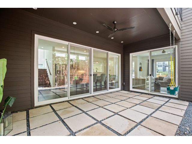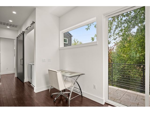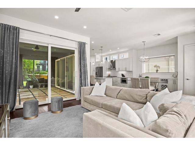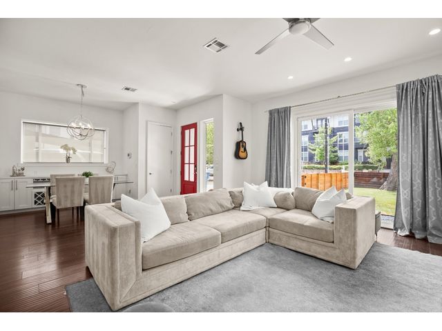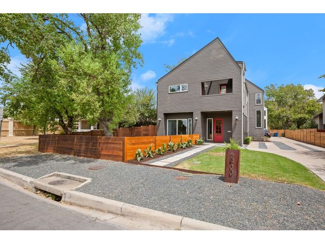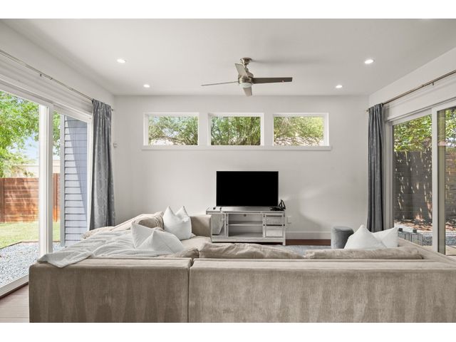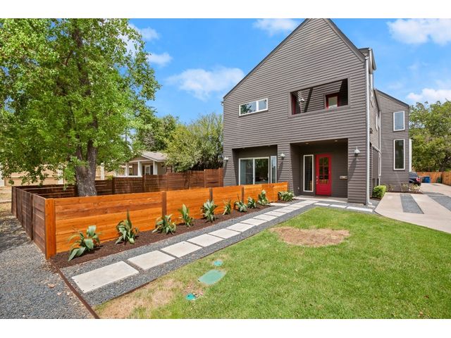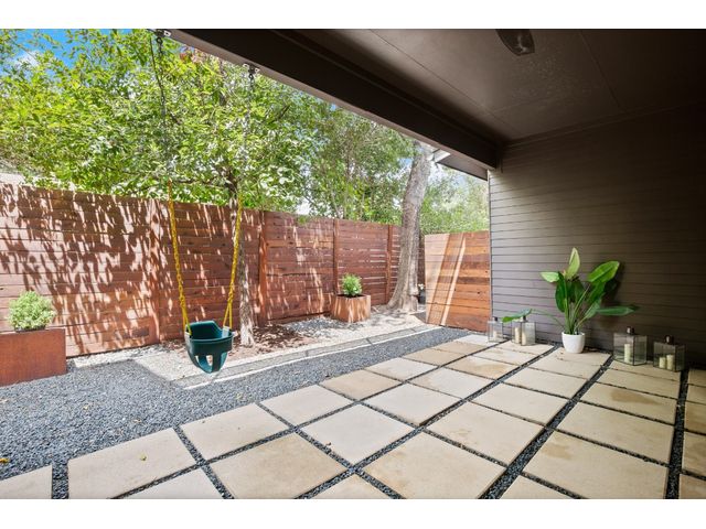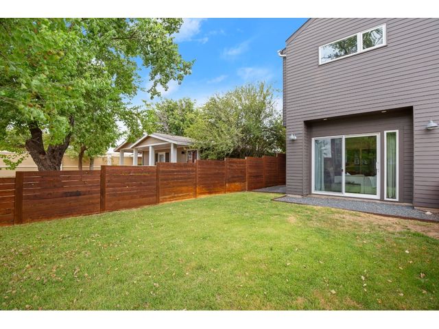 This HGTV-inspired condo is located on a quiet dead-end street that has a sound wall, but it does NOT back to Mopac, and is ideally situated just 5 miles from the heart of DT Austin, a mere 4 miles from Mueller and 7 miles from The Domain. Enjoy being just steps away from all of the wonderful amenities in The Grove (restaurants, parks, and hike & bike trails) but without the high HOA dues (no HOA dues!). This modern home lives as a single family with a large fully fenced front yard & multiple outdoor spaces & only shares a garage wall with the back unit. Step inside & be greeted by high ceilings, hardwood flooring & crisp white walls. Natural light floods the interior through large windows, illuminating every corner of this inviting abode. The open concept floorplan is a masterpiece of functional design, crafted for both comfort & entertainment. The spacious living room flows into the dining area & chef's kitchen which is a culinary haven adorned with luxurious quartz countertops, central island & breakfast bar, white shaker cabinetry, & sleek stainless-steel appliances. The adjacent dining area is a work of art, aglow with a modern chandelier & graced by a wall of built-ins, complete with wine storage. Journey to the 2nd floor & discover the primary suite, complete with a custom walk-in closet & en-suite bath with separate quartz-topped vanities & an oversized walk-in shower built for 2. The 2nd floor also boasts a flex room, ideal for a home office or reading nook, adorned with built-in bookcases & a stylish barn door that encloses the laundry closet. An additional bedroom & full bath complete this level. Ascending to the 3rd floor, you'll find another bedroom & bath, currently transformed into a kids' play area, showcasing the versatility of this exceptional space. Embrace the outdoors in your private fenced yard & relish in the delight of 3 patios. Lounge, dine, & entertain against the backdrop of this enviable location just moments away from all things Austin!