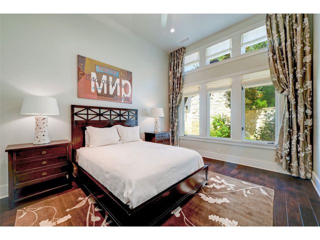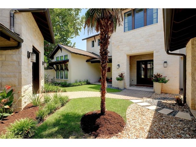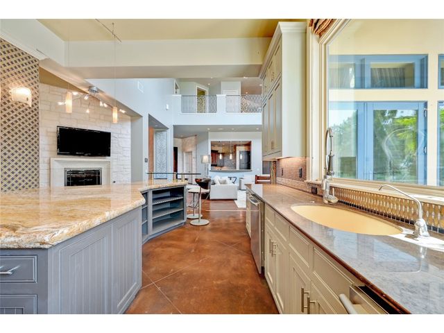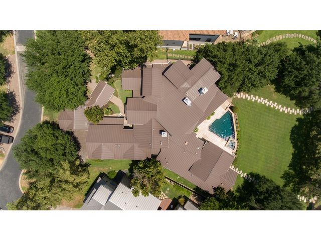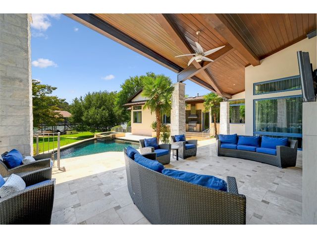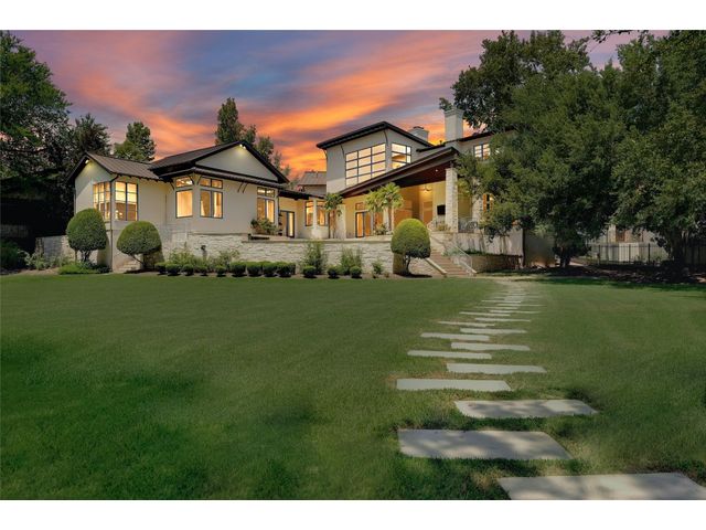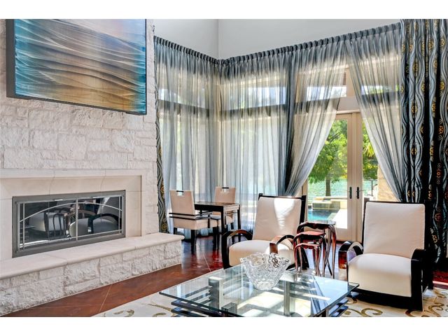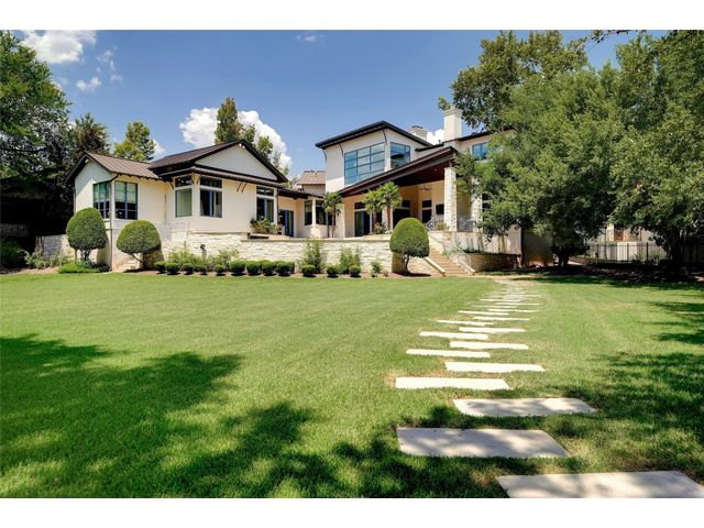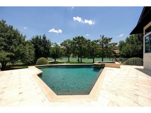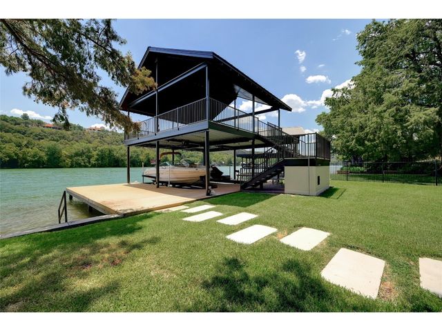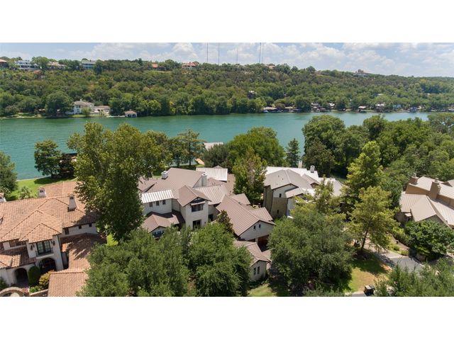 The epitome of resort-style Lake Austin living. Situated on a 1.71 acre level lot in the Landing at Greenshores, this stunning property offers 200 +/- feet of waterfront in an exclusive gated community. Primary and one guest bed on the main level/4 additional beds plus private office upstairs. Large gameroom and media room outfitted with 8 bunk beds. Beautiful dining area is complete with a wine room and opens to the main living area boasting soaring ceilings, incredible views and full-sized bar. Chef-worthy kitchen with fireplace, bar seating and a custom built-in breakfast booth. Primary bathroom fully equipped with two separate vanity areas, kitchenette with mini fridge, huge walk-in closet with stackable washer/dryer hookups and gorgeous lake views right from the bathtub! 3 gas/wood fireplaces in living room, kitchen and outdoor. An entertainer's dream, outdoor amenities include covered lounge area, pool/hot tub, two-story boat dock and outdoor kitchen with Twin Eagles grill. More than ample parking accommodations available by way of 3 garage spaces, driveway and common area just steps away that allows for 40+ spaces for special occasions. Subdivision is adjacent to Lakeside Park, which, in addition to its lake access, has a sand volleyball court, playscape and picnic tables and can be reserved. Also conveniently located near popular Ski Shores and Emma Long Park. All 5 interior HVAC units replaced in the Summer of 2023. This property is truly one of a kind.