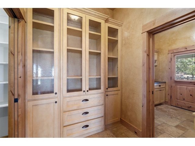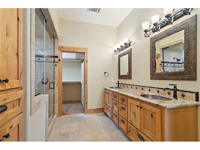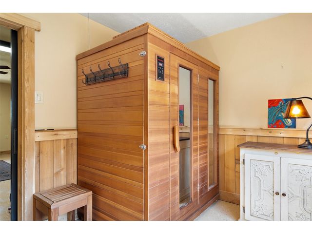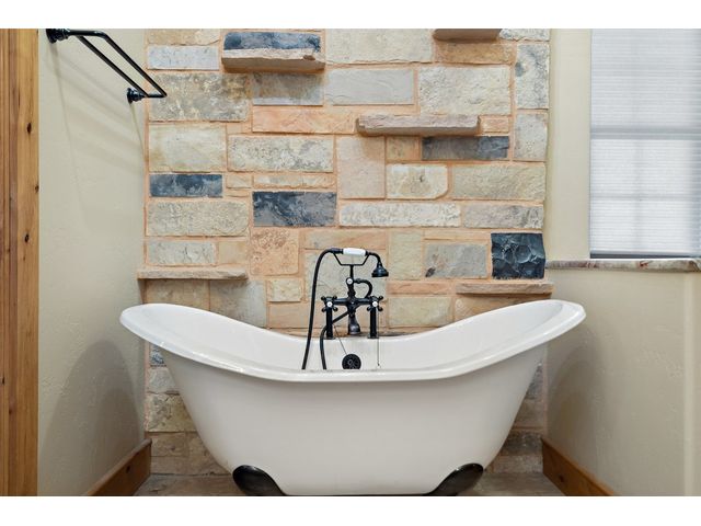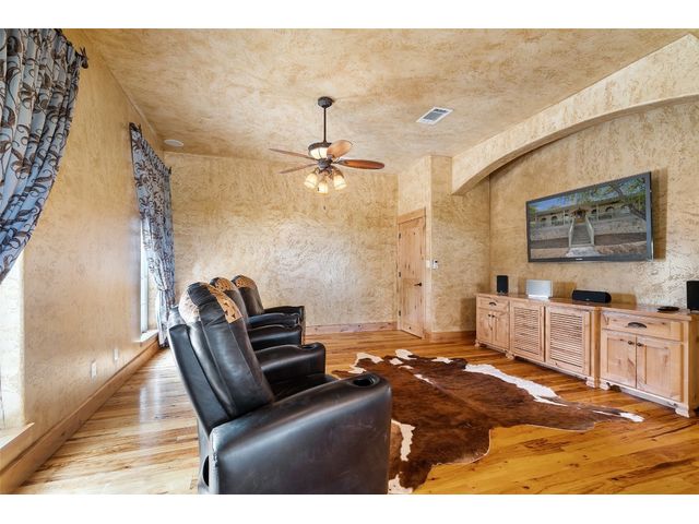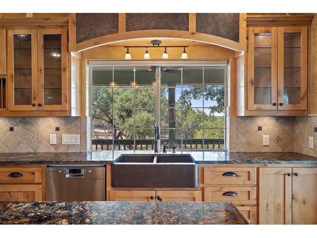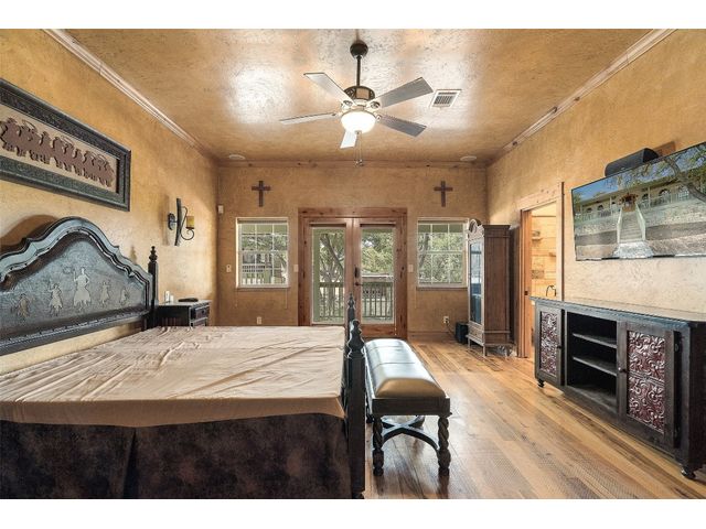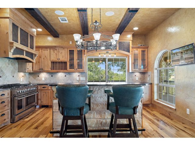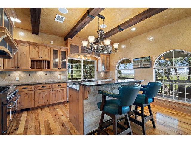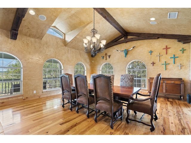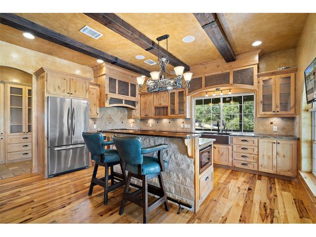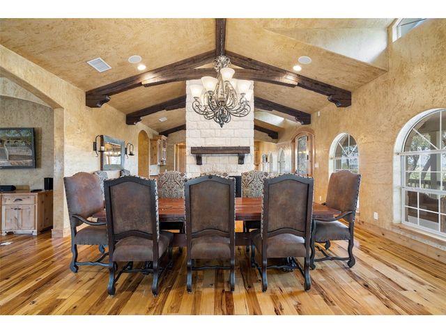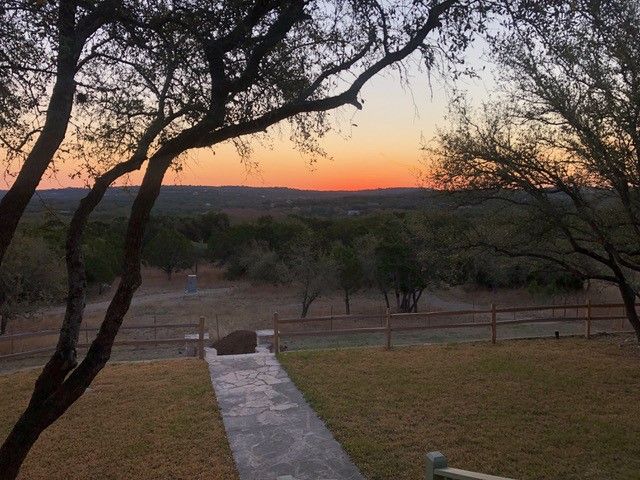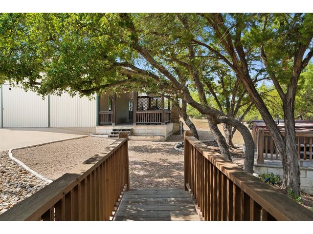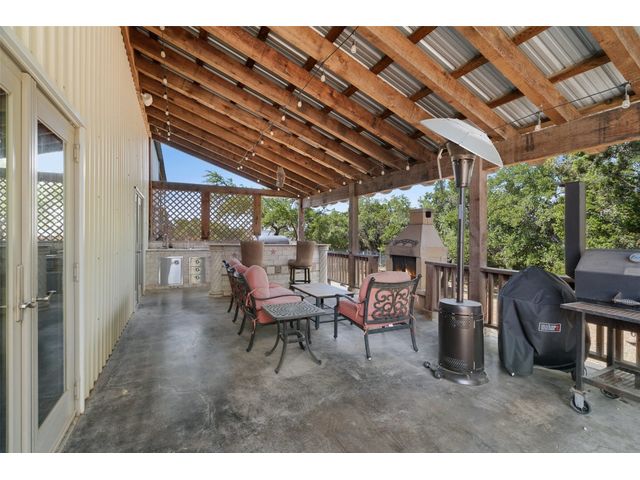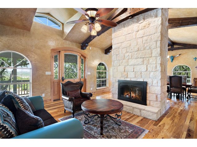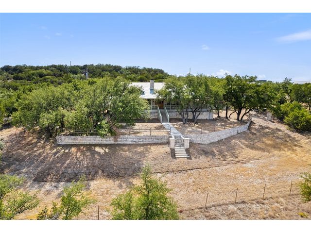 Hilltop estate on 14+ acres with western flare and stunning panoramic view of the Texas Hill Country. This home features an amazing wrap around porch which is the perfect setting for taking in the views, sunrises, and sunsets. Observe native wildlife as you sip a morning cup of coffee or that evening beverage of choice. Entering through the custom solid wood door with metal and glass accents, you will first notice the floor to ceiling, double sided, limestone fireplace that draws the eye towards a cathedral ceiling with designer rustic beams. Solid wood flooring throughout the home & primary suite, with carpeted guest rooms, and tiled baths & mud room. Open kitchen concept with seating area and dry bar with wine fridge & bottle storage. Just off the formal dining space is the media/den with spacious accommodation for theater seating. Outdoor living is the cherry on top with this property, offering multiple outdoor gathering areas, designated hot tub/spa foundation, tiny home structure with tons of options, and the massive metal building with attached outdoor kitchen and fireplace. The metal building houses an air conditioned full bath & flex room used as guest quarters, an enclosed garage area utilized as a party barn currently, and attached rear covered area with 50 amp power for RV, motorhome, or boat parking. Multiple private access points to the property from the 2 private roads flanking either side of the land, and the frame work set for a grand gated entrance off Pedernales Canyon Trail. LOW TAX's with AG exemption for active bee's. Lake Travis School District. Private ranch style living, yet close to urban amenities. Close to all the local Hill Country attractions, Lake Travis, wineries, distilleries, and several famous golf courses. Come experience this one for yourself!