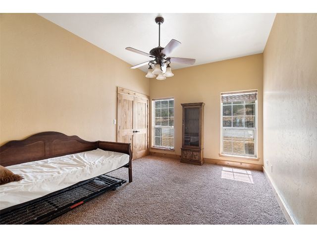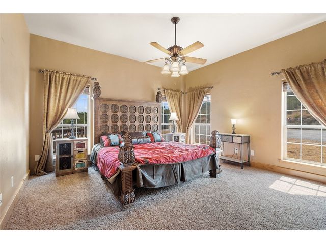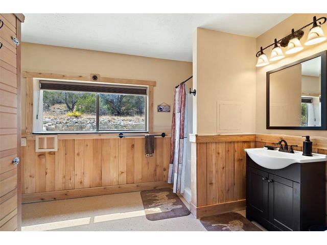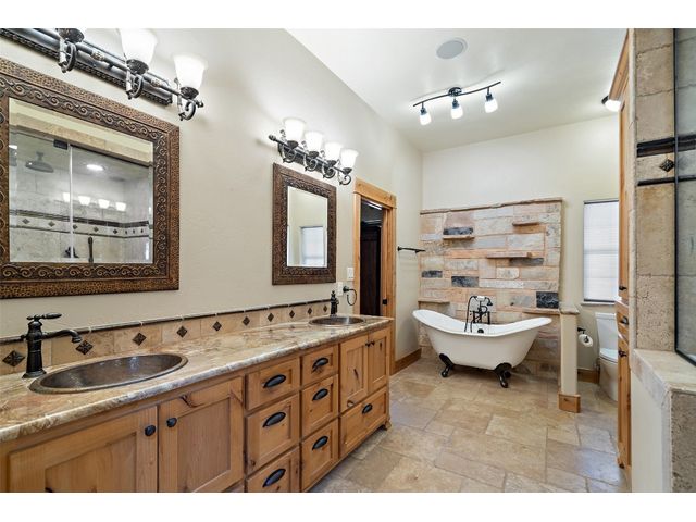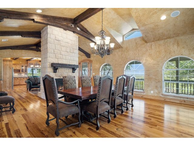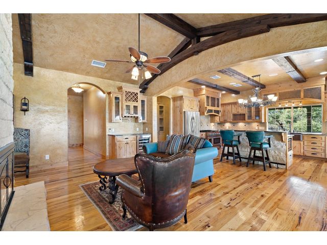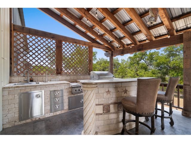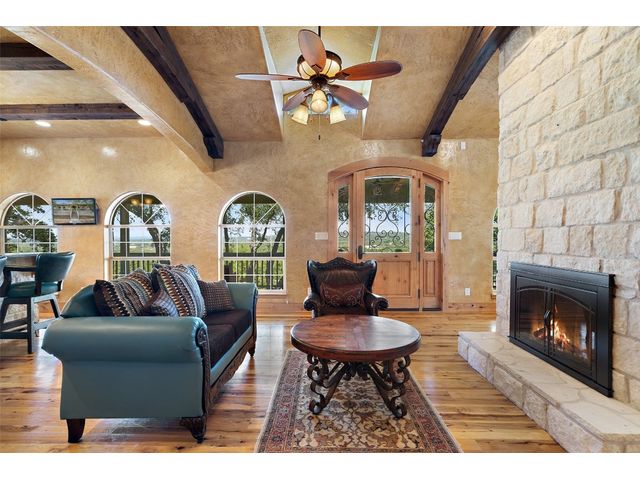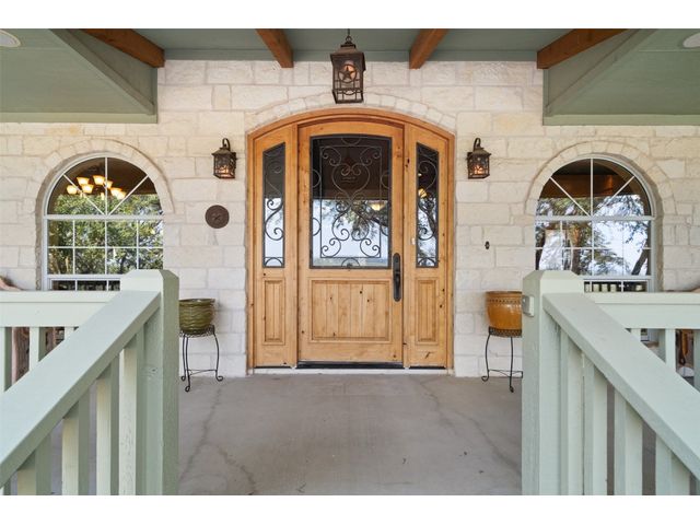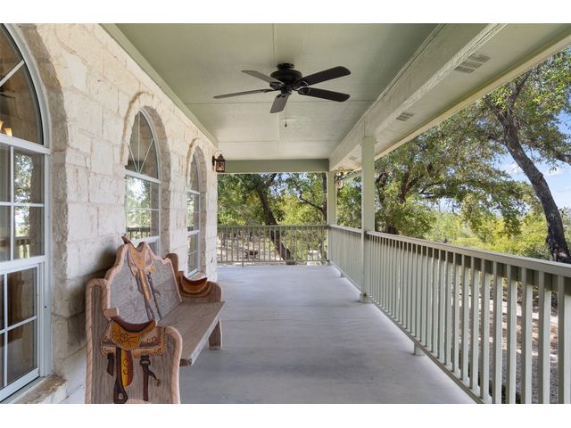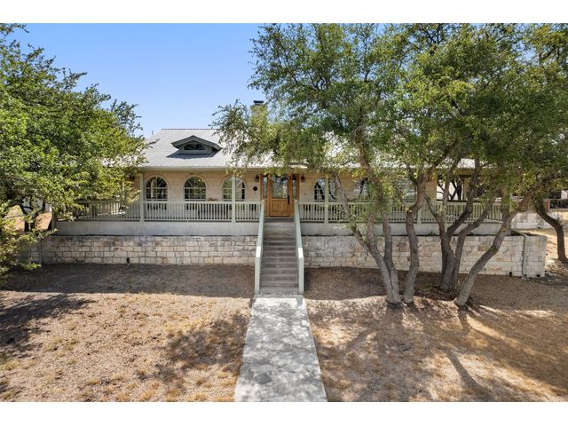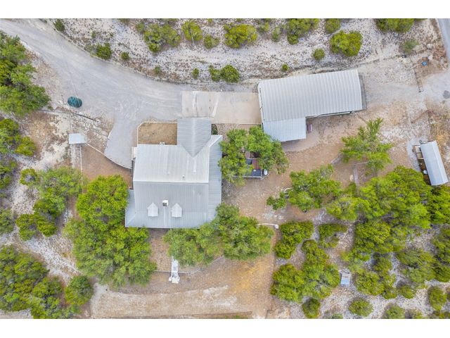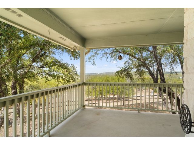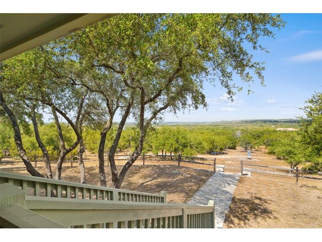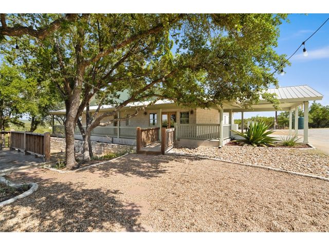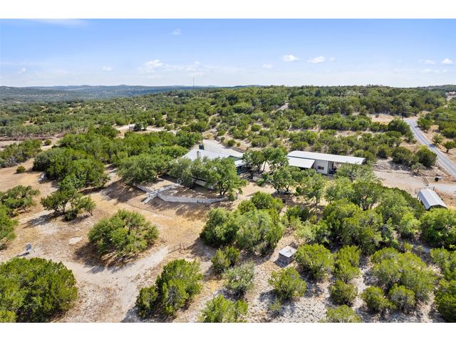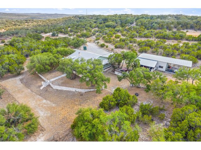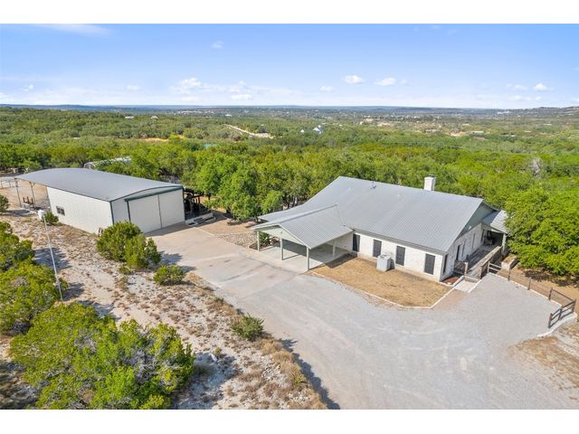 Hilltop estate on 14+ acres with western flare and stunning panoramic view of the Texas Hill Country. This home features an amazing wrap around porch which is the perfect setting for taking in the views, sunrises, and sunsets. Observe native wildlife as you sip a morning cup of coffee or that evening beverage of choice. Entering through the custom solid wood door with metal and glass accents, you will first notice the floor to ceiling, double sided, limestone fireplace that draws the eye towards a cathedral ceiling with designer rustic beams. Solid wood flooring throughout the home & primary suite, with carpeted guest rooms, and tiled baths & mud room. Open kitchen concept with seating area and dry bar with wine fridge & bottle storage. Just off the formal dining space is the media/den with spacious accommodation for theater seating. Outdoor living is the cherry on top with this property, offering multiple outdoor gathering areas, designated hot tub/spa foundation, tiny home structure with tons of options, and the massive metal building with attached outdoor kitchen and fireplace. The metal building houses an air conditioned full bath & flex room used as guest quarters, an enclosed garage area utilized as a party barn currently, and attached rear covered area with 50 amp power for RV, motorhome, or boat parking. Multiple private access points to the property from the 2 private roads flanking either side of the land, and the frame work set for a grand gated entrance off Pedernales Canyon Trail. LOW TAX's with AG exemption for active bee's. Lake Travis School District. Private ranch style living, yet close to urban amenities. Close to all the local Hill Country attractions, Lake Travis, wineries, distilleries, and several famous golf courses. Come experience this on e for yourself!