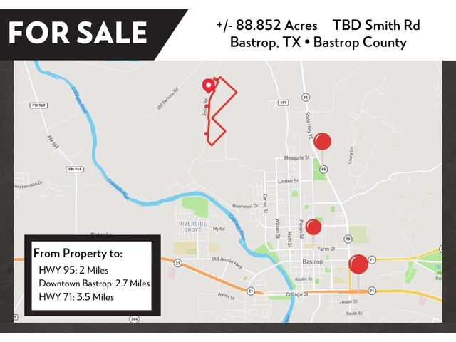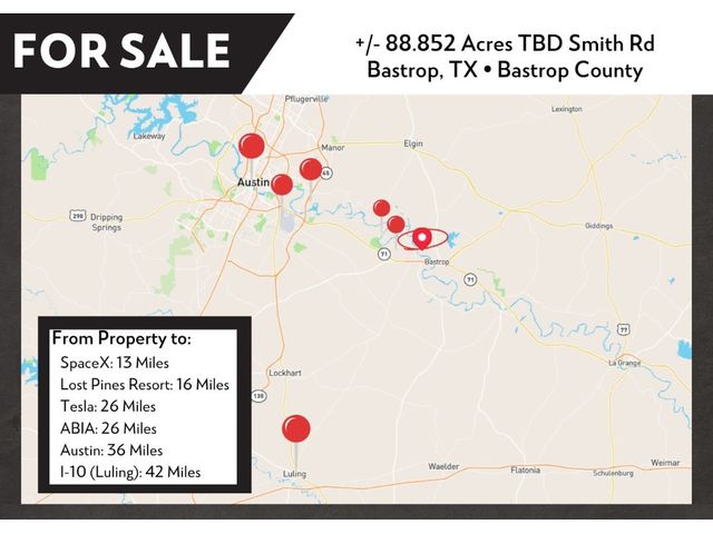 Transitional land opportunity consisting of +/- 88.852-acres lying within the Bastrop Statutory ETJ. This land is adjacent to Section 1 of the Woodrun Subdivision which was the Phase 1 of a deed restricted, residential development consisting of 44, 1-acre lots - all sold out quickly in 2019. This +/- 88.85 acres was originally the 2nd and 3rd phases of the same residential development, but is now offered as an opportunity for a developer to take over with a new set of plans for a much needed, residential community to fulfill the exponential growth occurring in Bastrop. This property lies off Smith Road with four (4) separate access points off this paved, county maintained road. Infrastructure includes a 6 inch water main line along Smith Road with fire hydrants serviced by AQUA Water. Current owner had previously reserved capacity for 62 water meters with AQUA Water for the development of this +/- 88.85 acres. Bluebonnet Electricity is also located along Smith Road with capacity for future development. Utility availability and current capacity to be independently verified by buyer. There is opportunity here for new manufactured homes or a site built home community. Located minutes from the City of Bastrop, Approximately 20 miles to ABIA and Downtown Austin and an even easier commute to The Boring Company, Space X, The Hyatt Lost Pines Resort & Spa and Tesla. Bastrop County features 2 State Parks and 3 golf courses.