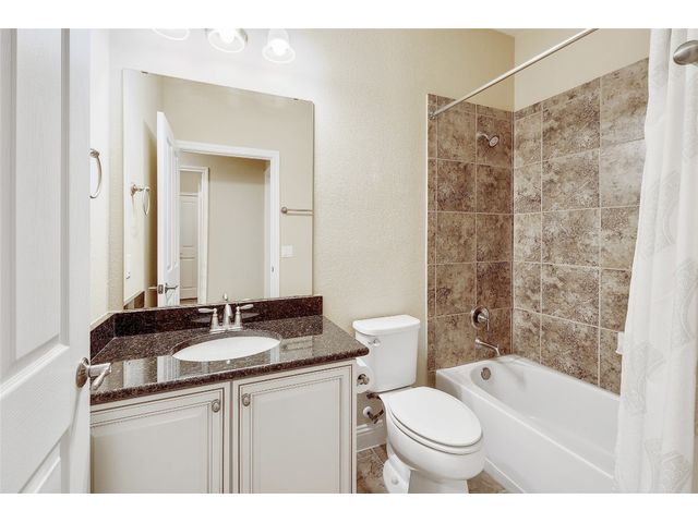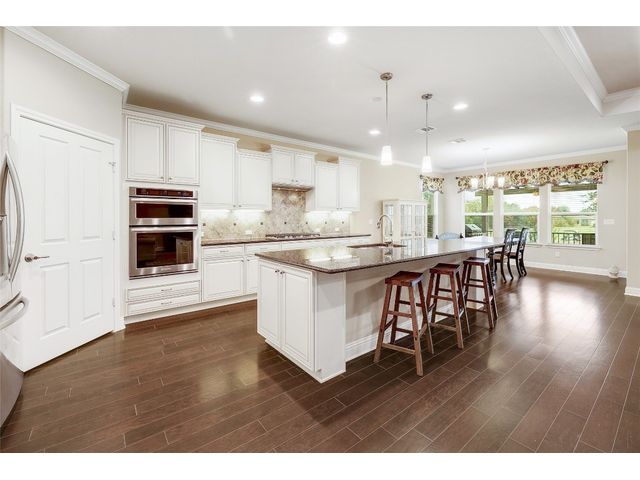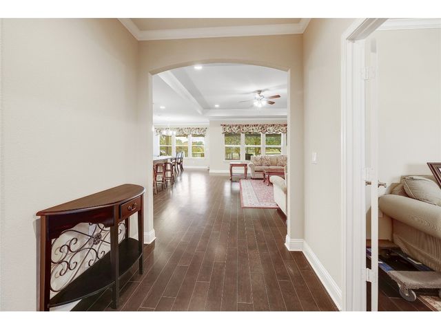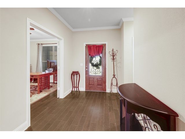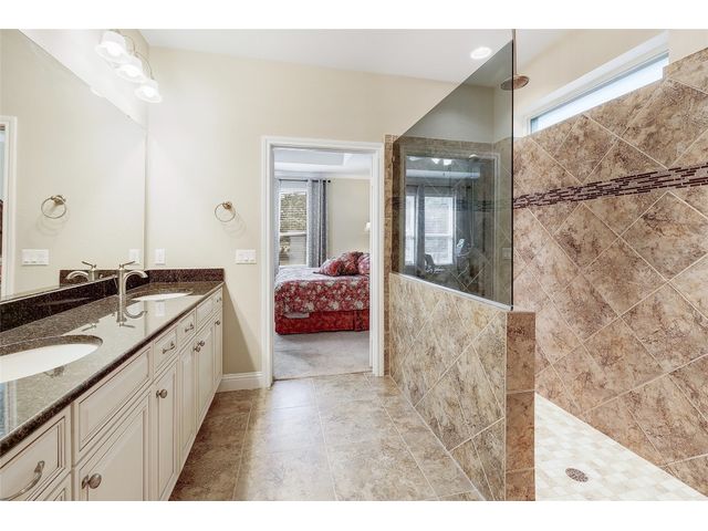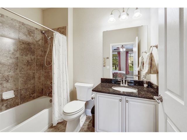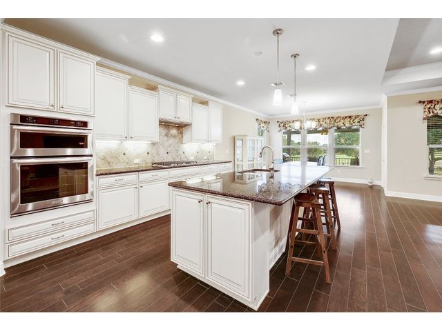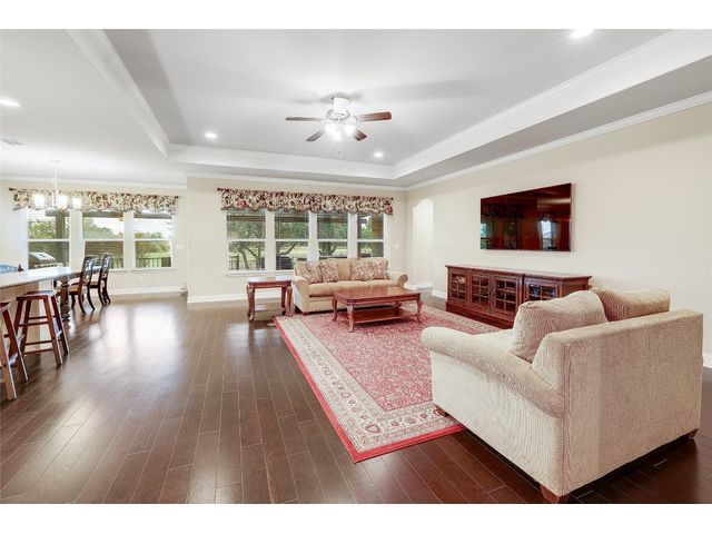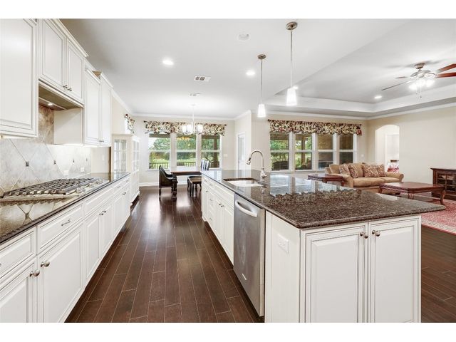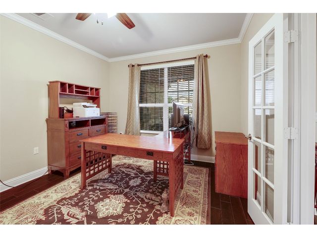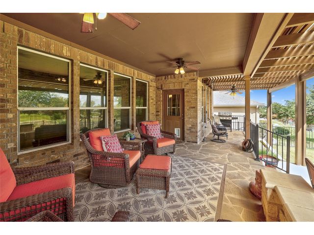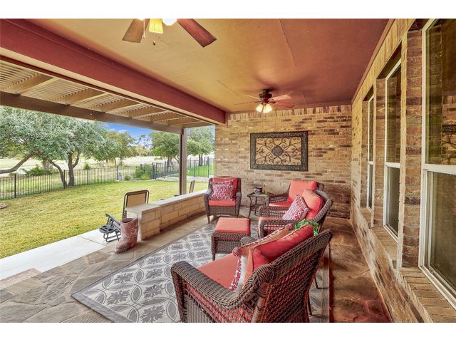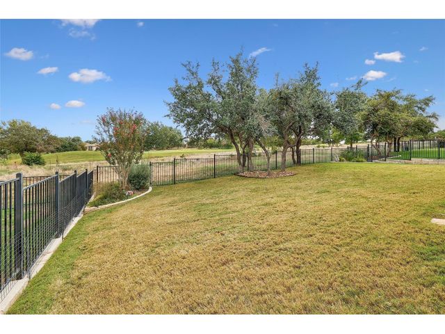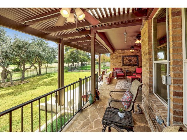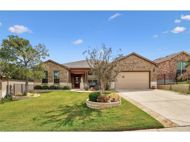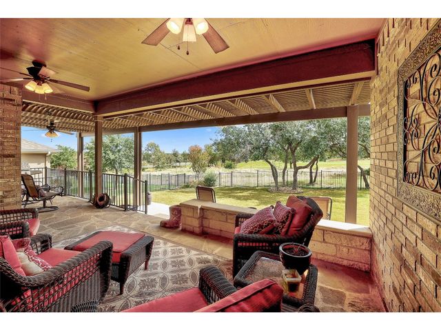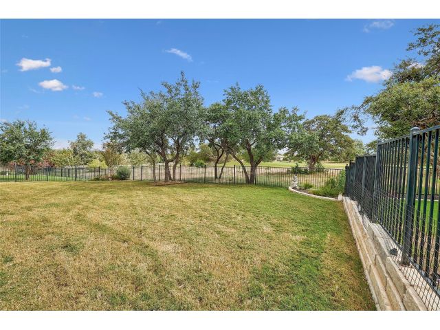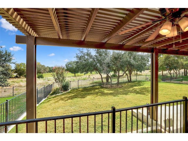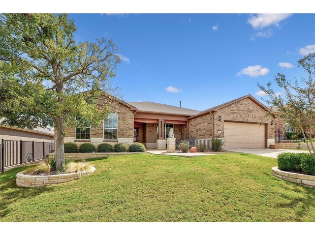 Don't miss on this well maintained house in Sun City that backs to the green of the par 3 #16 hole at Cowan Creek course. The house faces west providing afternoon shade on the back patio and there's plenty of native area behind the fence as a buffer from the golf course or errant shots. Very popular single story Pulte Dunwoody Way floorplan has 3 beds, 3 full baths, office/study & all sides brick/stone. One of the guest bedrooms has on-suite bathroom and the 3rd bedroom has a full bathroom in close proximity. Primary bathroom has walk in shower, double vanity & large walk in closet. Features include open floor plan, wood floors, granite counters, antique white kitchen cabinets, kitchen island, tray ceilings, crown molding, recessed lighting & large laundry room with built in cabinets/counters. Both patios were extended with flagstone, professionally landscaped with excellent curb appeal.