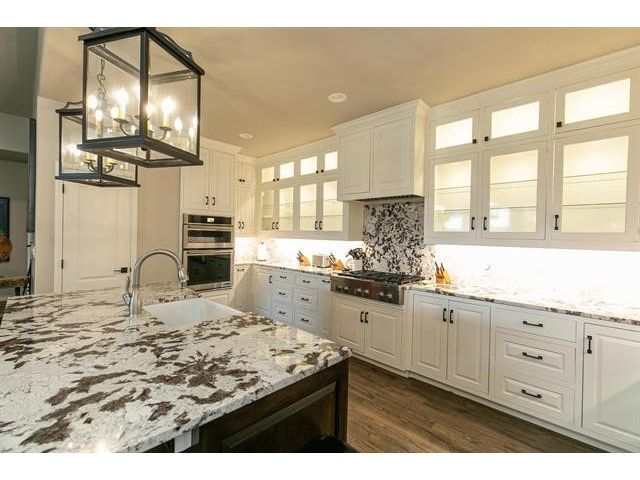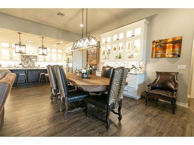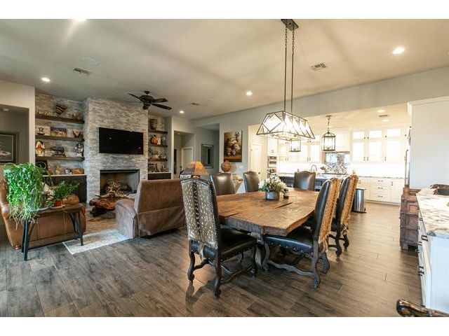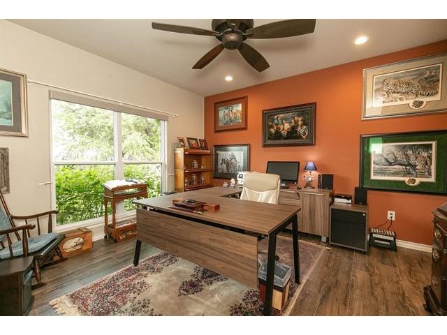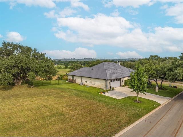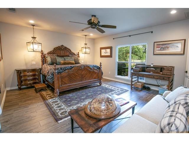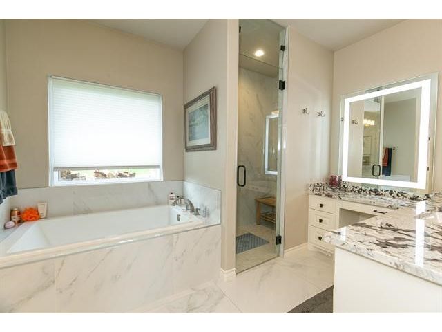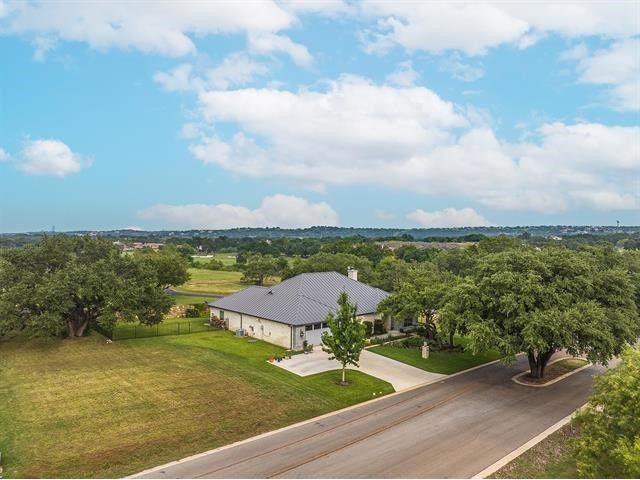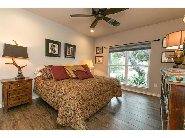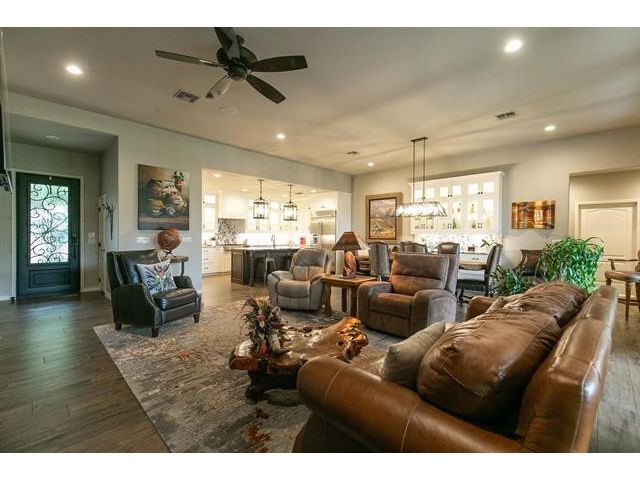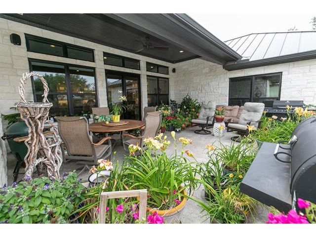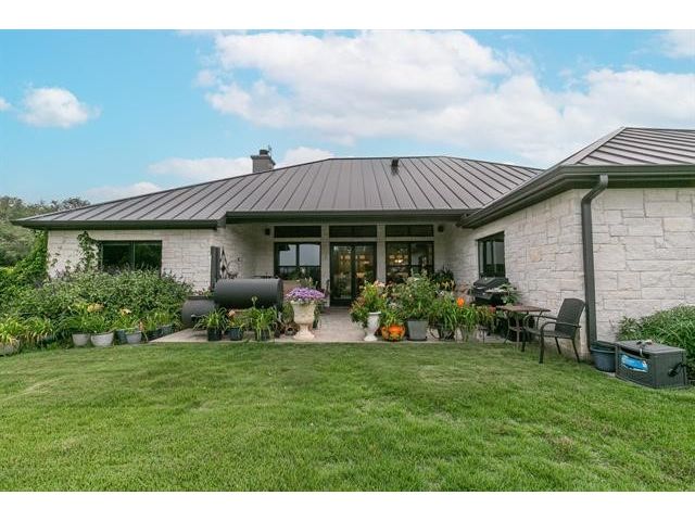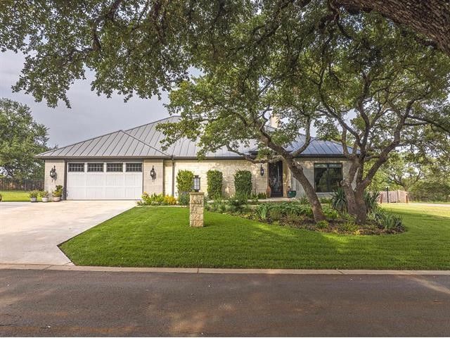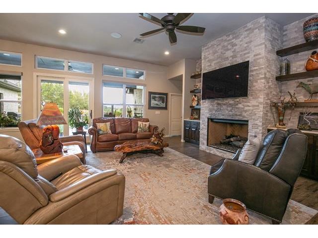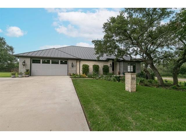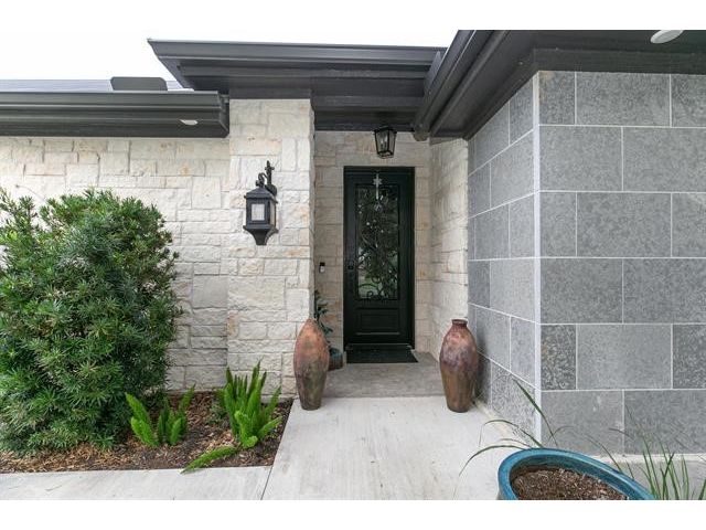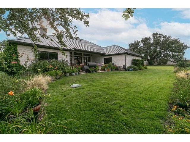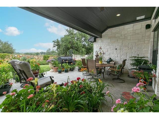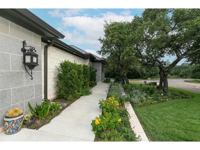 This spectacular newer construction single story home is nestled among breathtaking large oak trees situated on a private corner lot, with2 additional lots to ensure the privacy you you are looking for. The East facing back porch backs up to the exclusive Escondido Golfclub. The modern exterior is adorned with Piedra Blue and White Limestone quarried right here in Texas! High end light fixtures were custom made for this home with Onyx stone. Exquisite Brazilian White granite is found throughout the kitchen and Primary owners' suite, and the owners suite bathroom features marble floors & shower. This home boasts a Lutron Lighting system, a 24k whole house Generac Generator, Wi-Fi Locks on the doors and Wi-Fi thermostats. The chef will love the Jenn Air commercial grade gas stovetop, soft close doors and cabinets, and large island open to the dining and living area, which offers gorgeous views over the hand stacked Rockwall & the 18th hole of Escondido golf course. The front porch offers views of #16 Apple Rock golf course. Recent owner upgrades include an outdoor lighting system with outdoor speakers costing over twelve thousand dollars. On those warm summer afternoons, you will definitely appreciate the electric Hunter Douglas shades. All bedrooms have walk in closets. The irrigation system keeps the large backyard and all the gorgeous landscaping healthy and thriving. If you are looking for a quality, newer, 1 story modern with an abundance of upgrades, this home is what you have been looking for.