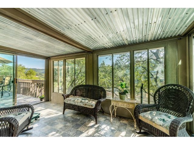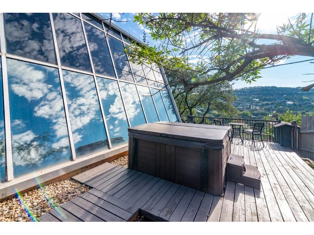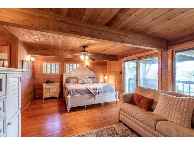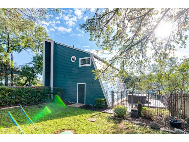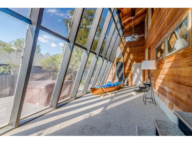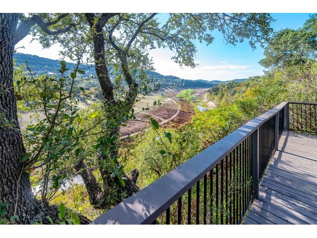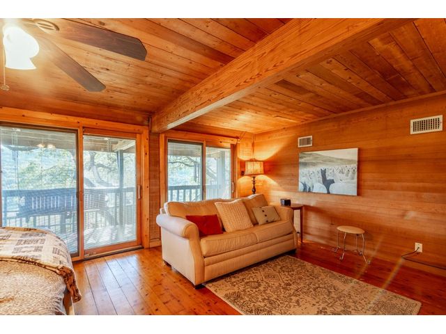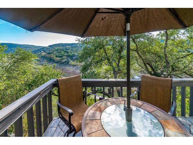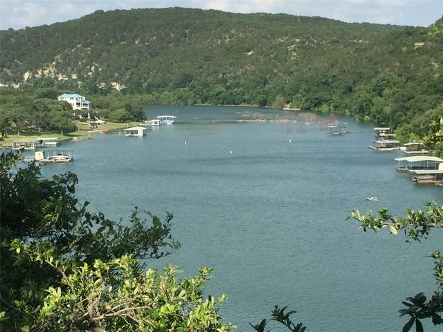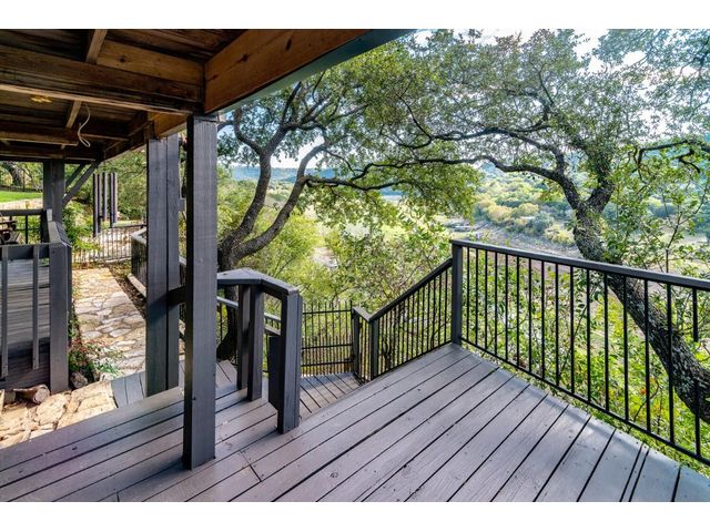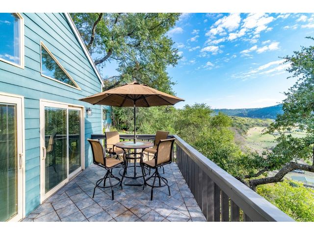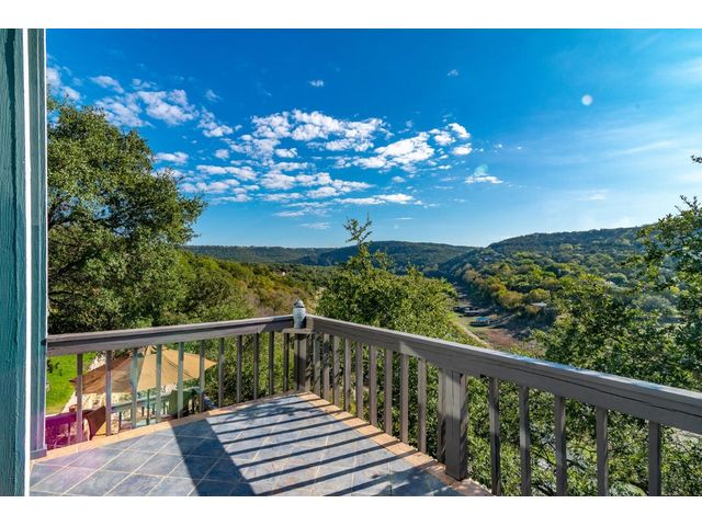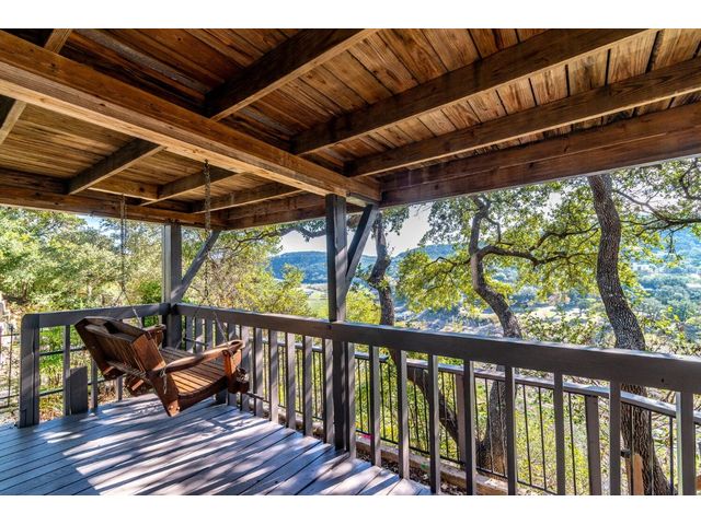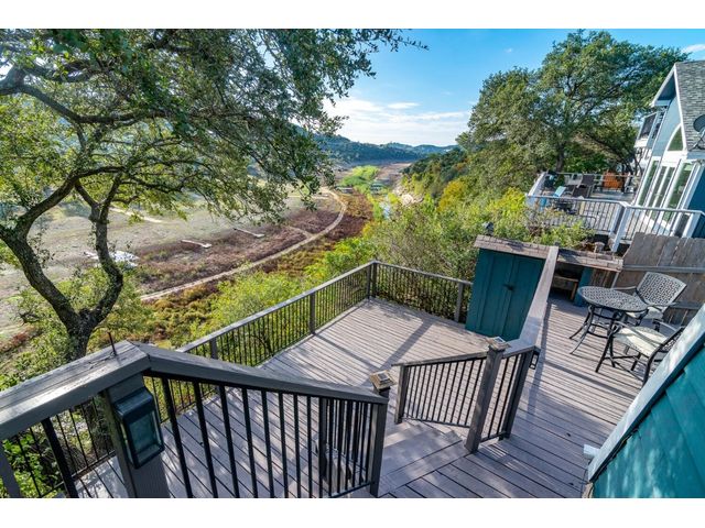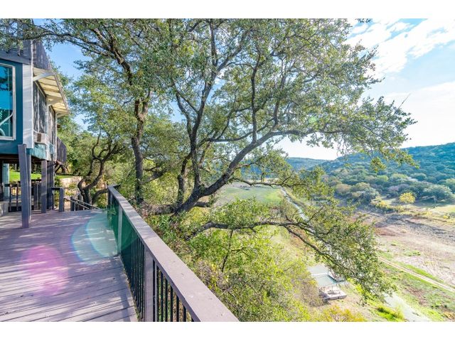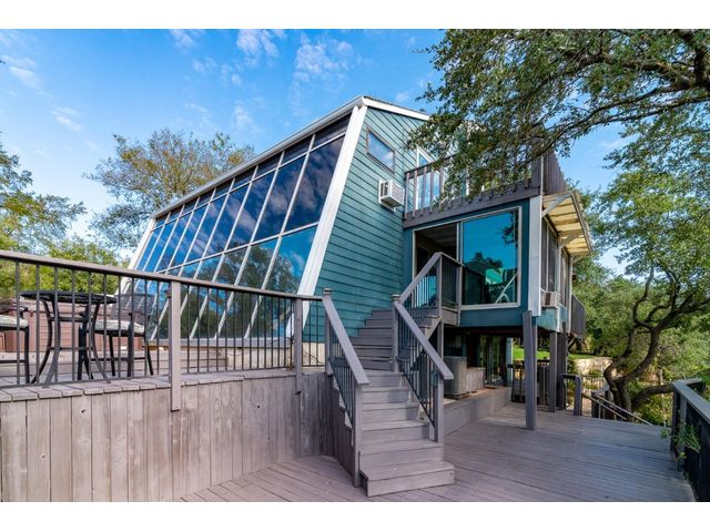 Nestled in the picturesque Lake Sandy neighborhood, this furnished lakefront home offers breathtaking sunrises and tranquil sunsets. The uniquely designed house boasts an interior framed with exquisite woodwork and high vaulted ceilings, creating an inviting ambiance. Step into an open floor-plan updated kitchen featuring granite countertops, recessed lighting, SS Appliances, glass-faced cabinets, and a spacious pantry. The family room presents views, a floor-to-ceiling fireplace, soaring vaulted ceilings, and elegant tile flooring, enhancing the sense of space and comfort. The upper level hosts the primary bedroom scenic views, a cozy fireplace, beamed ceilings, and a private balcony to soak in the natural beauty. The primary spa with granite counters, a double vanity, a garden tub, a separate walk-in shower, and ample closet space. A second living or office space on the upper level provides flexibility and convenience. The secondary primary suite features a well-appointed full bath, a walk-in closet, and a private porch with a swing, creating a serene and private retreat. The main floor hosts a convenient laundry room while a sunroom on the side of the house serves as great storage for kayaks, canoes, bikes, or other recreational gear. Enjoy the added amenities with a sauna complementing the hot tub that conveys with the property. Ample on-site parking, including space for boats, RVs (equipped with a 50-amp plug), and other recreational vehicles. The property features a detached carport, a separate double-gated entrance, a fenced backyard, and direct lake access via a staircase, complete with a boat dock for when the water level meets the dock. Decks and a sunroom at the rear of the property serve as a gateway to your very own private retreat. Located conveniently close to schools, parks, shopping, dining options, and only 30 miles from downtown ATX, this home offers a perfect blend of serenity and accessibility for a quintessential lakeside lifestyle.
