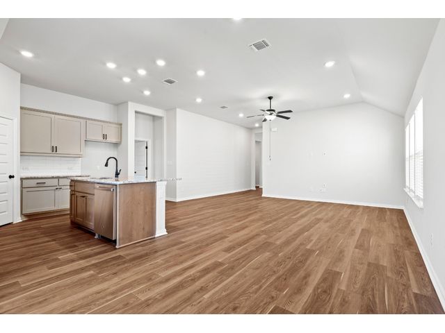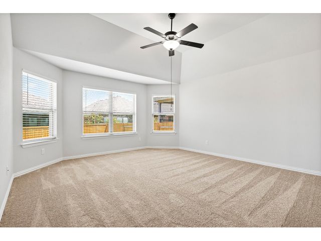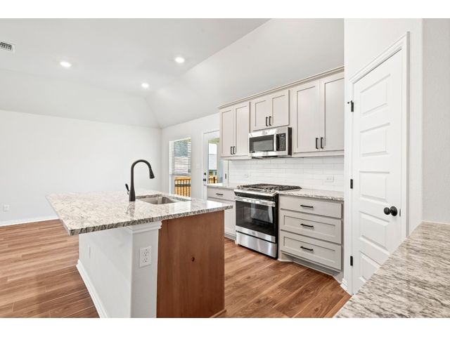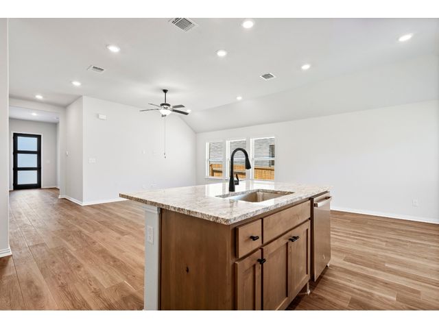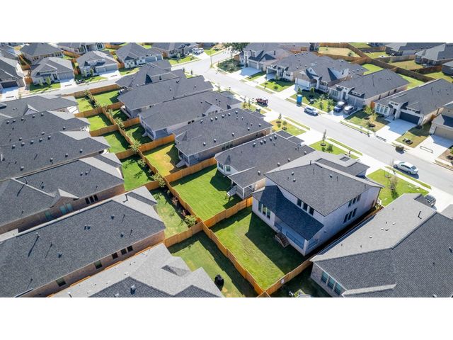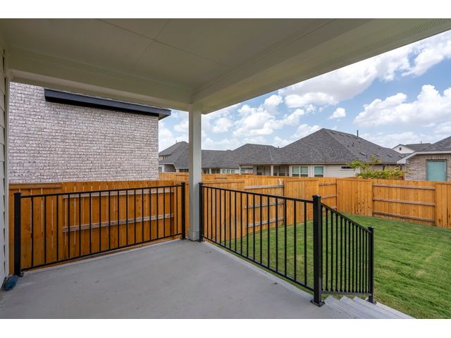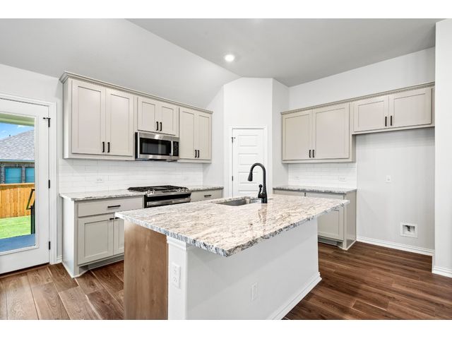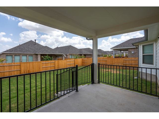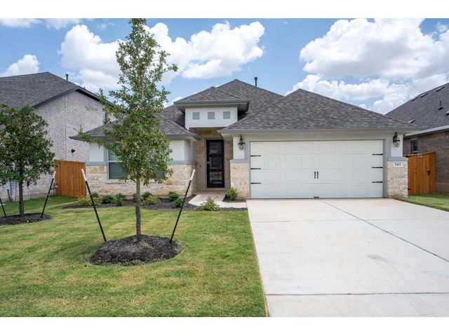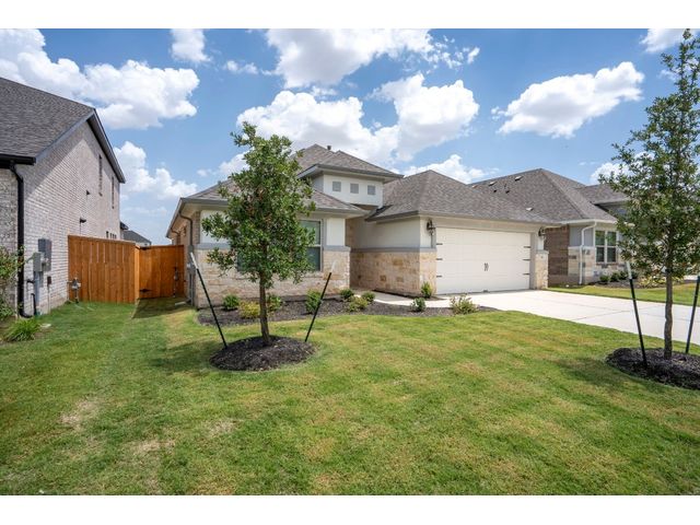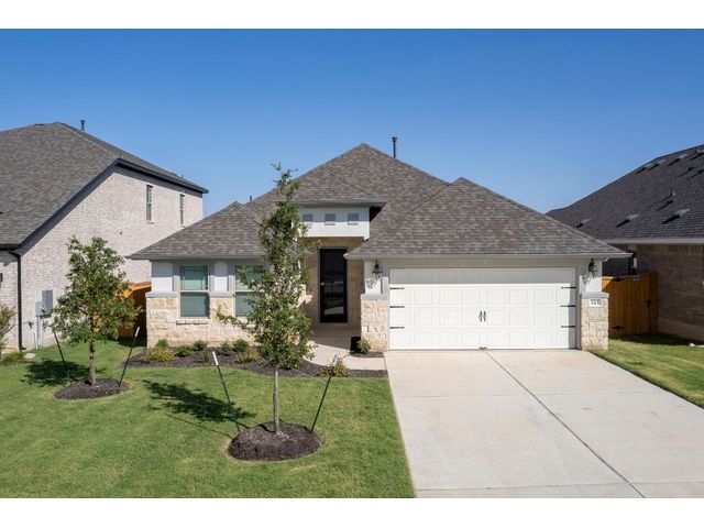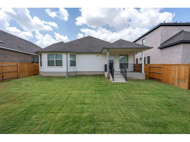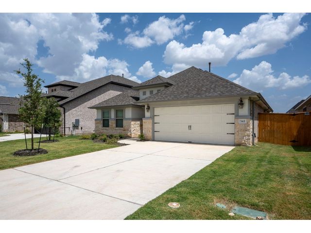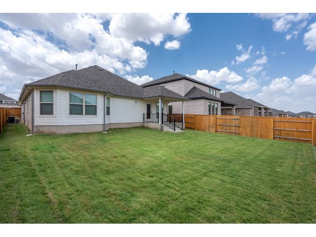Brand new home in 6 Creeks - 4 bedrooms, two baths. Open floorplan. Upgrades including: Luxury vinyl wood look plank flooring in main and halls, bay windows in primary, extended and covered patio, tile, cabinets and contemporary front door! One story, two car garage. Spacious kitchen featuring level 3 granite counters with stainless appliances, center island and pantry. Main suite features bay windows, large shower, walk in closet, potty closet, large linen closet and double vanity. Interior lot. Covered patio with wrought iron railing, full automatic sprinklers and water softener loop. Hays CIDS Schools