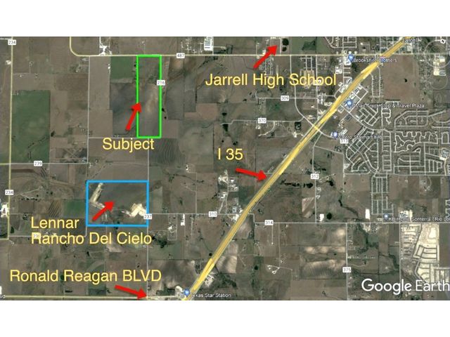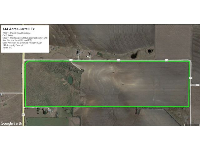 A REMARKABLE OPPORTUNITY FOR DEVELOPMENT WITH 144 ACRES LOCATED JUST OUTSIDE THE JARRELL CITY LIMITS AND ETJ. THIS PROPERTY HAS 7200+- FEET OF PAVED ROAD FRONTAGE BORDERING 3 SIDES AND 5200+- FEET OF WASTEWATER/UTILITY EASEMENT ALONG COUNTY ROAD 216 TO FM 487. GREAT TOPOGRAPHY. EASY ACCESS TO I-35 AND RONALD REAGAN BLVD. APPROXIMATLEY 15 MILES FROM GEORGETOWN, 23 MILES TO ROUND ROCK, AND 42 MILES FROM THE HEART OF AUSTIN. LESS THAN 1.4 MILES FROM JARRELL HIGH SCHOOL AND JUST A FEW MINUTES FROM LOCAL SHOPPING. 142 ACRES ARE CURRENTLY AG EXEMPT. AG LEASE IN PLACE. SELLER WILL NOT BE PLACING ANY RESTRICTIONS ON THE PROPERTY. JARRELL ISD.