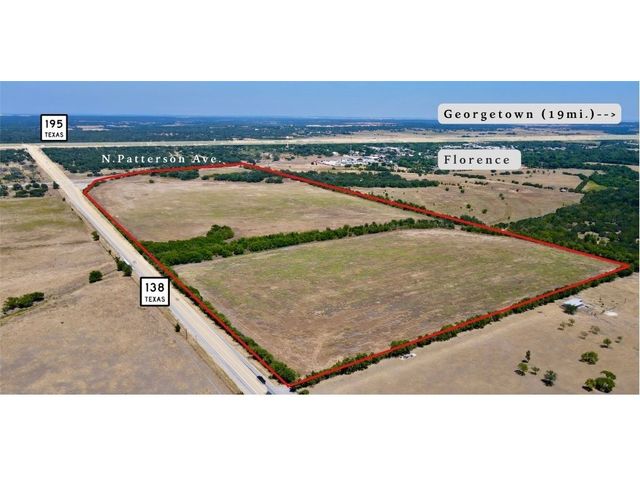 Located in Florence ETJ, outside city limits, and in NW Williamson County, one of the fastest growing counties in Texas. Part of the “Texas Triangle,” also known as the “Texaplex,” a region that is connected by the state’s five largest cities known for it’s economic fortitude, highly educated workforce, optimized trade routes and cultural ties. It's an easy commute to booming economic centers: Georgetown (19), Liberty Hill (20), Leander (25), Hutto/Samsung Megasite (29), Austin/Domain (38), and Downtown Austin (46). Access and location qualify the site as a competitively priced asset with the potential to capitalize on present and future supply chain needs and the ensuing economic expansion driven by growth in technological and logistics industries in surrounding submarkets. The property is positioned at the hard SW corner of a four-way intersection boasting approximately 3540’ of total road frontage on two sides (±2300’ on SH-138 and ±1240’ on N. Patterson) and it is only 0.5mi to the on/off ramp of the busy Highway 195 trade route (24,360 AADT). Williamson County’s long term transportation plan (Corridor J) calls for an expansion of SH-138 from SH-183 all the way to IH-35 in Jarrell. The land is located within the Georgetown Municipal Water CCN with lines spanning the length of the North and East boundaries - a 12” line along SH-138 and an 8” line along N. Patterson. Georgetown’s Capital Improvement Plan projects an expansion to the SH-138 12” to become a 16” line with work beginning 2025. There is also an older well on site. There is a city wastewater line only 0.25miles to the south, however, being in the ETJ, there is presently no public WW service provided to the site. PEC electric lines also run the length of the road frontage with lines and a power meter on site. Buyer to verify municipal regulations pertaining to annexation into city limits to secure WW services as well as overall utility capacity and location as it pertains to specific development needs.