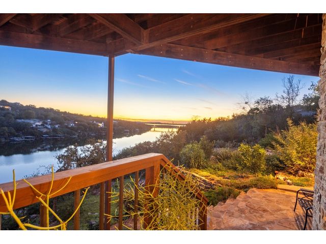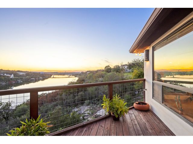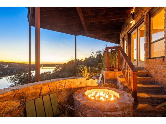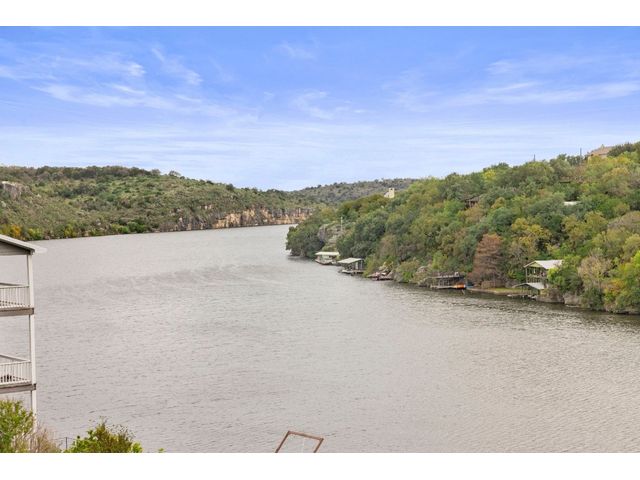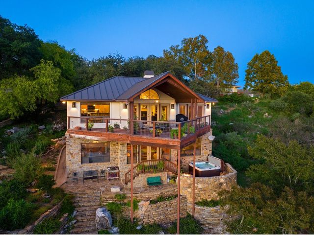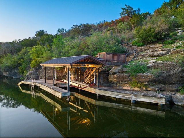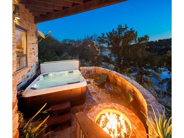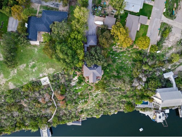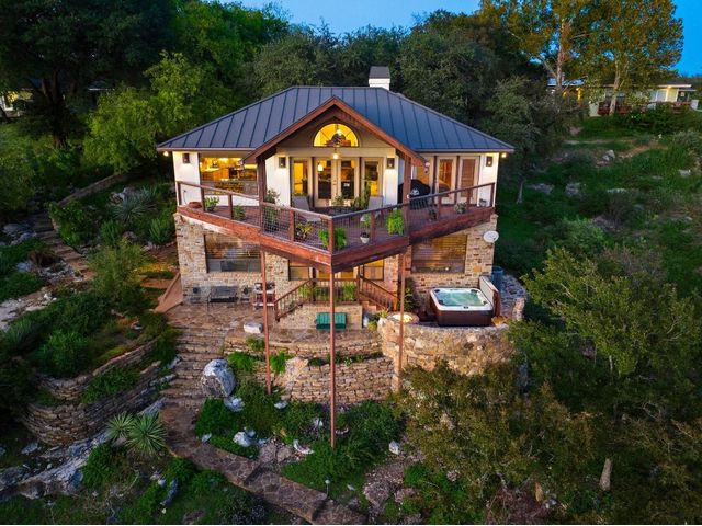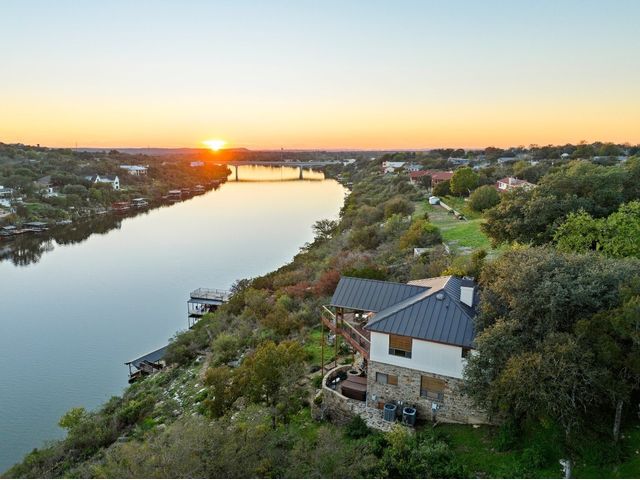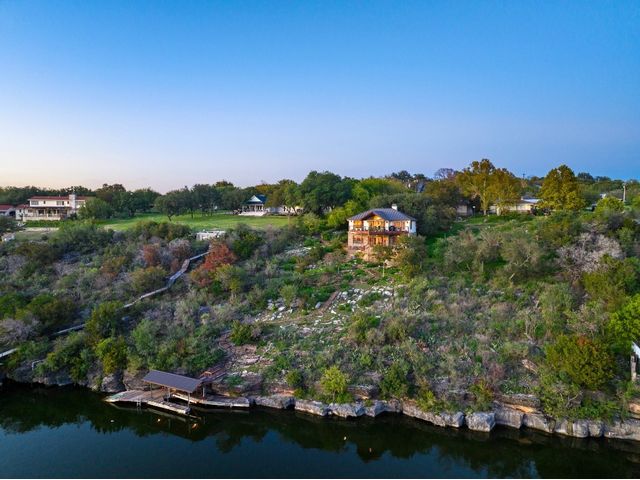 Enjoy the sunrise and sunsets in this 4 bedroom/2.5 bathroom custom built home with dual living spaces to host the entire family! Panoramic views provide a front-row seat to the mesmerizing beauty of Lake Marble Falls, showcasing the Marble Falls bridge to the west and privately owned cliffs to the east. The top floor entrance brings you to an open-concept and spacious living room with a vaulted ceiling, dining area, breakfast bar, and kitchen featuring granite countertops and hardwood floors. The primary bedroom is just off of the living room and features an en suite bathroom for added privacy and convenience, and two closets. From the main living area, step out onto the 240 sq. foot balcony overlooking the water. You will also find the half-bathroom on the main level. The lower level is dedicated to entertainment, featuring a large open room, with a wet bar, icemaker, two bedrooms with closets, and a flex room/office/4th bedroom. The downstairs patio, complete with a hot tub, gas fire pit, and stone privacy wall, provides an additional outdoor retreat and access to the lake and outdoor amenities. Mature trees provide added privacy and shade. Swim, fish, or boat directly from your property. The driveway is complete with abundant parking spaces, a two car-carport, and two-car garage with its own view of the lake - which can be converted to additional living space. The property includes a dog run and multiple areas for expansion. The possibilities are endless with this investment opportunity! Short-term rental is allowed. Shopping and dining districts are only a few blocks away!