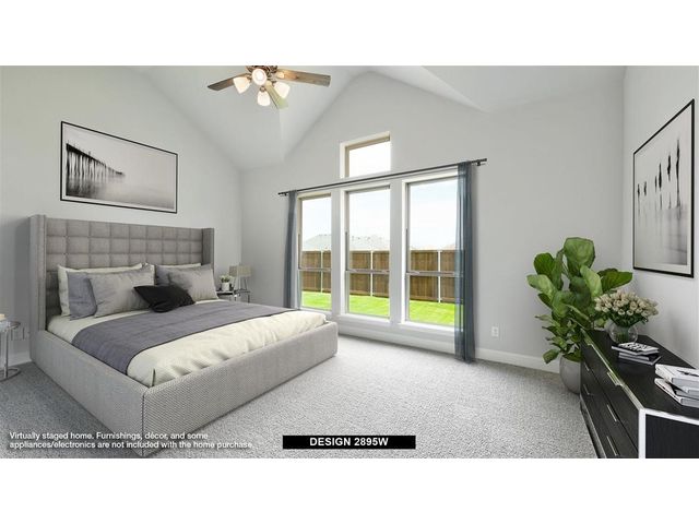 Extended entry leads to open family room, kitchen and dining area. Family room features wall of windows. Kitchen hosts island with built-in seating space. Game room with French doors just off family room. Secluded primary suite. Dual vanities, garden tub, separate glass-enclosed shower and two large walk-in closets in primary bath. A Hollywood bath, high ceilings, large windows and abundant closet space add to this one-story design. Extended covered backyard patio. Mud room off three-car garage.