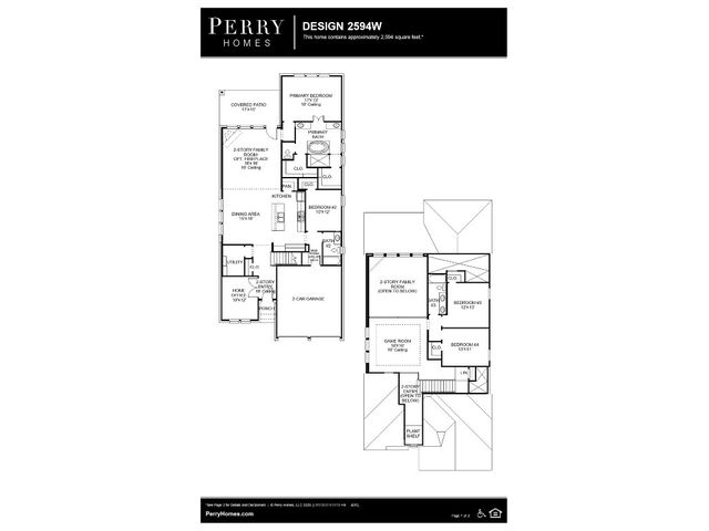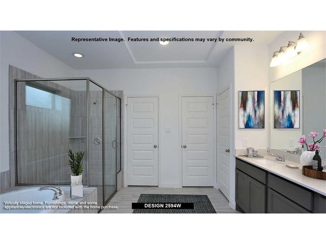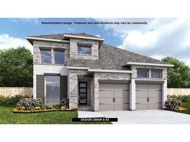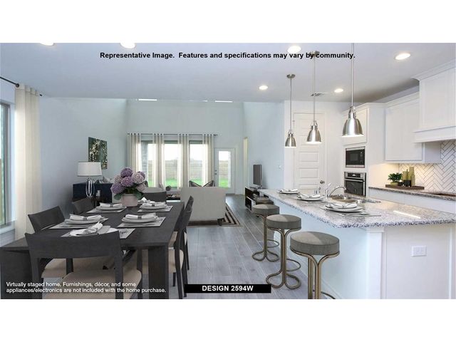 Home office with French doors set at two-story entry. Dining area opens to kitchen and adjacent two-story family room. Kitchen features walk-in pantry and generous island with built-in seating space. Family room features wall of windows. First-floor primary suite includes primary bath with dual vanity, garden tub, separate glass-enclosed shower and two walk-in closets. An additional bedroom is downstairs. A game room and two secondary bedrooms are upstairs. Covered backyard patio and 7-zone sprinkler system. Mud room off two-car garage.