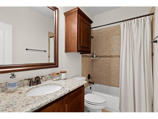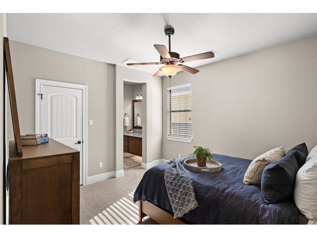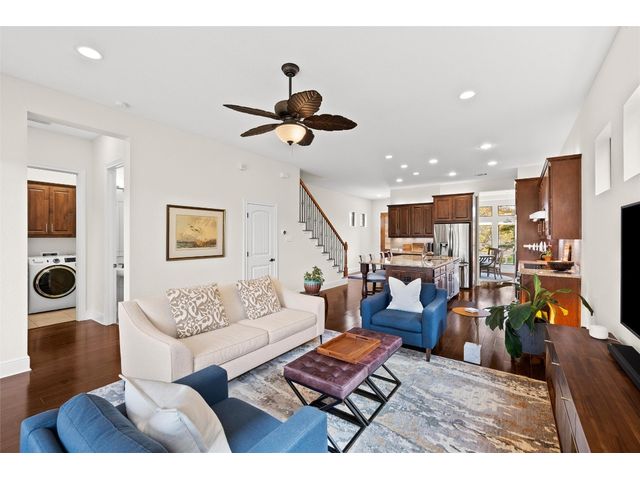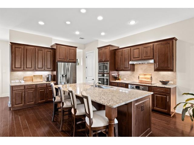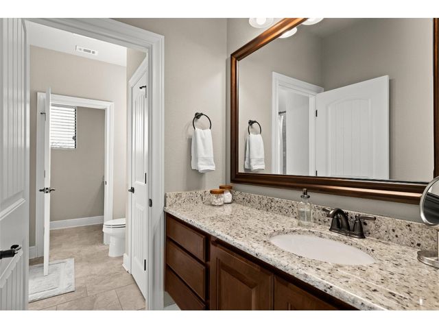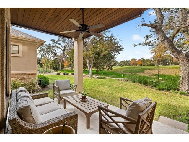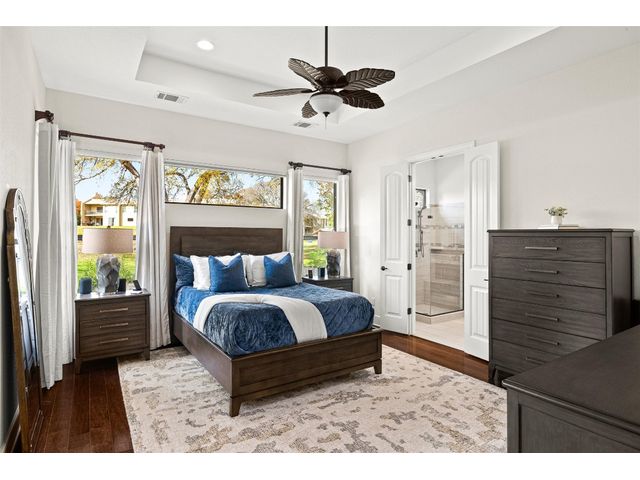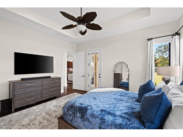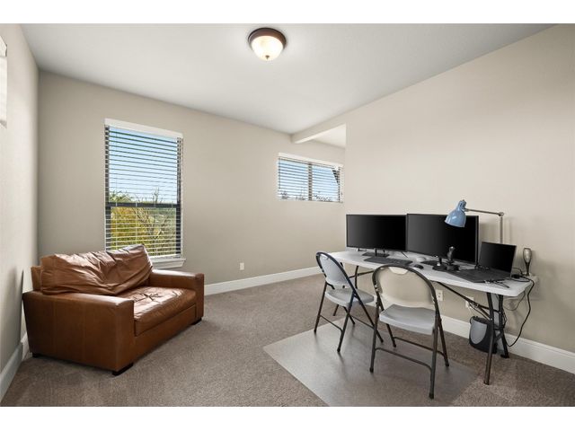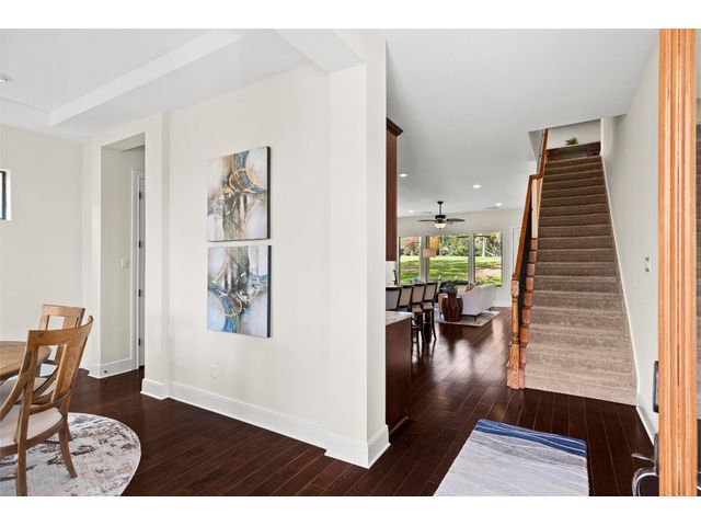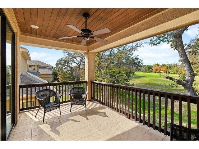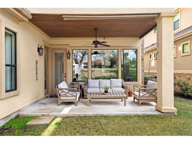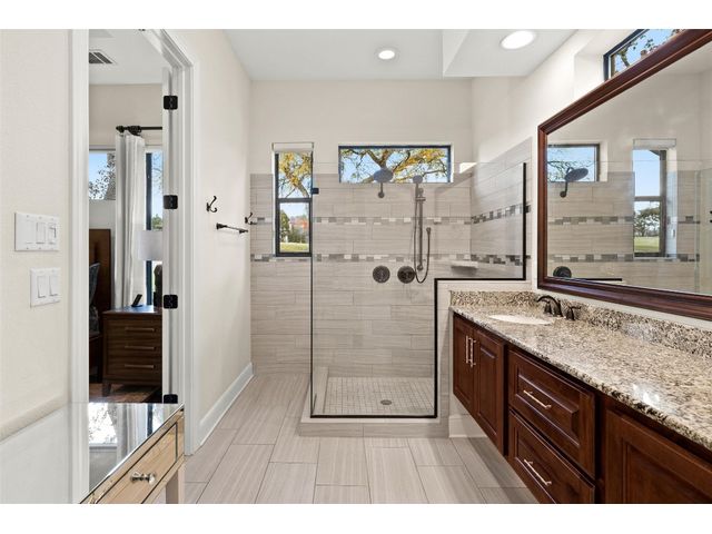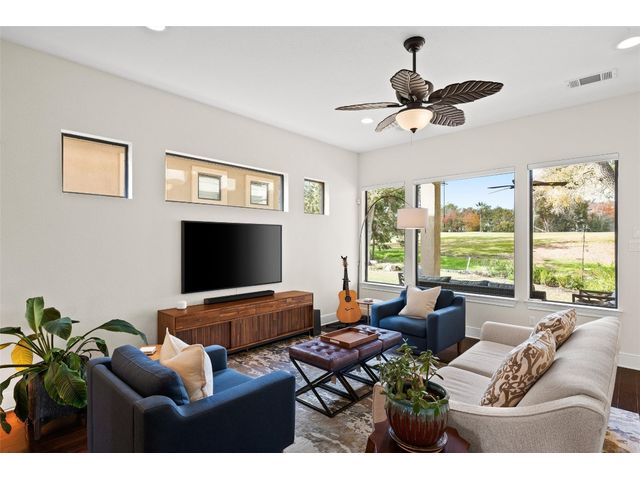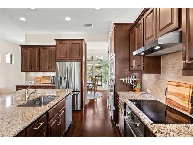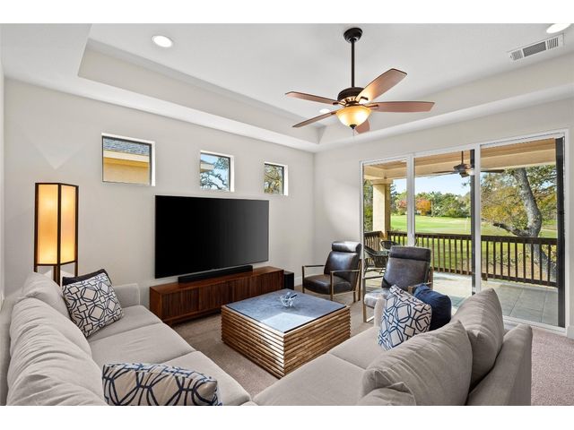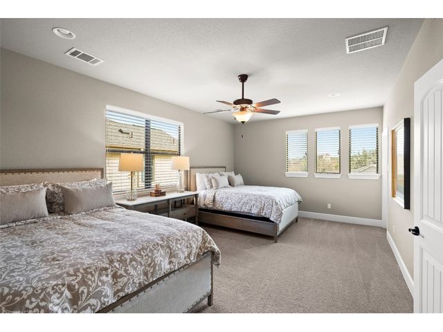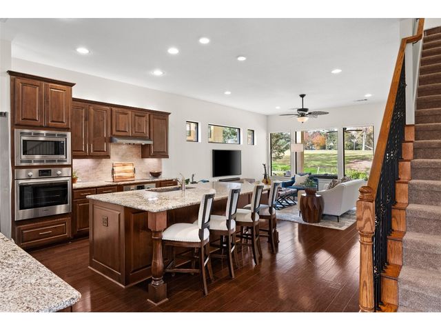 Welcome to luxury living with a picturesque view! Nestled in a private gated community on a cul-de-sac, this stunning two-story home has breathtaking vistas of the verdant golf course from nearly every angle. The main level features a serene primary suite, providing easy access to the downstairs patio. Immaculately designed with Bosch appliances, stainless steel finishes, and granite countertops throughout, the kitchen is a culinary haven. Picture windows flood the space with natural light, accentuating the hardwood flooring downstairs. The relaxing primary bath's huge walk-in shower is part of a custom-designed oasis featuring elevated cabinetry and a thoughtfully crafted built-in closet system. Entertain in the private dining area or unwind in the expansive living space with modern height baseboards throughout and extensive storage solutions. Upstairs reveals a spacious flexroom with a built-in desk, offering versatile options for work or play with access to an additional private patio with golf course views. Three additional bedrooms, each with walk-in closets and ceiling fans, provide ample comfort and convenience. With HOA maintained landscaping, this lock-and-leave residence allows for hassle-free living and more time to enjoy the surrounding beauty. Extras like garage shelving and the convenience of modern amenities add to the appeal of this meticulously maintained home. Immerse yourself in luxury, elegance, and the serenity of golf course living in this impeccable home.
