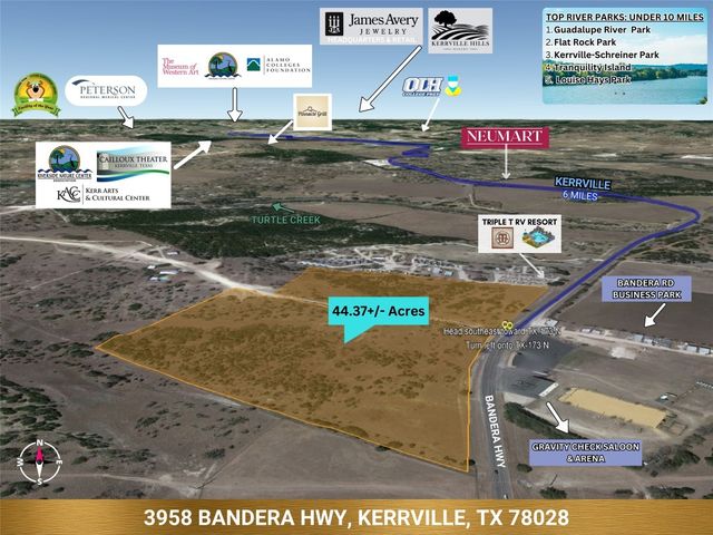 Exceptional ~45 Acres: A rare gem located just 6 miles from downtown Kerrville, this property boasts ~1900' of highway frontage, presenting an unparalleled opportunity for visibility and accessibility. Situated at the entrance of the gated Great Sky Ranch community, the land enjoys a prime location across the highway from the thriving Gravity Saloon & Arena and the Bandera Road Business Park. As a gateway to Kerrville, a sought-after destination and retirement area often hailed as the 'Capital of the Texas Hill Country,' this expansive property is uniquely positioned for dual-purpose use. It offers the perfect canvas for a picturesque ranch retreat, while its strategic location makes it an ideal investment for those looking to tap into the growing commercial landscape. Immerse yourself in the scenic beauty of the Texas Hill Country while capitalizing on the potential of this versatile property, perfectly poised at the crossroads of opportunity & growth in Kerrville. Kerrville hosts global attractions like the Texas State Arts and Crafts Fair and the Kerrville Folk Festival, while its riverfront parks enchant both residents and visitors. The area sets the perfect backdrop for this exceptional property. KerrEDC Case Study: Kerrville: "A Model of Collaborative Resilience". BUSINESS VIEW MAGAZINE calls Kerrville: "A Gem in the Heart of Texas Hill Country". ~1900ft Hwy Frontage. Buyer may request removal from Great Sky Ranch HOA & CC&Rs, providing vast use opportunity. Subdivide Options. See other listings.