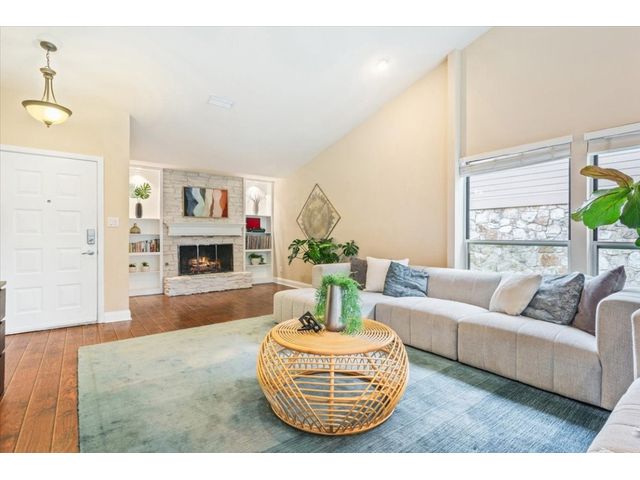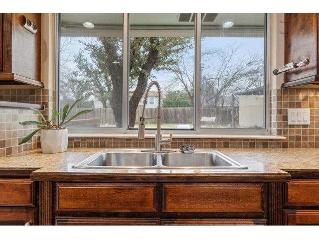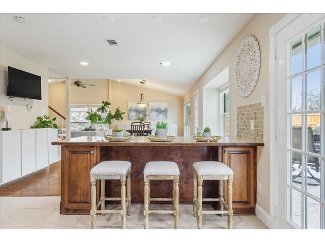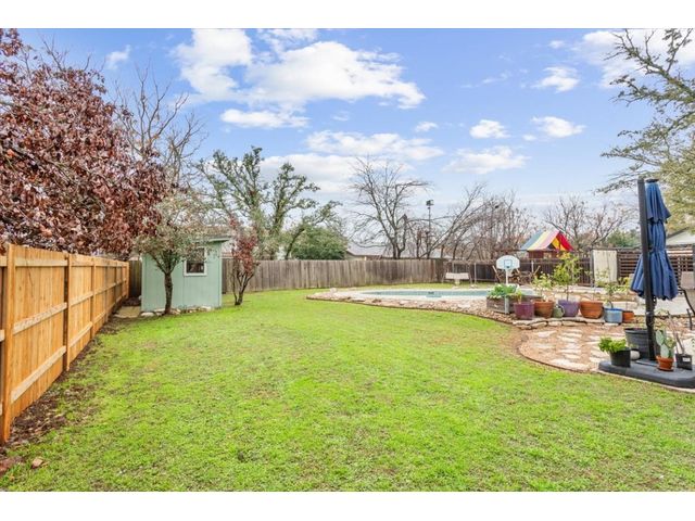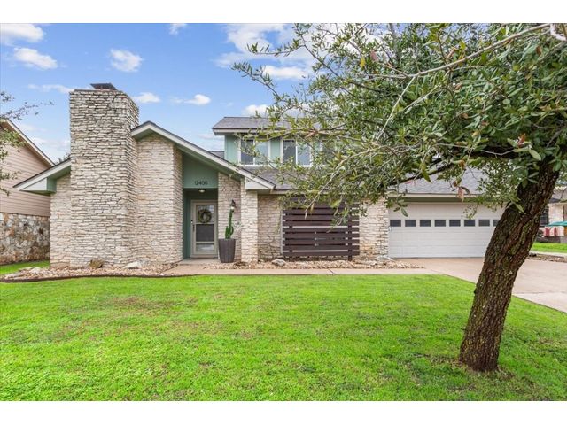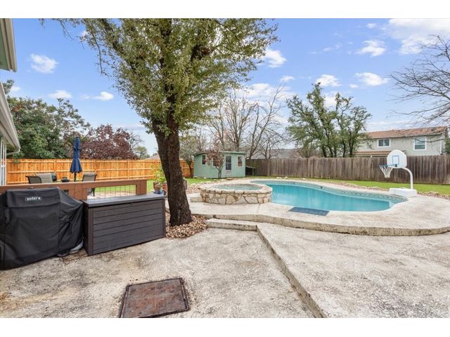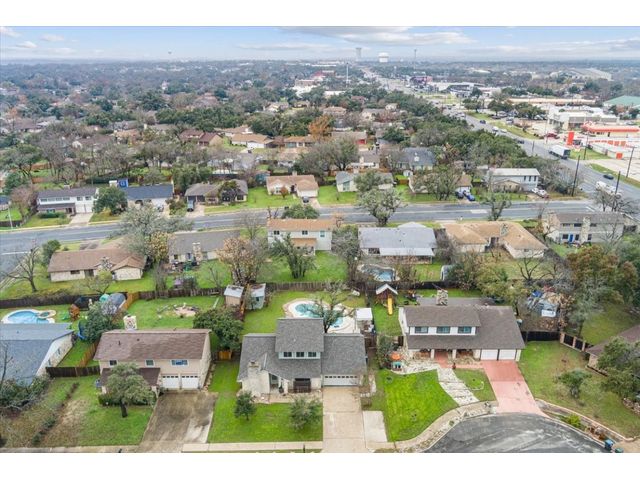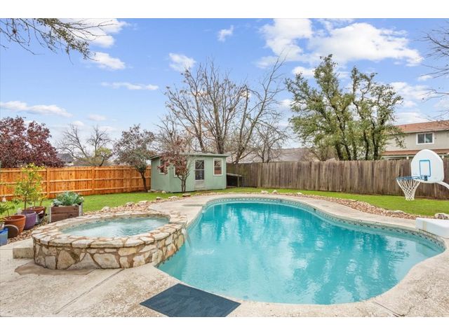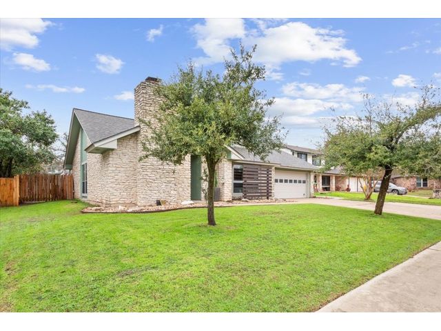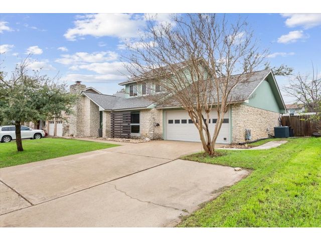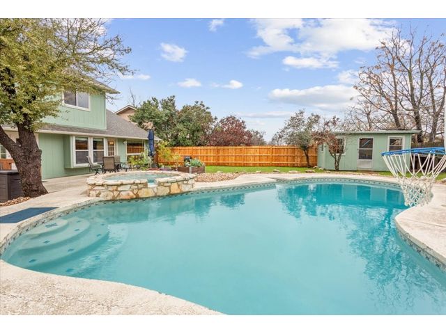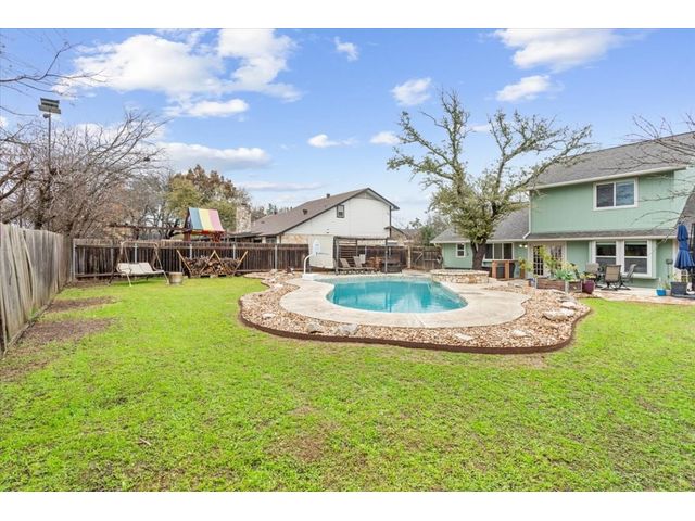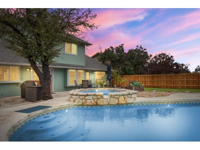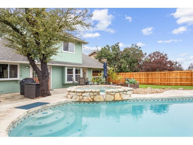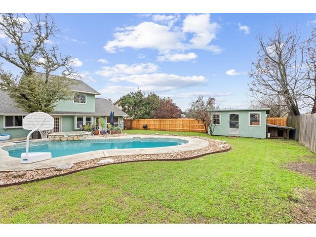 Nestled just off N FM 620 Highway, this inviting three-bedroom, two-full-bath home boasts a serene location in a quiet neighborhood. Perfect for entertainers, the open layout flows seamlessly from the gas starter fireplace in the living room to the dining area featuring built-in shelves. The kitchen, adorned with stainless steel appliances, offers an eat-in area, center island and stainless steal appliances. The main floor hosts a primary room with a gracious floor-to-ceiling window, while the primary bathroom features dual vanities, ample storage, and a potential TV hookup, with a shower fan boasting a Bluetooth speaker feature. Upstairs, two secondary bedrooms share a Jack and Jill-style bathroom. The backyard is an oasis, complete with an in-ground pool that was recently resurfaced. Complemented by a shed with AC and an adjacent dog house. This home is a perfect blend of comfort, style, and entertainment possibilities. Westwood High School and nearby schools are within walking distance, and under 3 miles are Lakeline Mall, Sam's Club, Target, and many other shopping centers.