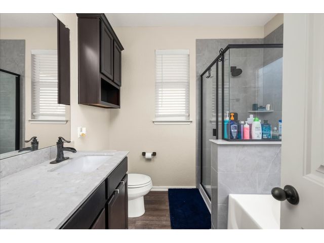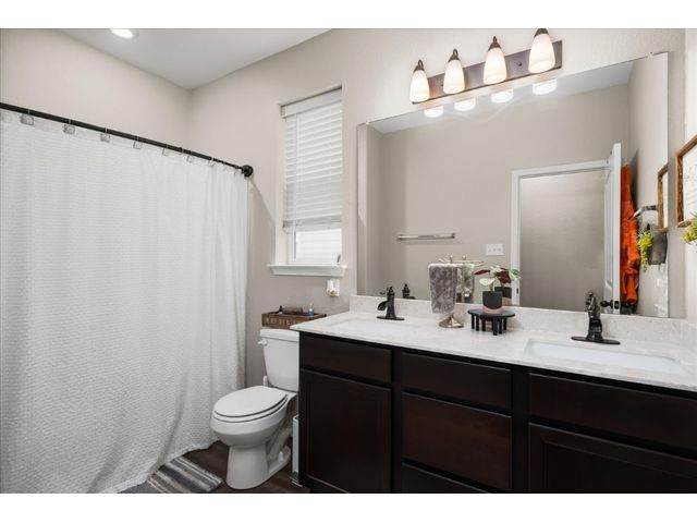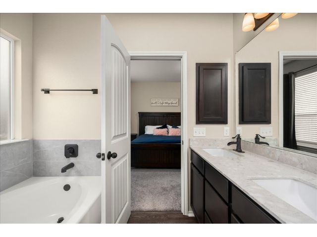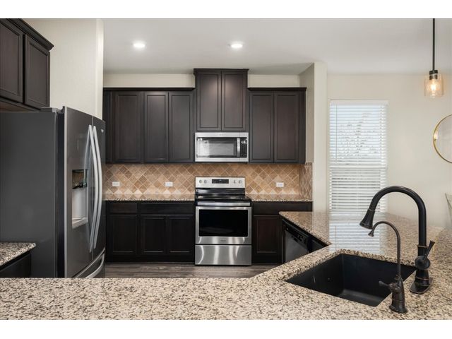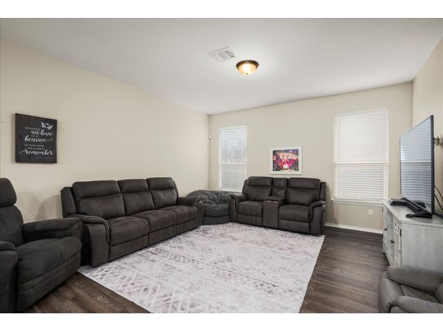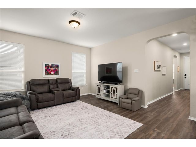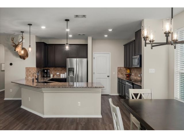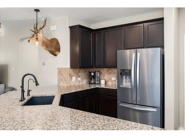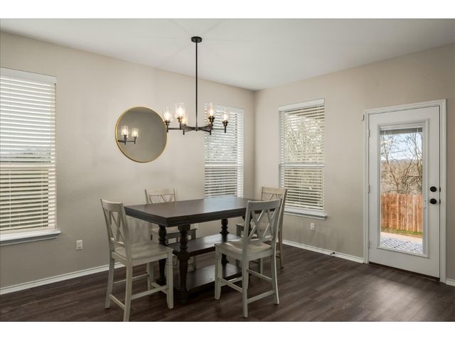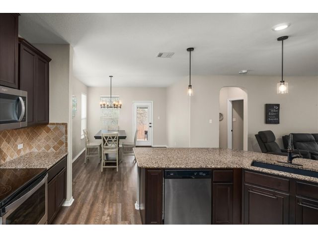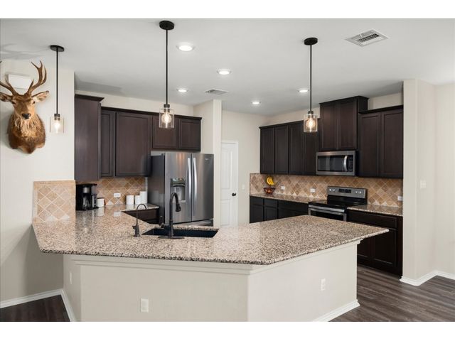 Pristine single story home located between Kyle and Lockhart. This 3 bedroom 2 bathroom home is situated on a private lot that backs up to private land and green space--just one neighbor! Recently installed luxury vinyl plank flooring in all living areas is easy to clean and maintain. The spacious kitchen is open to the living and dining room. Enjoy granite counters, breakfast bar, abundant cabinet space, a tile backsplash, stainless appliances, and a huge walk in pantry/laundry room. The primary suite is at the rear of the home. It includes an en suite bathroom with dual vanity, soaking tub, and walk in shower with neutral tile. Two secondary bedrooms are at the front of the home, are carpeted, and share a spacious hallway bathroom with dual vanity and a tub/shower combo. The backyard has a covered patio and is very private. This home is just 1 block to the community playground and sports court. You cannot beat this location that offers quiet living near Austin and San Marcos.