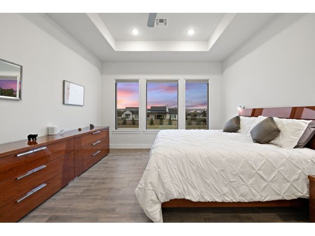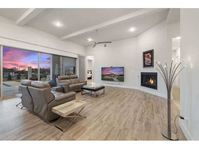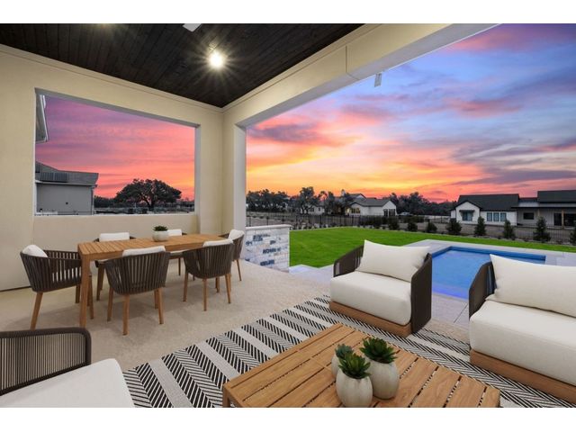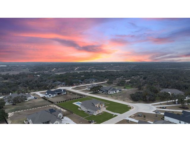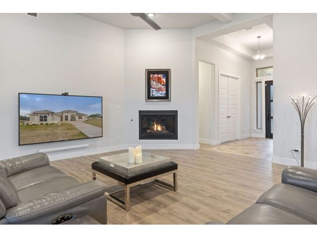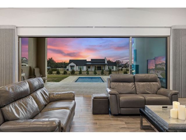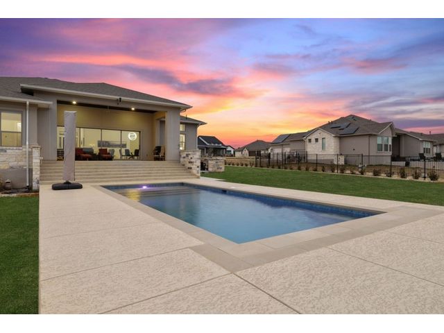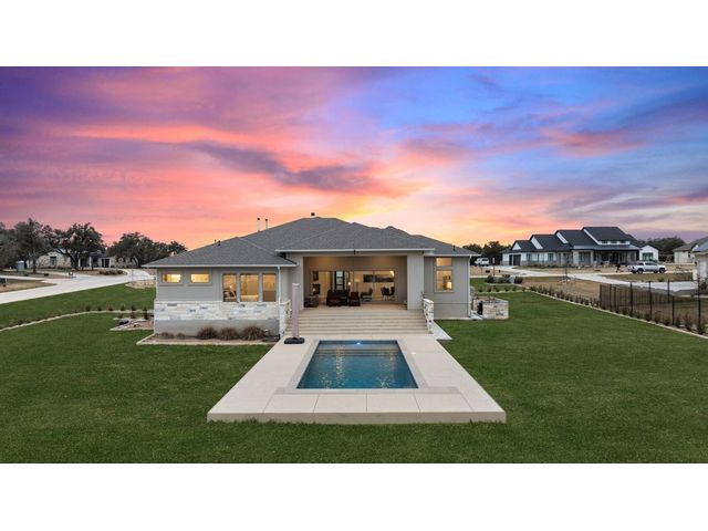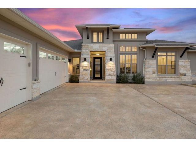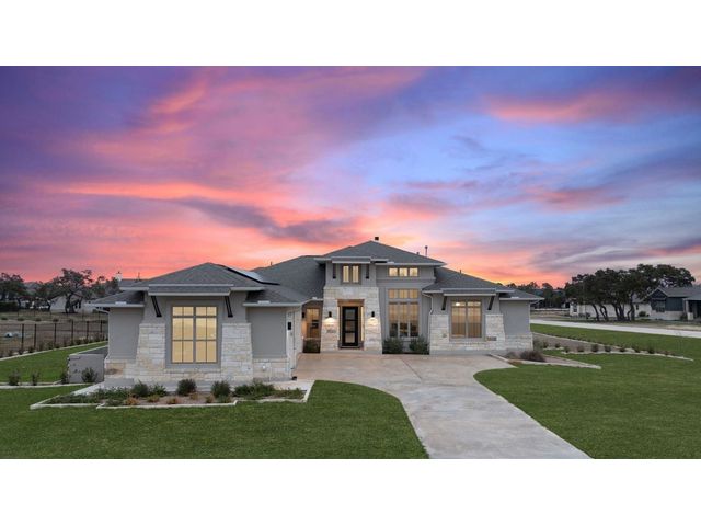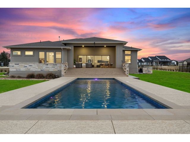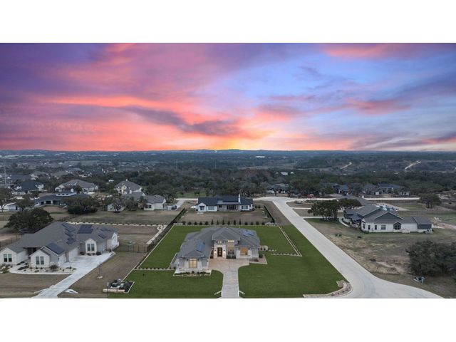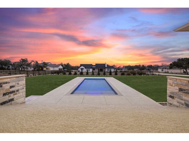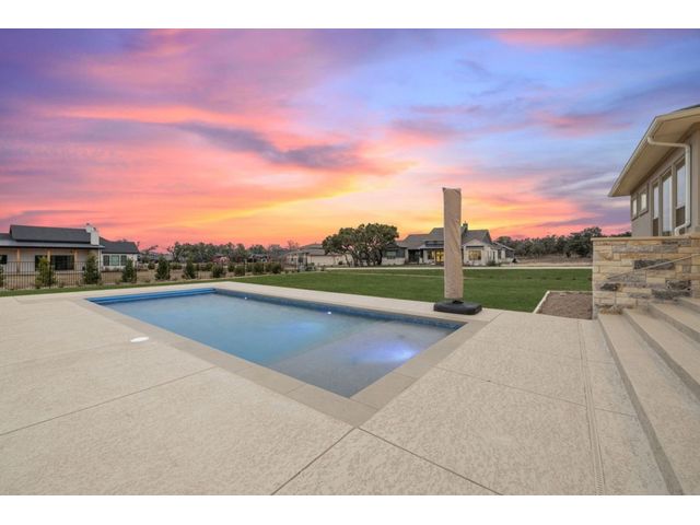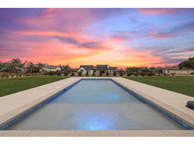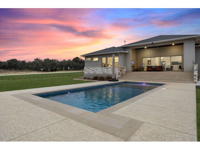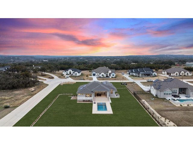 Simple elegance and an abundance of amenities define this open, single-story Hill Country modern home in the prestigious Bunker Ranch enclave in Dripping Springs. Sitting on a ¾-acre corner lot and 100% keyless, this smart home features efficient solar panels and battery back-up system, providing ongoing protection from power outages and peace of mind. This is a sanctuary-of-a-home where every detail has been thought through and relaxation reigns supreme. Step inside the foyer and be immediately wowed by a 20-foot expanse of glass that brings the outdoors in. The colossal living/dining/kitchen combo features impressive 12.5 ft ceilings, beautiful Chateau floor tiles, Hunter Douglas automatic blinds, and smartly designed stretches of wall to accommodate art displays or giant-TV/projection screens. The upgraded chef’s kitchen boasts a 36-inch gas range with 5 burners, stainless-steel hood, an oversized high-end Bosch refrigerator, an unforgettable sommelier's wine fridge, a giant island, and richly textured leathered granite countertops. Storage space is abundant with large soft-close drawers and an enormous walk-in pantry. At the front of the home, a large study/office features solid double doors, an elevated ceiling, and splendid windows equipped with custom Hunter Douglas automatic blinds. The extraordinary primary suite includes an elegant tray ceiling, lots of natural light streaming through multiple large windows, and two enormous walk-in closets with custom shelving. The open and upscale spa showcases a freestanding soaking tub, stylish walk-in shower with porcelain tile, and large double vanity. The immaculate 3-car garage is fully air conditioned/heated and includes epoxy flooring. The sleek backyard pool features an in-pool lounging shelf, automatic cover, and an inviting lounge area.