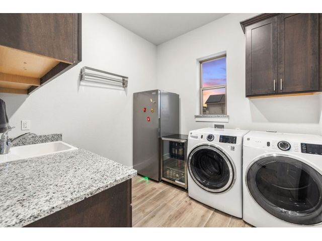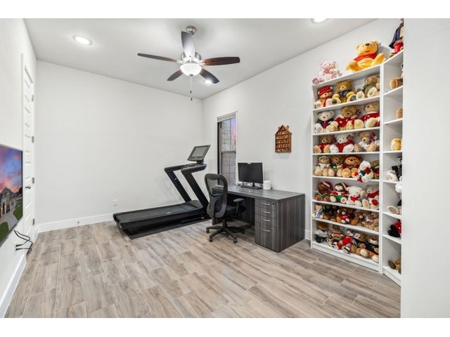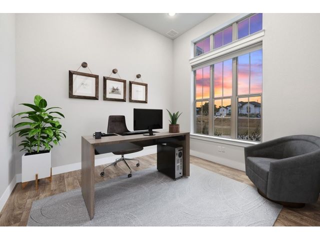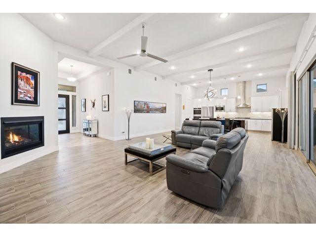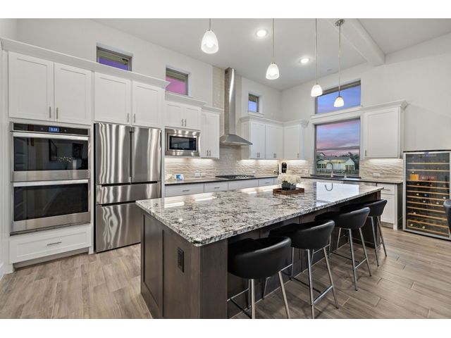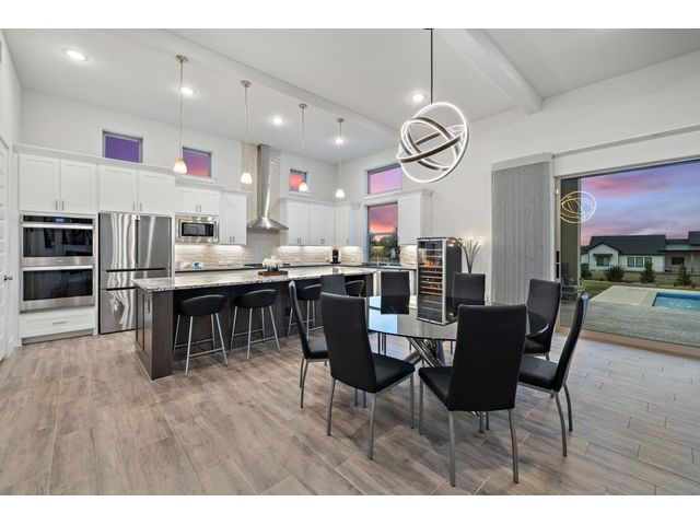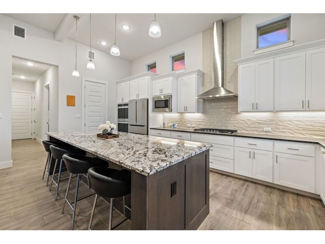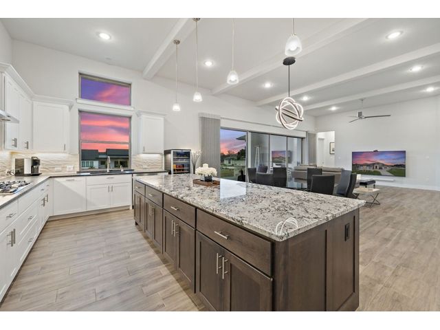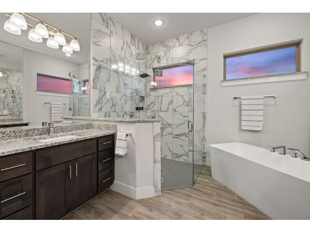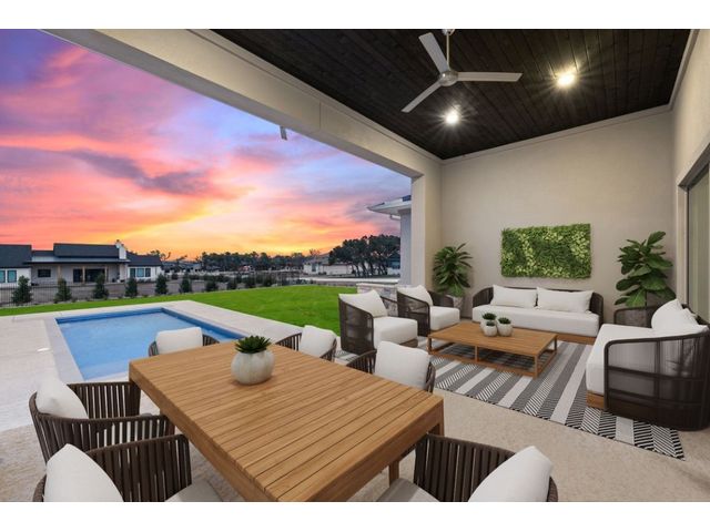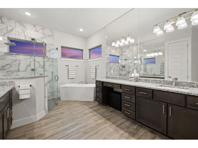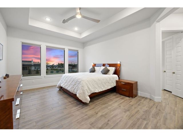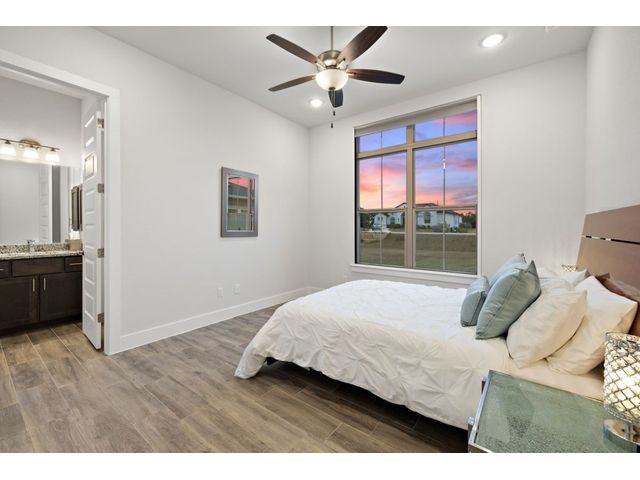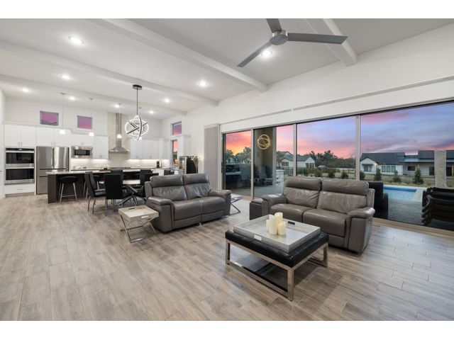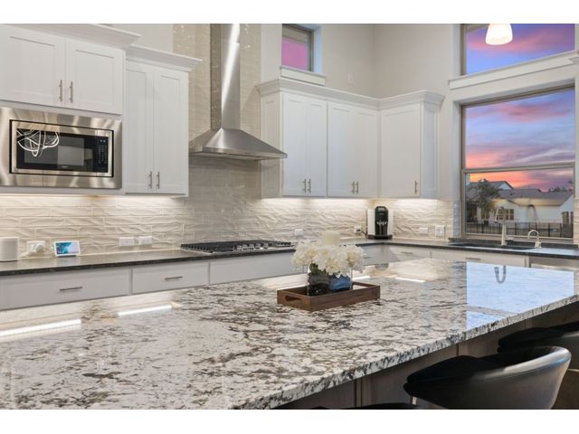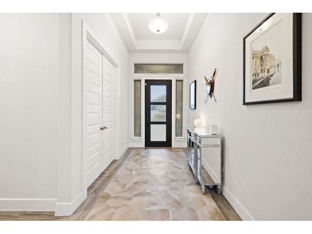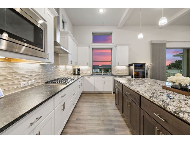 Simple elegance and an abundance of amenities define this open, single-story Hill Country modern home in the prestigious Bunker Ranch enclave in Dripping Springs. Sitting on a ¾-acre corner lot and 100% keyless, this smart home features efficient solar panels and battery back-up system, providing ongoing protection from power outages and peace of mind. This is a sanctuary-of-a-home where every detail has been thought through and relaxation reigns supreme. Step inside the foyer and be immediately wowed by a 20-foot expanse of glass that brings the outdoors in. The colossal living/dining/kitchen combo features impressive 12.5 ft ceilings, beautiful Chateau floor tiles, Hunter Douglas automatic blinds, and smartly designed stretches of wall to accommodate art displays or giant-TV/projection screens. The upgraded chef’s kitchen boasts a 36-inch gas range with 5 burners, stainless-steel hood, an oversized high-end Bosch refrigerator, an unforgettable sommelier's wine fridge, a giant island, and richly textured leathered granite countertops. Storage space is abundant with large soft-close drawers and an enormous walk-in pantry. At the front of the home, a large study/office features solid double doors, an elevated ceiling, and splendid windows equipped with custom Hunter Douglas automatic blinds. The extraordinary primary suite includes an elegant tray ceiling, lots of natural light streaming through multiple large windows, and two enormous walk-in closets with custom shelving. The open and upscale spa showcases a freestanding soaking tub, stylish walk-in shower with porcelain tile, and large double vanity. The immaculate 3-car garage is fully air conditioned/heated and includes epoxy flooring. The sleek backyard pool features an in-pool lounging shelf, automatic cover, and an inviting lounge area.