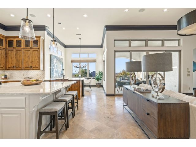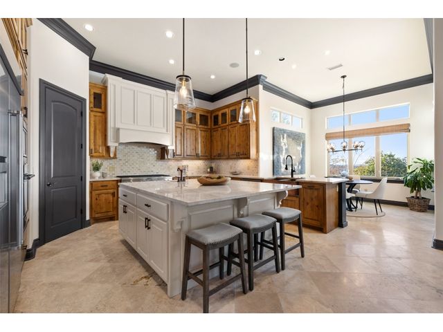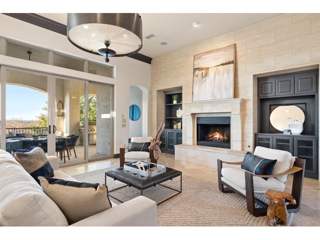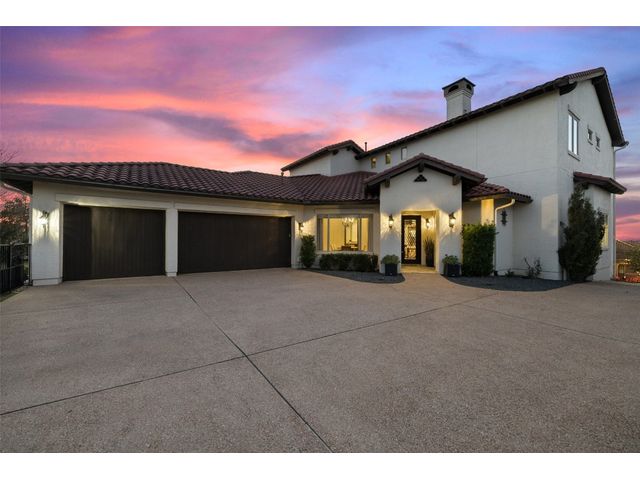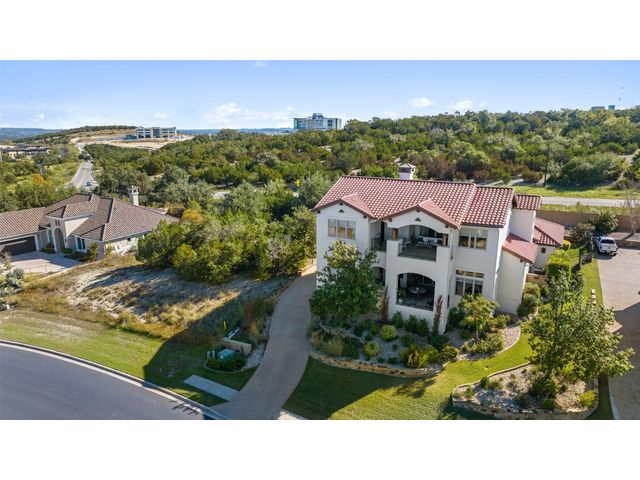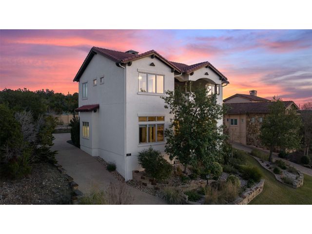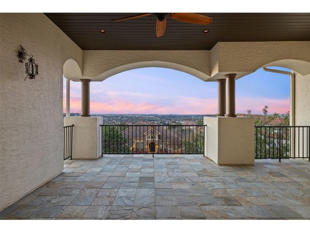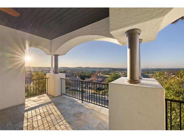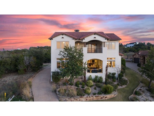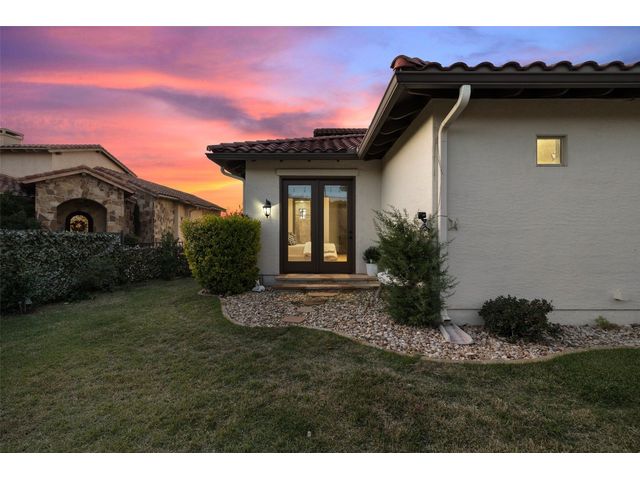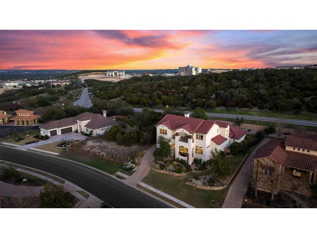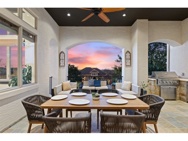 Perched atop the highest point within the Flintrock Falls community, this stunning mission style home offers a tranquil retreat. An adjacent lot with pool house and pool plans is available for purchase, providing the opportunity to create the ultimate oasis. Facing the community, two expansive covered patios offer sweeping views of the golf course and surrounding hill country. Embrace the quintessential Texas lifestyle with a full-service outdoor BBQ on the main deck, perfect for entertaining guests. The upgraded kitchen boasts KitchenAid stainless steel appliances, including an eight-burner 48” cooktop, microwave, oven, and built-in refrigerator. Recently updated off-white marble countertops complement the new glass tile backsplash. The kitchen also features a Mies on plas and vegetable sink area, ideal for the home chef who enjoys hosting. Adjacent to the kitchen, a sunlit breakfast nook with abundant windows provides a delightful start to the day. The spacious living room features slider doors leading to the outdoor patio and a full-service wet bar with an open wine display and wine chiller. During cooler evenings, gather around the central fireplace for warmth and ambiance. Conveniently located on the first floor, the primary and secondary suites offer comfortable retreats. The primary suite opens to the front deck for the owner's enjoyment and boasts an oversized freestanding tub, floor-to-ceiling arched tile work, and a chandelier, creating a luxurious bathroom retreat. The secondary suite, situated at the rear of the home, features large French doors leading to the backyard and an en suite bathroom. Upstairs, a spacious entertainment room connects to the secondary patio deck, offering endless views. Three additional bedrooms are linked to the entertainment room, with two sharing a Jack and Jill bathroom and one featuring an en suite bathroom. Don't miss the opportunity to experience the serene lifestyle offered by this exquisite property.