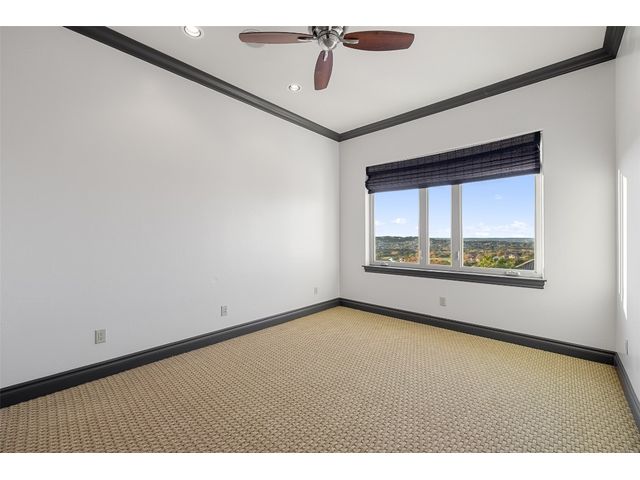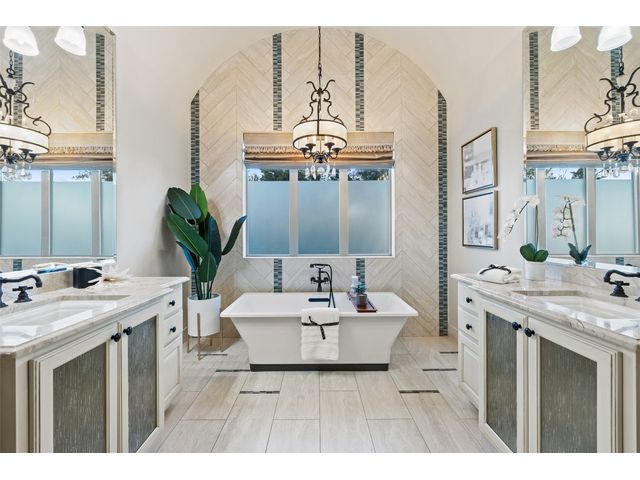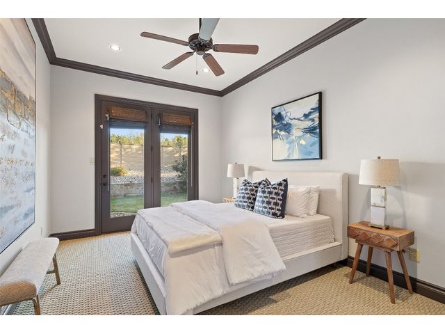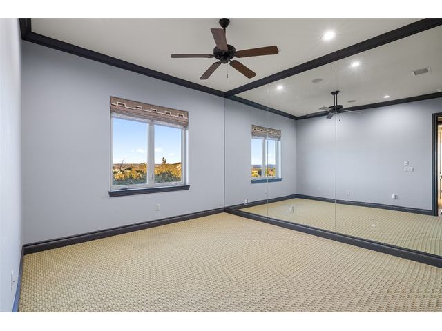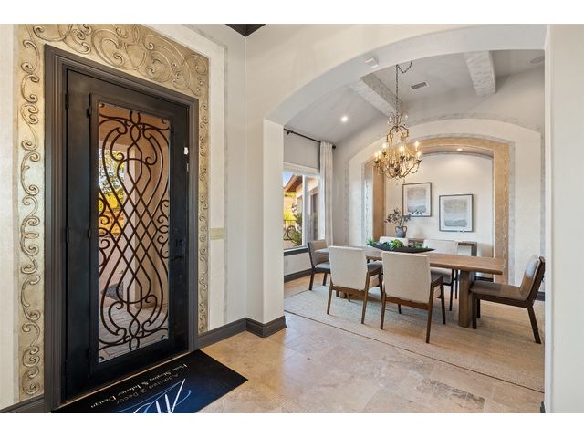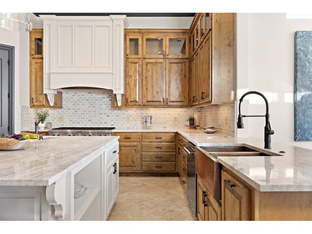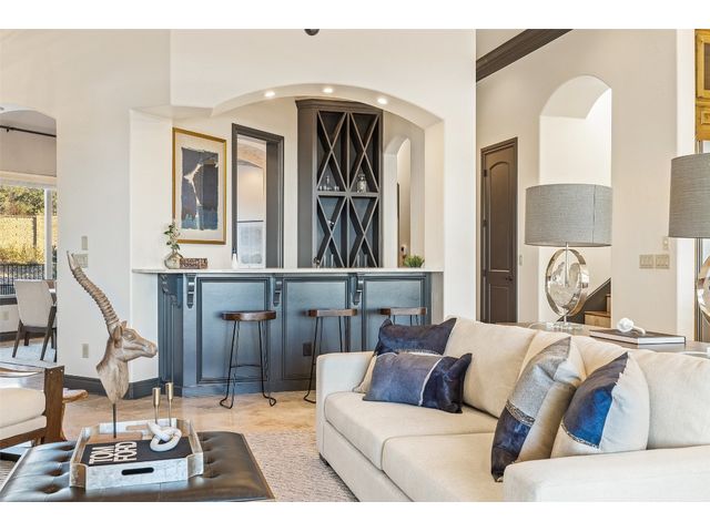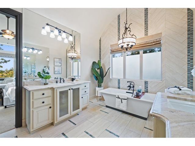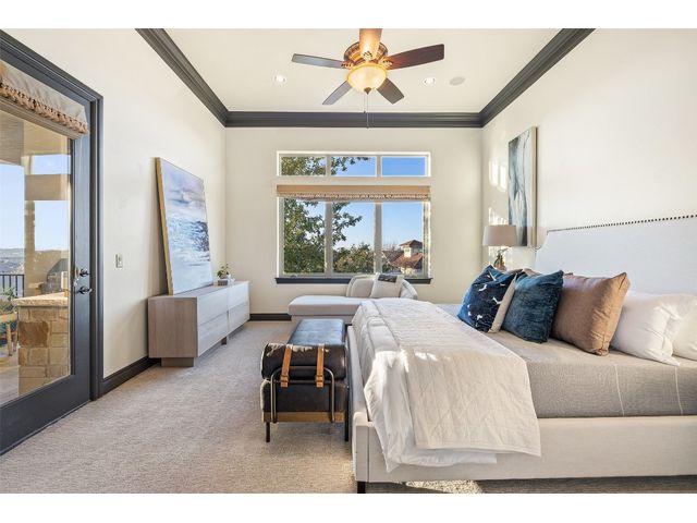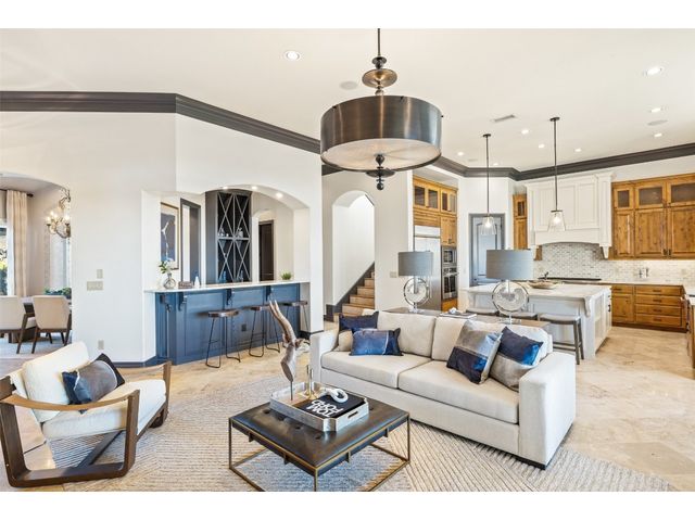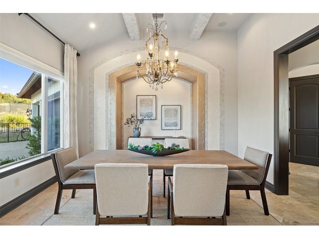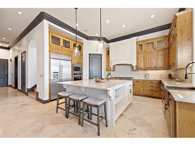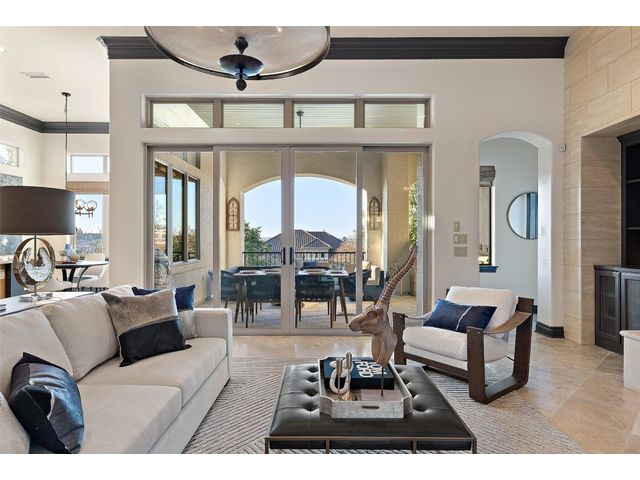 Perched atop the highest point within the Flintrock Falls community, this stunning mission style home offers a tranquil retreat. An adjacent lot with pool house and pool plans is available for purchase, providing the opportunity to create the ultimate oasis. Facing the community, two expansive covered patios offer sweeping views of the golf course and surrounding hill country. Embrace the quintessential Texas lifestyle with a full-service outdoor BBQ on the main deck, perfect for entertaining guests. The upgraded kitchen boasts KitchenAid stainless steel appliances, including an eight-burner 48” cooktop, microwave, oven, and built-in refrigerator. Recently updated off-white marble countertops complement the new glass tile backsplash. The kitchen also features a Mies on plas and vegetable sink area, ideal for the home chef who enjoys hosting. Adjacent to the kitchen, a sunlit breakfast nook with abundant windows provides a delightful start to the day. The spacious living room features slider doors leading to the outdoor patio and a full-service wet bar with an open wine display and wine chiller. During cooler evenings, gather around the central fireplace for warmth and ambiance. Conveniently located on the first floor, the primary and secondary suites offer comfortable retreats. The primary suite opens to the front deck for the owner's enjoyment and boasts an oversized freestanding tub, floor-to-ceiling arched tile work, and a chandelier, creating a luxurious bathroom retreat. The secondary suite, situated at the rear of the home, features large French doors leading to the backyard and an en suite bathroom. Upstairs, a spacious entertainment room connects to the secondary patio deck, offering endless views. Three additional bedrooms are linked to the entertainment room, with two sharing a Jack and Jill bathroom and one featuring an en suite bathroom. Don't miss the opportunity to experience the serene lifestyle offered by this exquisite property.