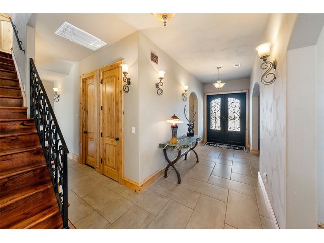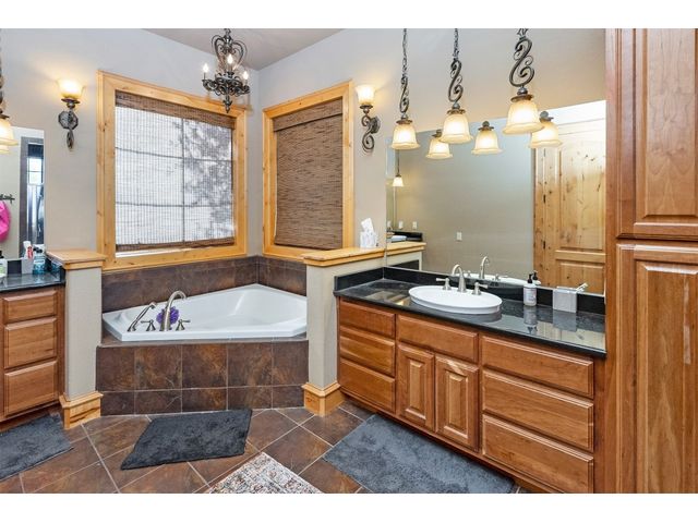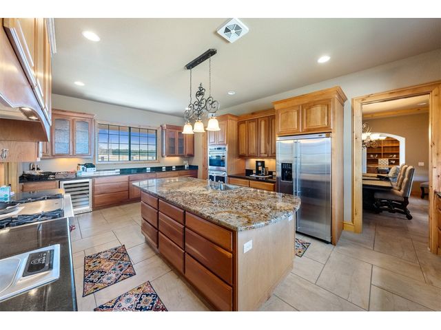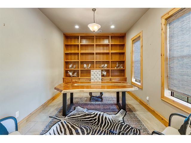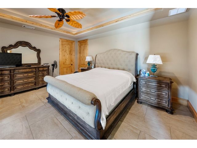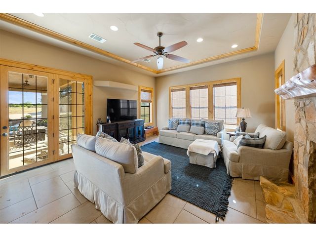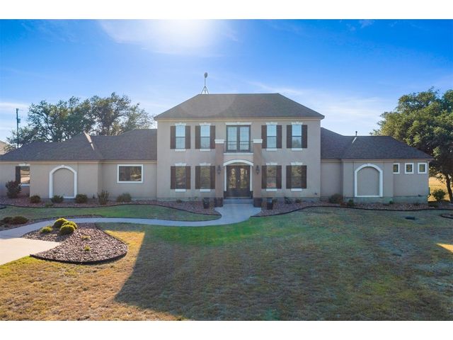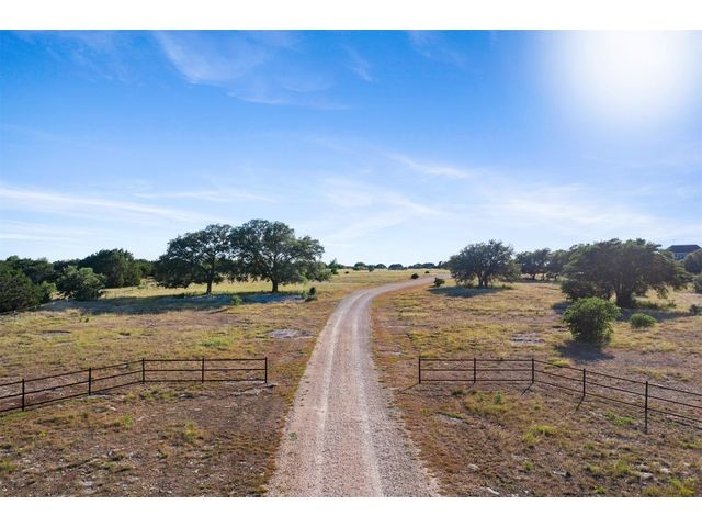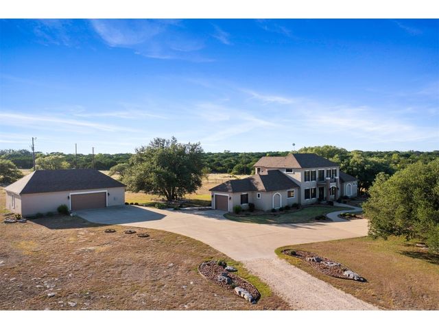 Custom home set on 31.72 acres in Greystone Ranch. With gently rolling terrain throughout, many mid-to-large size oaks allowing for dramatic hill country views from both the front and rear covered porches, as well as the upstairs balcony, depicting peaceful tranquility. This 2-level, four-bedroom home with formal living, dining, flex space, multiple living areas up and down, and gourmet kitchen that will meet your every expectation. Italian imported oversized Spanish tile flows throughout the downstairs area. Primary suite down includes private covered porch oversized walk-in shower and jetted tub. Kitchen is a cook’s dream and has Wolf appliances, including professional-grade gas stove, massive center island with abundant storage, 3 sinks, built-in deep fryer, microwave, wine refrigerator, walk-in pantry with abundant shelving and more. Home is wired for Internet, and outdoor patios are wired for TV. Look no further for peace and privacy than this rare find in Burnet county!