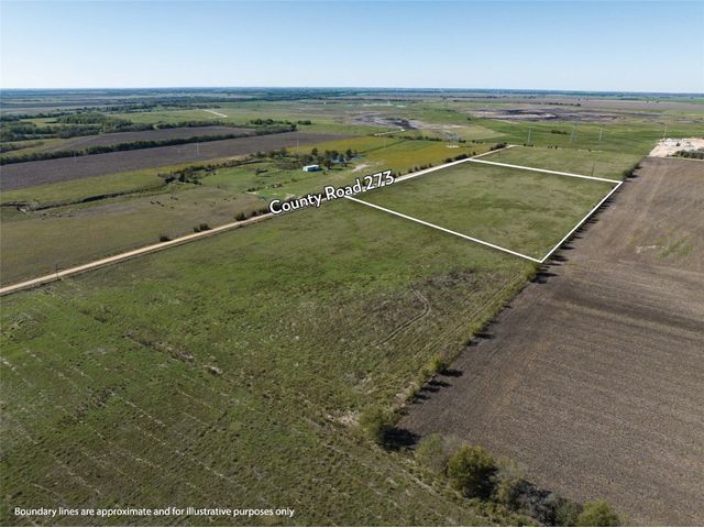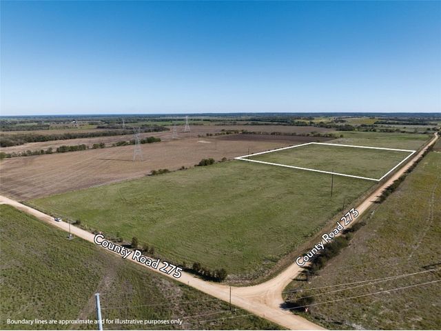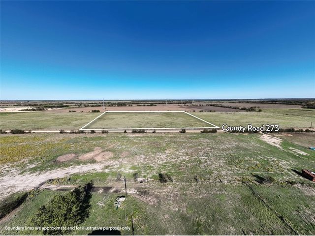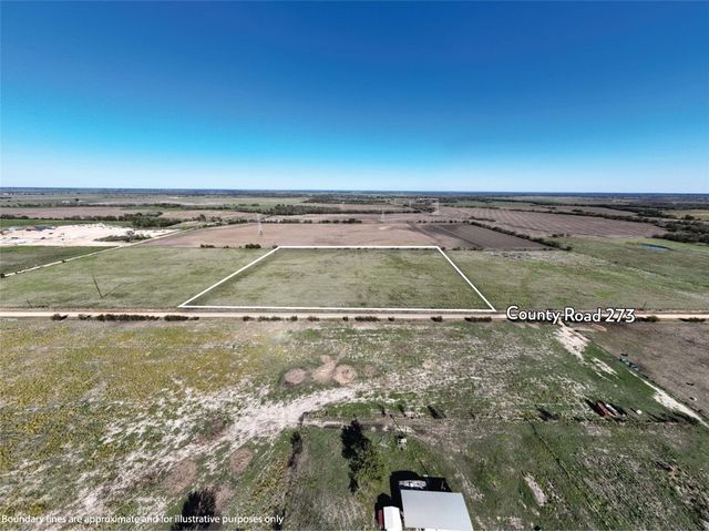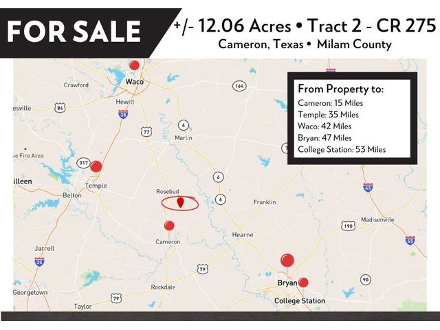 12.06 acres of open, cleared land with 822 feet of frontage along County Road 273, a gravel, county-maintained road. Land is mostly level and sits at approx. 340-350' elevation. Property features perimeter fencing along 2 sides, overhead electric lines along the road and a 2" waterline nearby down CR 275. Agriculture valuation in place for low taxes. No restrictions and no known leases. Only 11 miles to Rosebud, 17 miles to Cameron, 36 miles to Temple, 43 miles to Waco, and 47 miles to Bryan-College Station. Milam county is not mapped with FEMA, but property so floodplain unknown, but property is 1/2 mile north of the closest creeks. There is an overhead transmission line running diagonal across the northeast corner of the property.