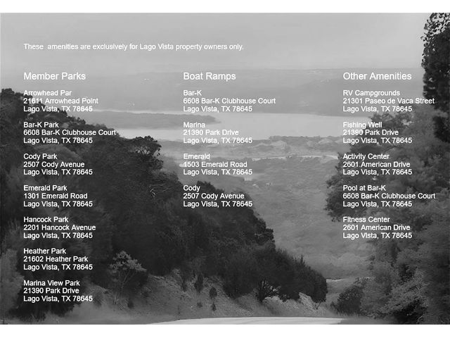Price Reduction! LAKE VIEWS! Build your dream home on this amazing lot with the potential for incredible views with the right style build. This lot is a stone’s throw away from Handcock Park and Emerald Park/boat launch. Lago Vista has 9 property owner waterfront parks, a golf course with a clubhouse and bar-restaurant, a marina, fishing well, fitness center, 2 community pools, and more! Lago Vista also has a highly rated school district! If you have not taken the time to visit this community, now is a perfect time to do so! This lot is in the floodplain, and the City of Lago Vista requires the finished floor to be at 723’; check with your builder. Please contact the City of Lago Vista for more information. The area is booming. This is your chance to get a nice, buildable lot close to the water. STRs are allowed. Buyer to verify all information.