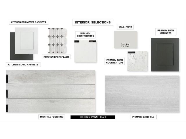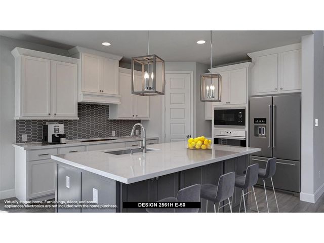 Home office with French doors set at two-story entry. Two-story family room with wall of windows opens to kitchen and dining area. Kitchen hosts inviting island with built-in seating space. First-floor primary suite includes dual vanities, garden tub, separate glass-enclosed shower and large walk-in closet in primary bath. A second bedroom is downstairs. Two secondary bedrooms and a game room are upstairs. Extended covered backyard patio and 8-zone sprinkler system. Two-car garage.