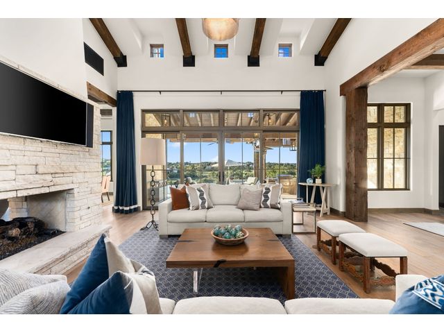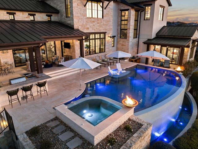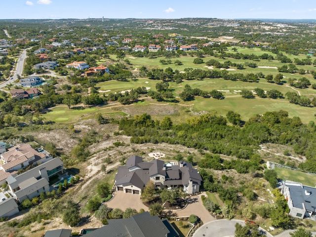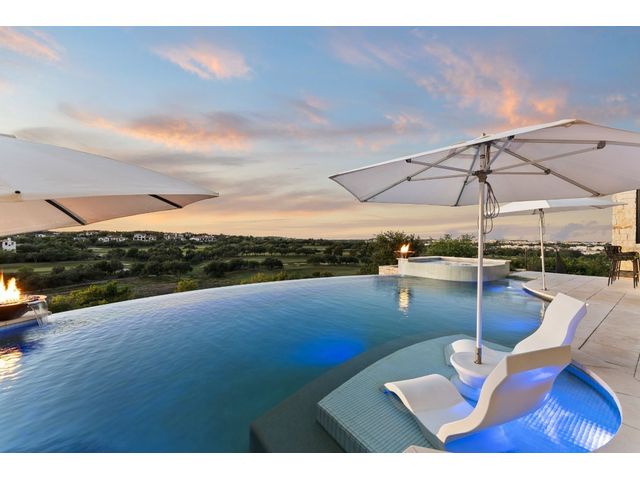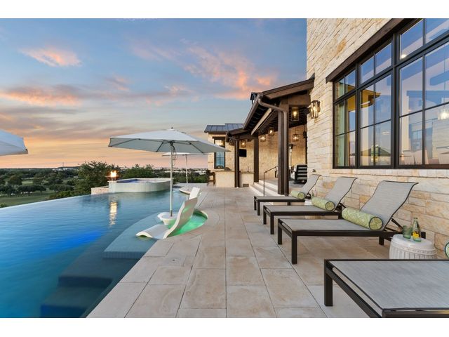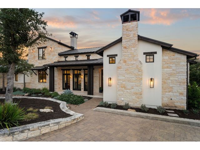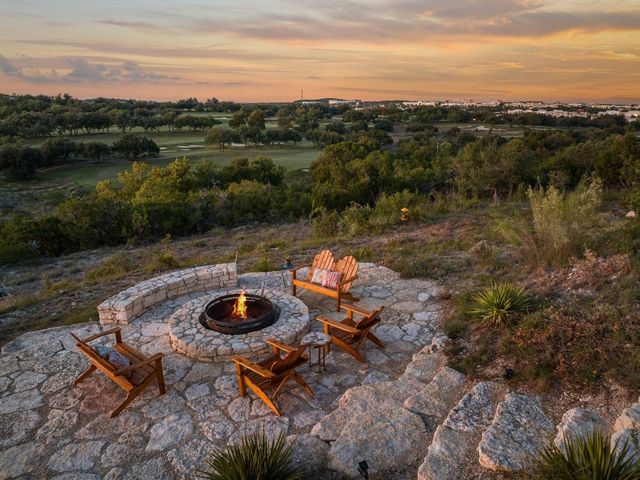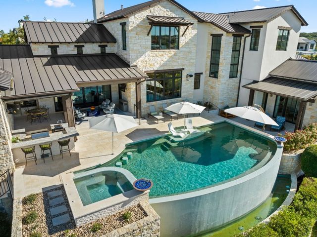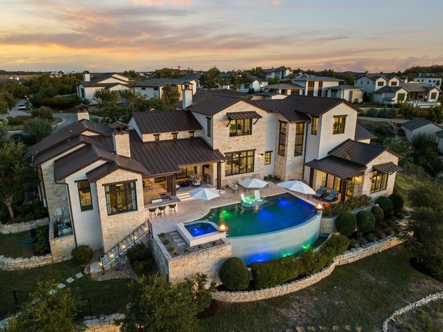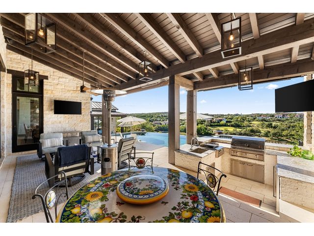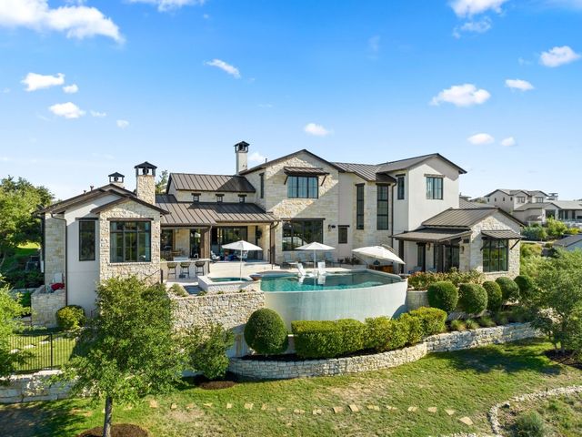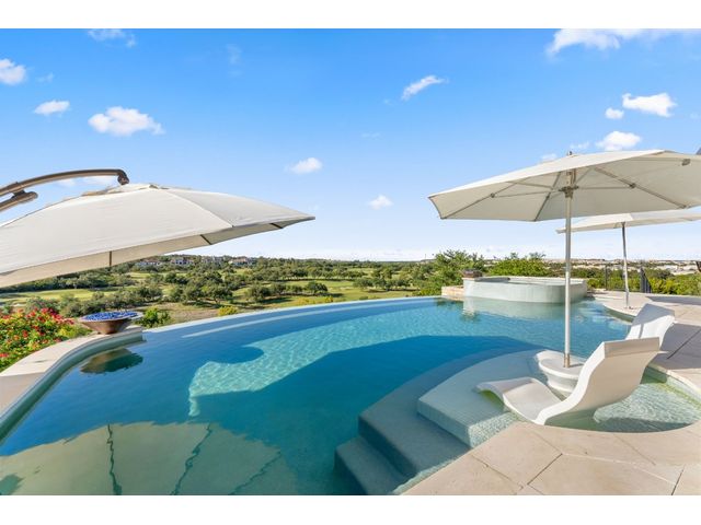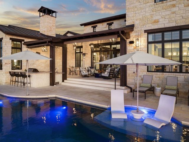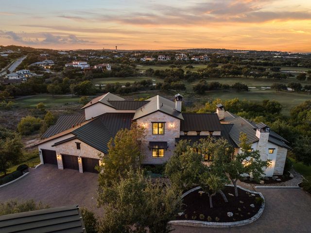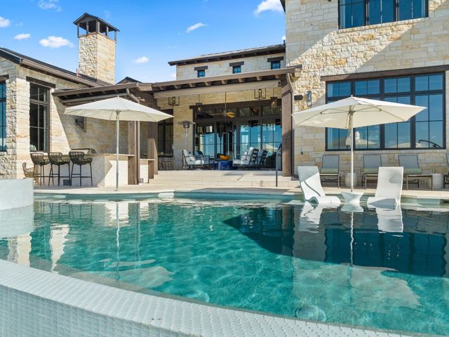 This 5703 sq. ft. property, perched atop a hill with panoramic views of the hill country and Spanish Oaks Golf Course, offers exclusivity. Inside, a foyer with natural materials welcomes you. Craftsmanship is evident, from wooden beams to a stone fireplace. The kitchen features top-of-the-line appliances, abundant cabinet space, and a walk-in pantry. Natural sunlight fills four bedrooms, each with a walk-in closet and en-suite bath. The residence includes a versatile bonus room, a media room, and a gym with a steam shower. The backyard is a paradise with a sunken BBQ kitchen, resort-style pool, spa, and a fire pit. The attached casita offers a private escape for guests, complete with a mini fridge, coffee bar, and spa-like amenities. The property, on the 5th tee box, provides unparalleled golf course views. Enjoy exclusive Spanish Oaks amenities, including trails, a fish camp, resort-style pool, and sports facilities. LTISD