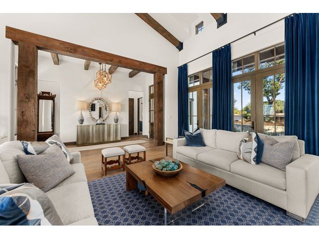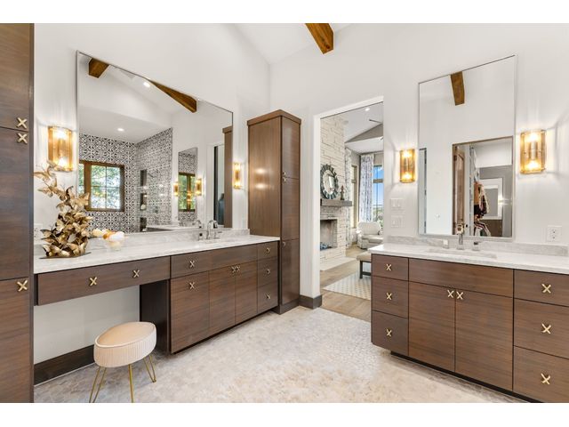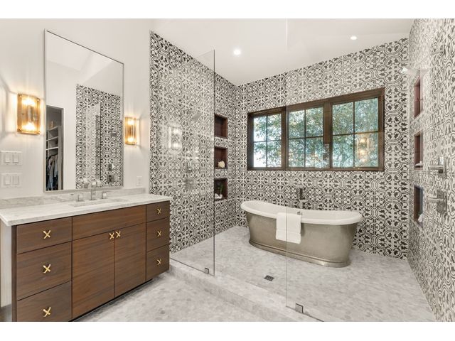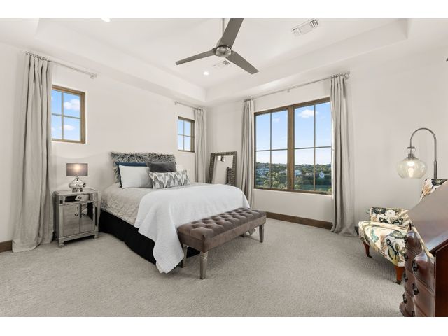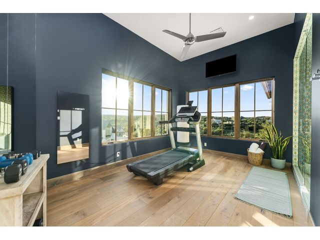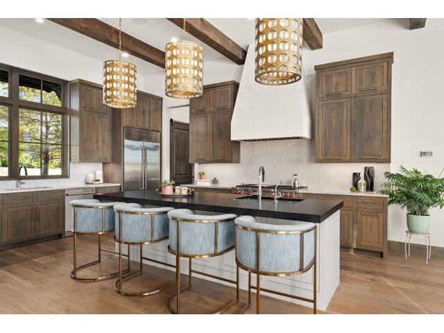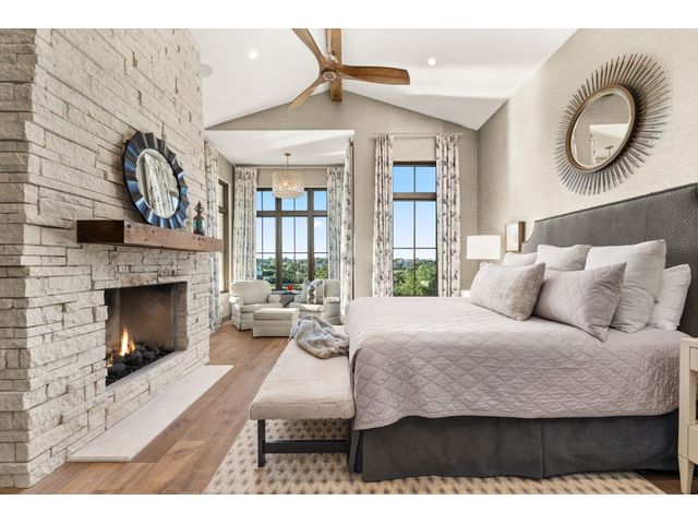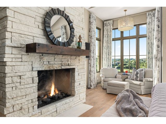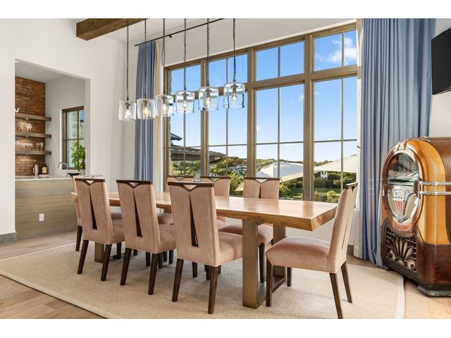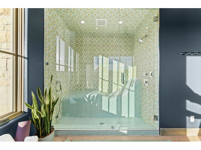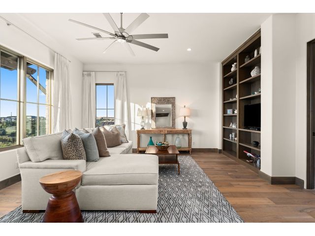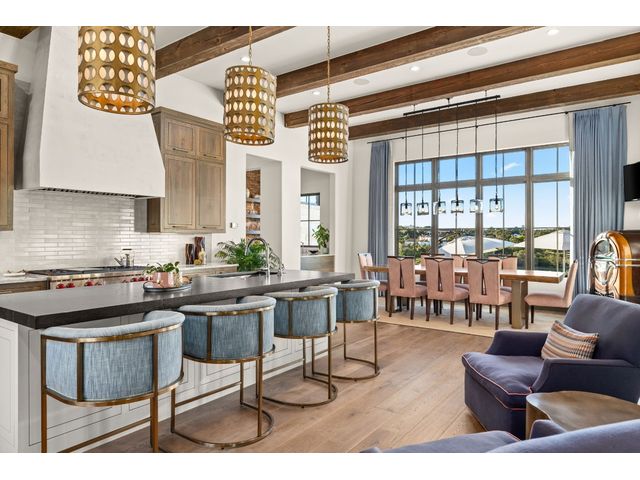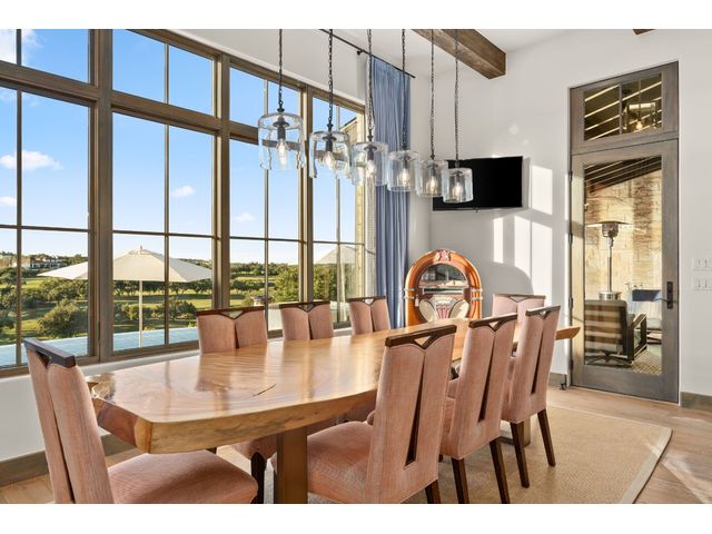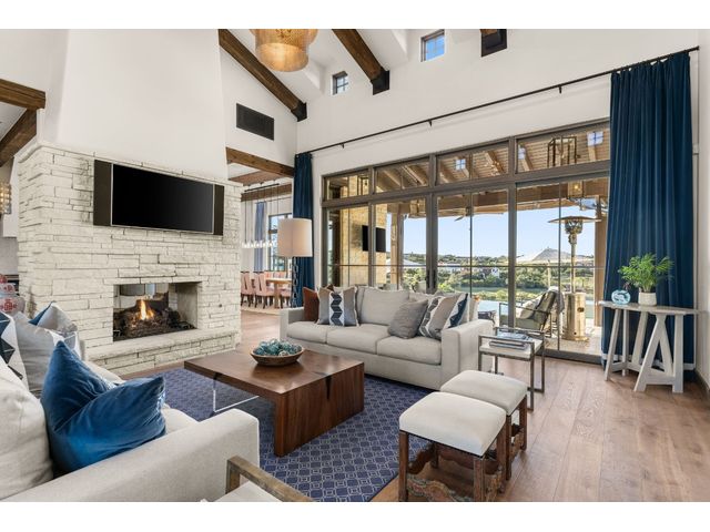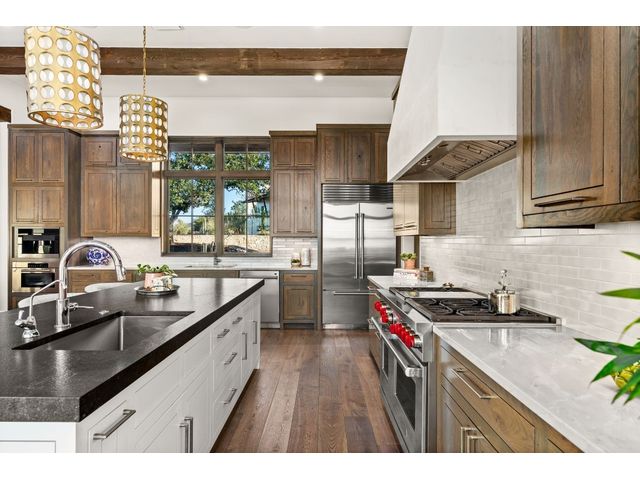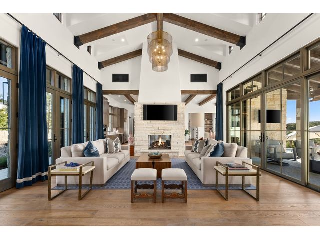 This 5703 sq. ft. property, perched atop a hill with panoramic views of the hill country and Spanish Oaks Golf Course, offers exclusivity. Inside, a foyer with natural materials welcomes you. Craftsmanship is evident, from wooden beams to a stone fireplace. The kitchen features top-of-the-line appliances, abundant cabinet space, and a walk-in pantry. Natural sunlight fills four bedrooms, each with a walk-in closet and en-suite bath. The residence includes a versatile bonus room, a media room, and a gym with a steam shower. The backyard is a paradise with a sunken BBQ kitchen, resort-style pool, spa, and a fire pit. The attached casita offers a private escape for guests, complete with a mini fridge, coffee bar, and spa-like amenities. The property, on the 5th tee box, provides unparalleled golf course views. Enjoy exclusive Spanish Oaks amenities, including trails, a fish camp, resort-style pool, and sports facilities. LTISD
