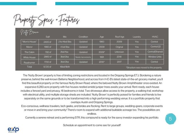Owner Financing available for the right offer! The ‘Nutty Brown’ property is free of limiting zoning restrictions and located in the Dripping Springs ETJ. Bordering a nature preserve, behind the well-known Belterra Neighborhood, and across from H-E-B’s latest state-of-the-art grocery market, you’ll find this beautiful property on the famous Nutty Brown Road, where the beloved Nutty Brown Amphitheater once existed. An expansive 6.283 acre property with five houses nestled amidst juniper trees awaits your arrival. Rent-ready, each house includes a fenced yard and privacy; 16 bedrooms and 9 bathrooms in total. Two driveways allow access to the property, a walking trail, workshop with electrical utility, and multiple storage sheds are included. ‘Nutty Brown’ is perfectly poised for families and friends to live separately on the same grounds or to be transformed into a high performing wedding venue. It is a portfolio property that overlaps Austin and Dripping Springs.
