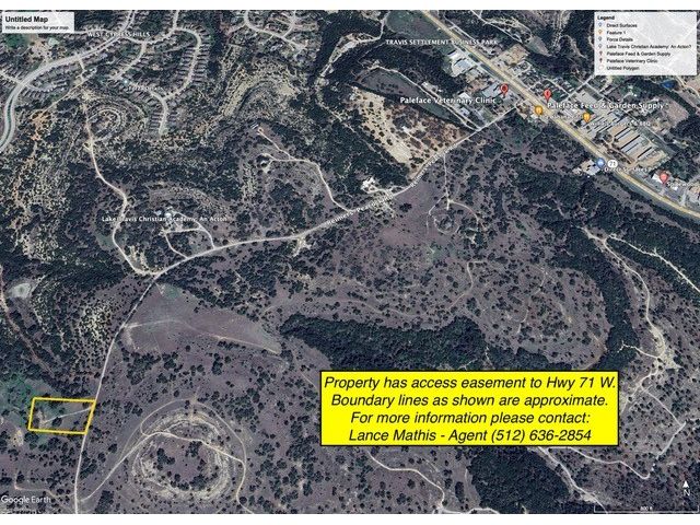 This unrestricted property is located surrounded by Lake Travis ISD’s 233 +-acre property. The improvements were removed from the property. In December of 2007, LTISD purchased a 43+ acre site, and subsequently in July 2017 the district purchased an additional 190+ acres. The district now owns a total of 233+- acres adjacent to, behind subject property.