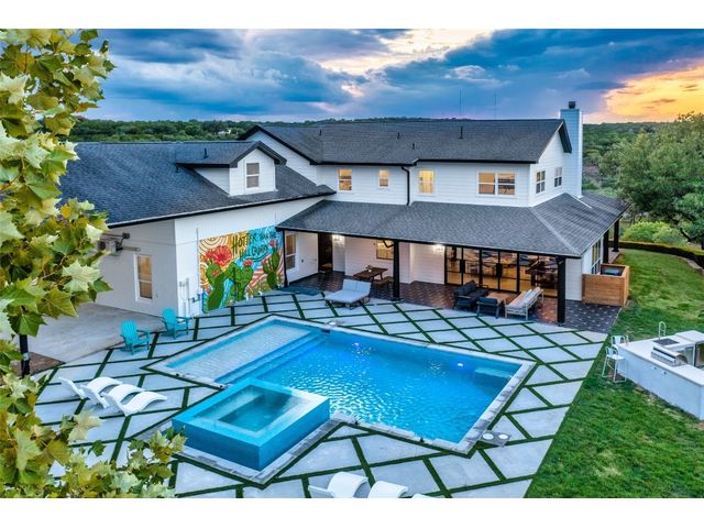Positioned in the heart of distillery and brewery row, this Fitzhugh Corridor gem, a highly successful short term rental venue (in its first 17 months of operations the property grossed $501K+), combines modern farmhouse aesthetics with an unparalleled outdoor living experience across its 10-acre expanse. The property, currently capable of hosting up to 40 guests, features a 9-bedroom, 7.5-bathroom home (two of the bedroom suites feature private entrances) designed for a variety of events including weddings, retreats, and family gatherings. The estate also boasts a gated entry, tranquil pond, pool, hot tub, outdoor kitchen, and a 5000 sqft convertible Barn-dominium with plumbing that has endless possibilities - more living space, workshop, shooting range, bring your imagination! At the heart of the home lies a chef’s kitchen, appointed with a Quartz waterfall island, high-end appliances, and extensive cabinetry, perfect for culinary enthusiasts. The living area, adorned with a beamed ceiling and a warm fireplace, invites cozy conversations. Unique details like herringbone wood-look tile floors, custom paint, and distinctive light fixtures add to the home’s charm. Bedrooms are spacious, with the majority boasting modern ensuite bathrooms equipped with brass fixtures, quartz countertops, and large, marble-tiled showers. The outdoor area is where the property truly shines: a sanctuary featuring a heated pool and spa for year-round enjoyment, an outdoor kitchen for alfresco dining, a fire pit for evening gatherings, and a variety of games for entertainment, ensuring privacy and leisure. Additionally, a large, 5000 sqft warehouse/barn-dominium presents a blank slate for creative uses. Amazing location within five minutes of multiple breweries, distilleries, and wedding venues, 25 mins to to downtown and 30 mins to Austin airport