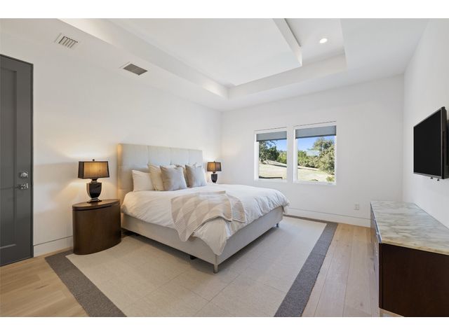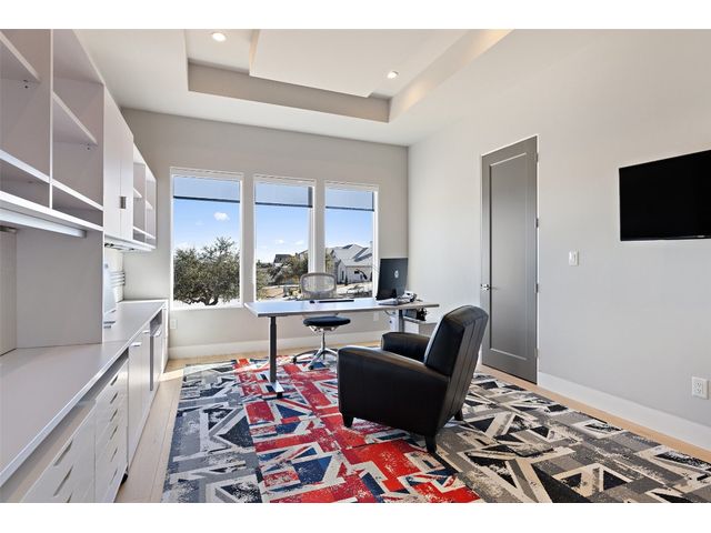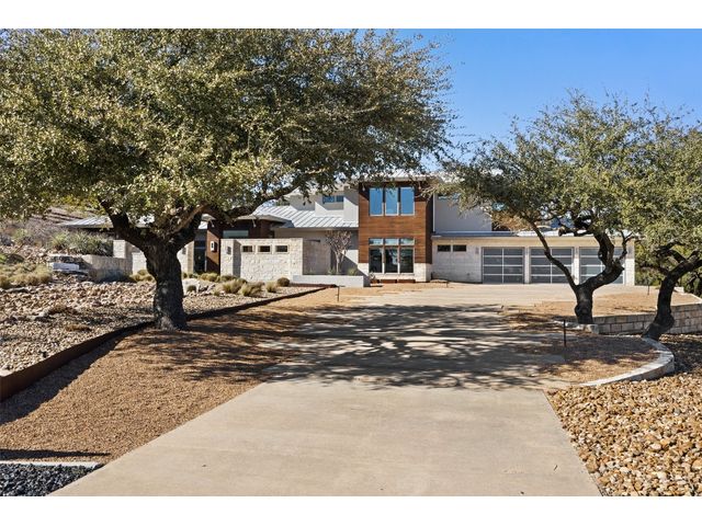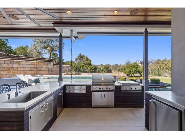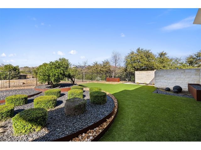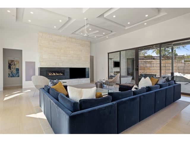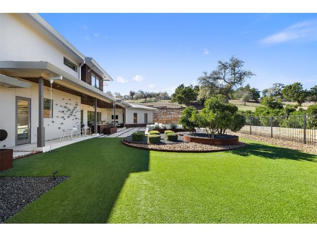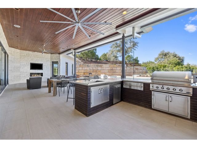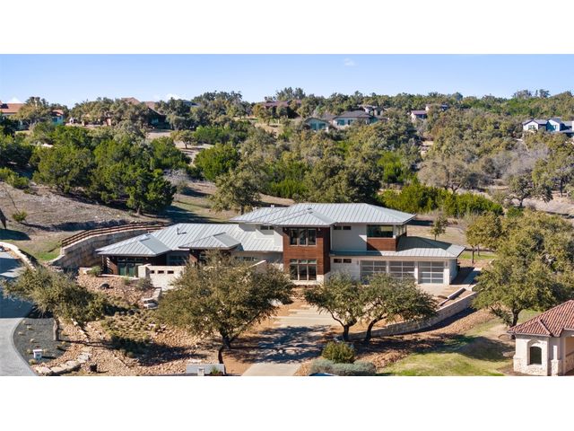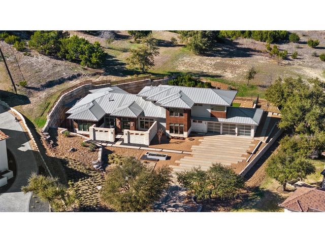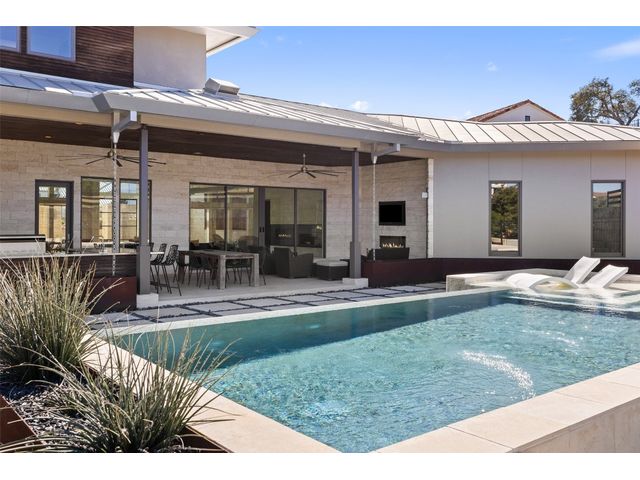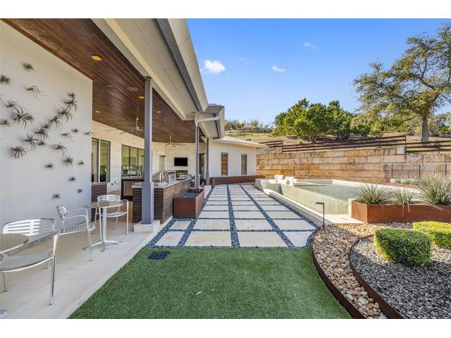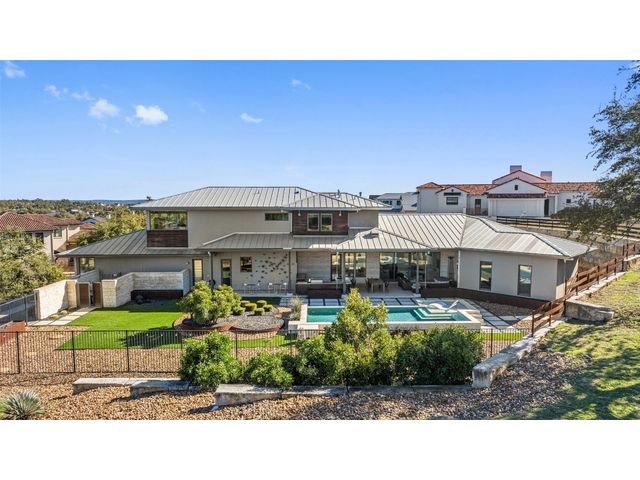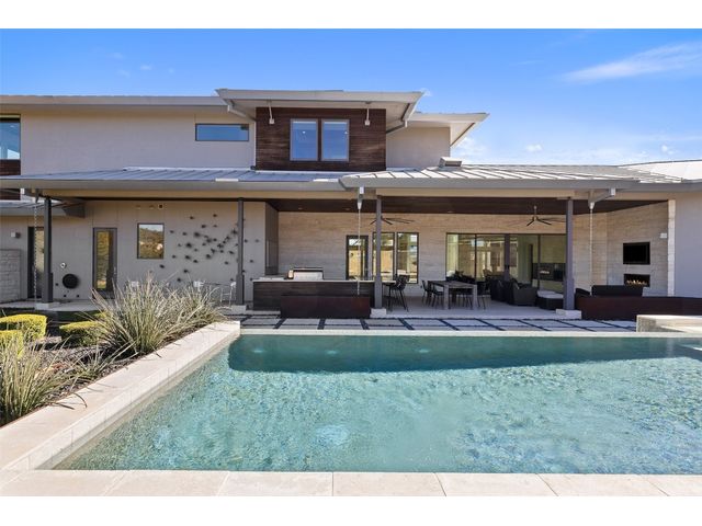 Welcome to 8300 Verde Mesa! Situated on a nearly 2-acre cul-de-sac lot with hill country views, this 4-bedroom, 6-bathroom home in Belvedere provides a serene retreat. This home lives like a single story with light-filled open spaces, every room has unique ceiling treatments, custom window shades, and surround sound speakers. The expansive primary bedroom opens to the back patio pool area and a private deck. The primary bathroom boasts a walk-through shower, soaking tub, and dual vanity with quartz countertops. The open kitchen is perfect for gatherings, featuring a quartz waterfall island and commercial-grade appliances. The secondary bedroom with an ensuite bath and also has access to the front courtyard. Additionally on the first floor, there is a dedicated study with bookshelves, a two washer/two dryer laundry room, and a craft room with ample storage enhance the functionality of the home. Upstairs, the fitness room has panoramic views, a media room with a kitchenette, and two spacious bedrooms with ensuite bathrooms. The outside patio is accessed through double sliding glass doors for seamless indoor/outdoor entertaining. revealing a covered patio, outdoor living area with a fireplace, outdoor dining, and kitchen. After a dip in the pool/spa, enjoy the convenience of an outdoor shower. The community amenities includes 80 acres of trails, a lazy river, splash pad, fishing pond, natural preserve, sport court, and an amenity center where social events are hosted. Furniture is negotiable.
