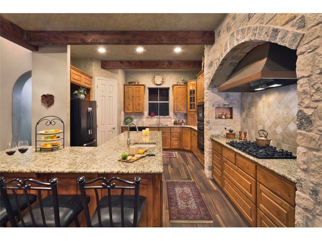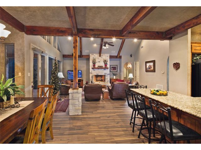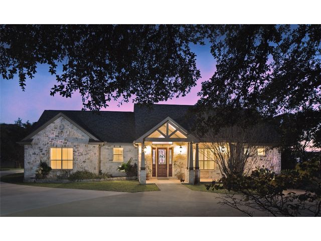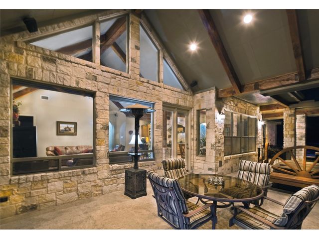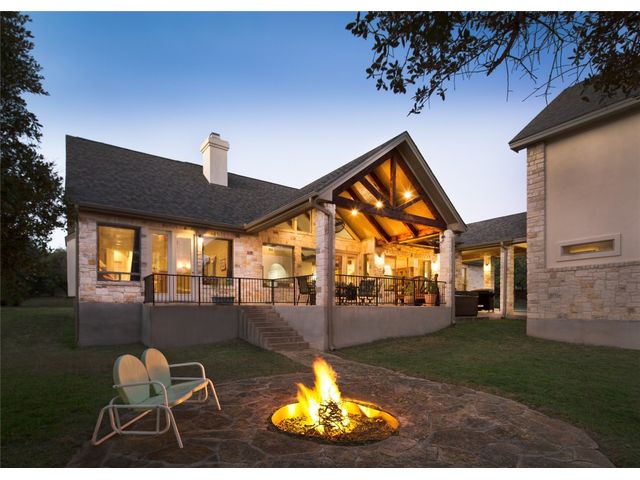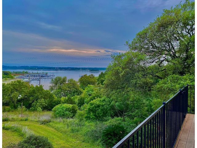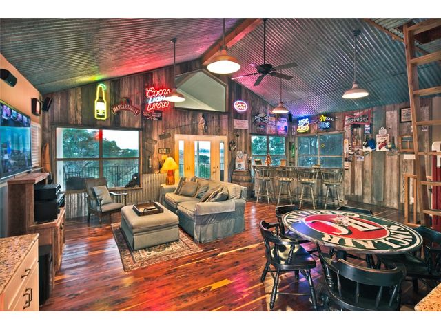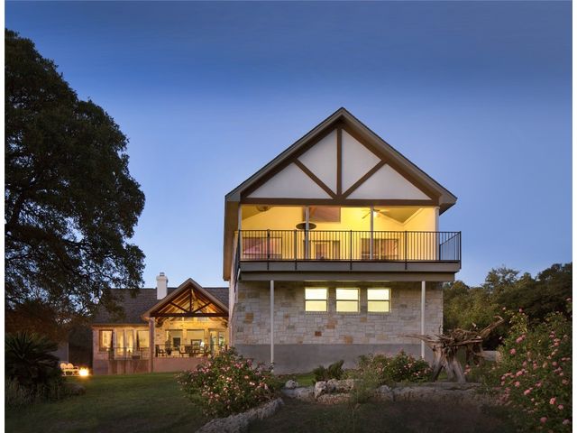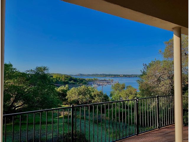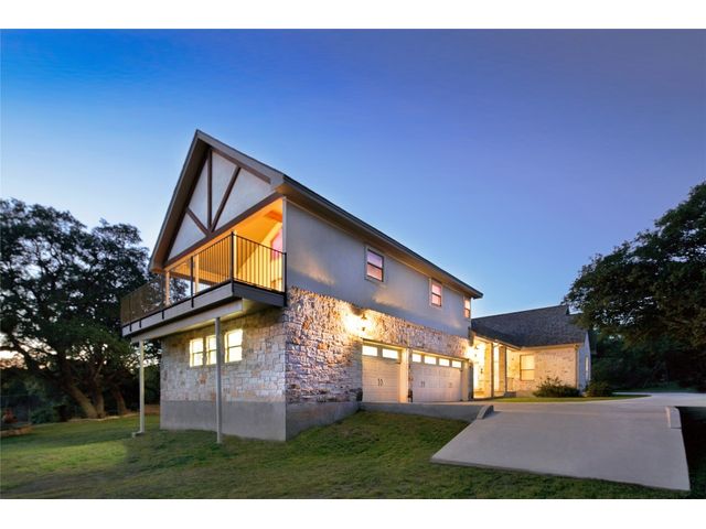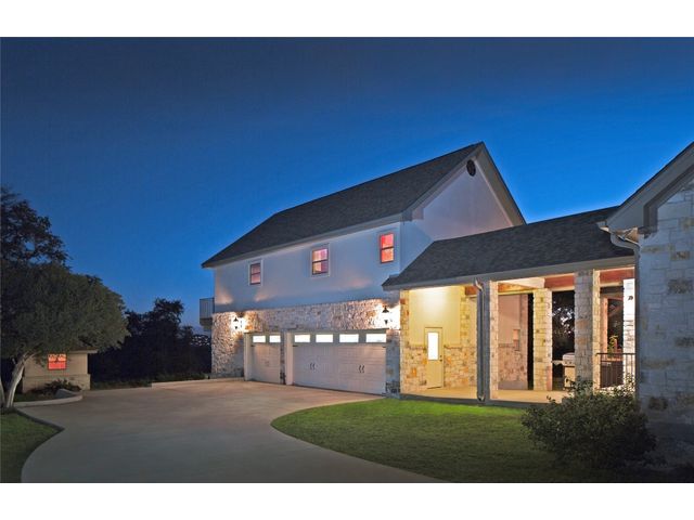 Situated on .889 acres in Volente with nearly every room providing scenic views of Lake Travis, this property combines privacy, luxury, and the natural beauty of its location. VIP Marina offers easy access to lake adventures just a stone's throw away. This meticulously crafted stone, single-story home is defined by its open and airy design, featuring a sophisticated blend of contemporary and rustic elements. Vaulted ceilings with exposed wooden beams bring an element of architectural interest and openness to the space. The living room's prominent stone hearth extends from floor to ceiling, offering both aesthetic appeal and a cozy gathering spot. The kitchen serves as the heart of the home, equipped with premium wood cabinetry, a generous L-shaped island topped with granite, and a high-performance 5-burner gas cooktop. Adjacent to the kitchen, the dining area welcomes casual meals and lively conversations. The main bedroom is designed with comfort in mind, flooded with natural light and outfitted with soft carpeting for a quiet, restful ambiance. Its en-suite bathroom features dual vanities, ample storage within a walk-in closet, a deep soaking tub, and a standalone shower, catering to both functionality and relaxation. Additional bedrooms share a well-appointed Jack and Jill bathroom, ensuring space and privacy for family members or guests. Outdoor living is accentuated by a spacious covered patio, which offers panoramic views of the landscaped backyard and the tranquil Lake Travis beyond. This area is an ideal extension for entertaining or simply enjoying the peaceful outdoors. Completing this home is a versatile 3-car garage that includes a fully equipped guest house with a spacious living area, bedroom, bathroom, and kitchen. Garage includes plug for electric vehicle or welding equipment.