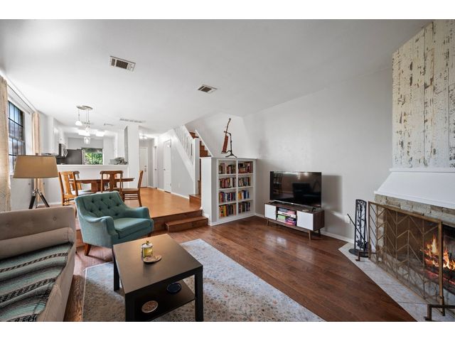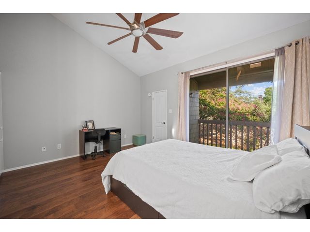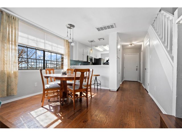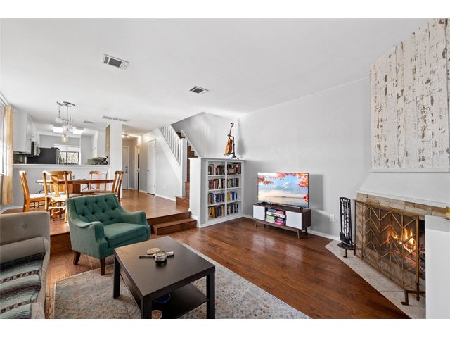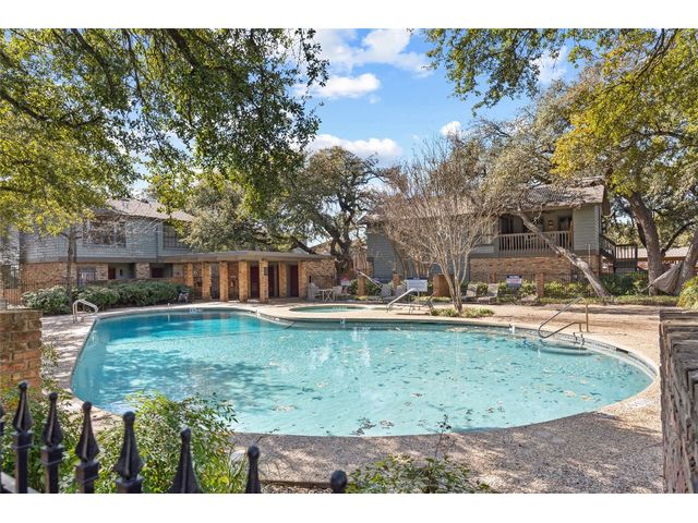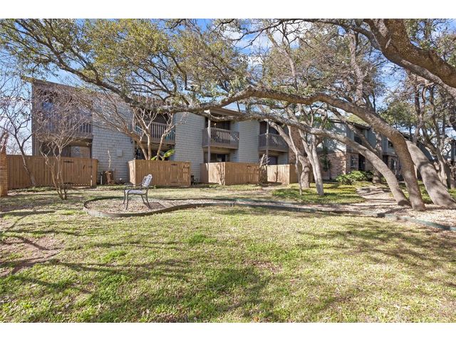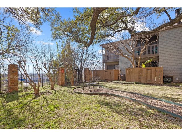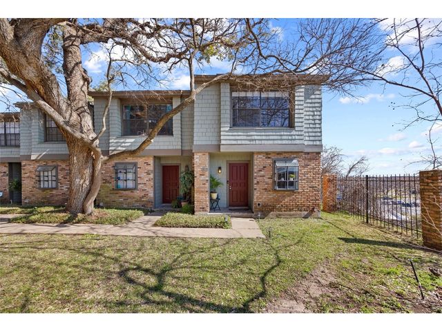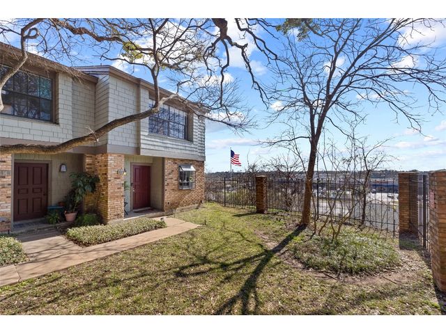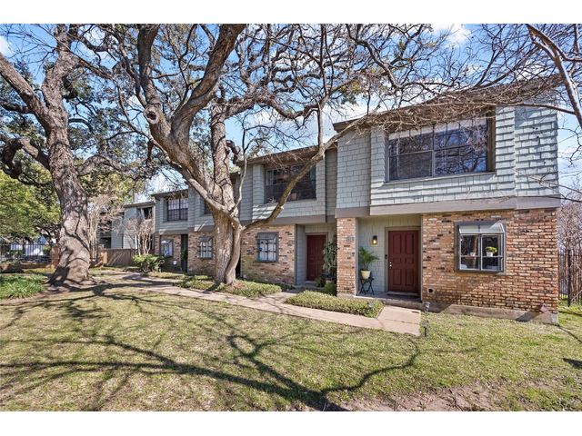 Welcome to this private, updated end-unit condo nestled amongst beautiful, mature live oaks! This move-in-ready masterpiece offers downtown views peaking through the treetops and stunning sunsets with which you end each day from your second story balcony. You’ll be greeted by an abundance of gorgeous natural light flowing through large windows, tall ceilings and skylights. Wood flooring stretches throughout the home and a functional layout that makes living easy. State of the art appliances convey. This unit is unique with a large window in the dining area not common for this layout. The kitchen has been brought to life with stylish features including sleek quartz countertops, stainless steel appliances, modern hardware, and a soft blue backsplash that adds the perfect pop of color to the space. Best of all, the kitchen appliances, a reverse osmosis system, washer and dryer will all convey! A spacious dining area leads you to the inviting living space, featuring a cozy wood burning fireplace to keep you warm in the cooler months. From here, you can head outside to the private patio or make your way upstairs to take a look at the bedrooms. Each bedroom and their closets are generously sized and offer soaring ceilings to make each feel light and airy. The primary suite has its own balcony where you can retreat to enjoy your morning coffee with a view. Guests will have access to a convenient powder room on the first floor and the full bathroom upstairs has dual access points as well as the ability to close off the shower area so everyone can get ready at the same time. You’ll be steps away from the community pool and hot tub and you’ll enjoy a convenient UT shuttle pick-up located at the complex gate. Assigned parking space #480. Enjoy a sense of serenity and seclusion while still offering easy access to Downtown Austin and the surrounding areas. Blocks from HEB, CVS, Starbucks, Addie Rose Boutique, Bittermans Deli and more shopping/entertainment. Amazing location!