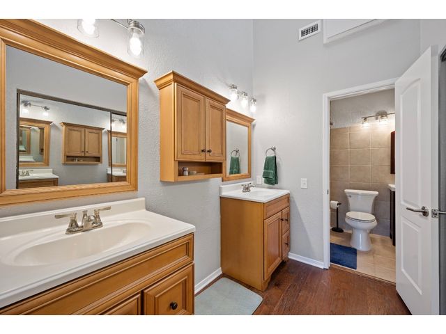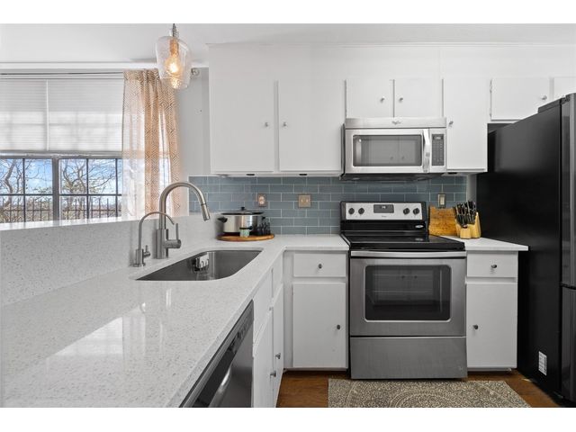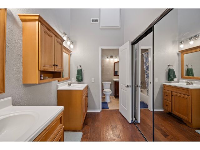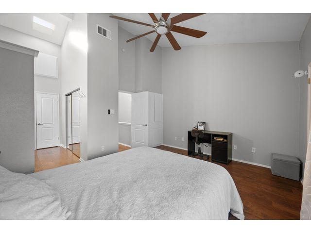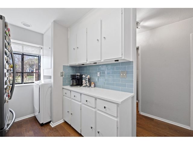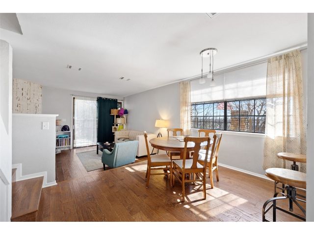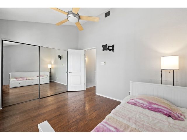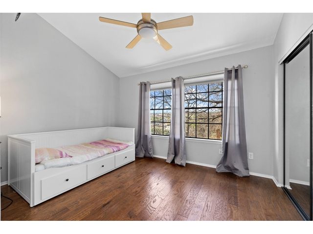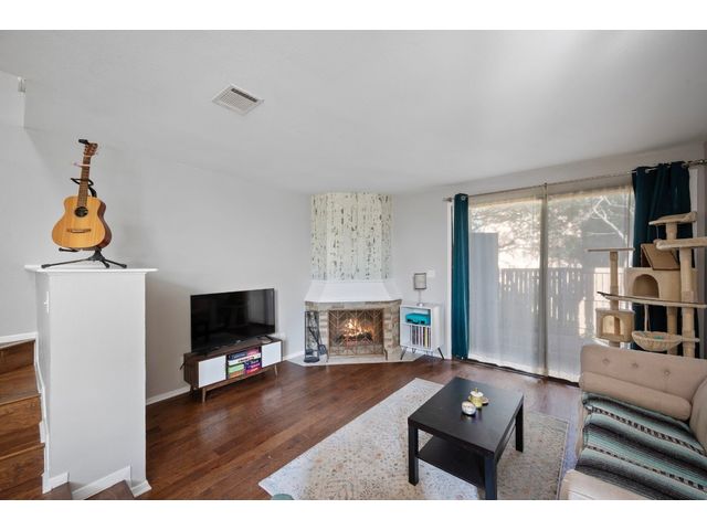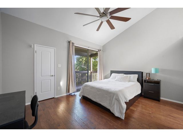 Welcome to this private, updated end-unit condo nestled amongst beautiful, mature live oaks! This move-in-ready masterpiece offers downtown views peaking through the treetops and stunning sunsets with which you end each day from your second story balcony. You’ll be greeted by an abundance of gorgeous natural light flowing through large windows, tall ceilings and skylights. Wood flooring stretches throughout the home and a functional layout that makes living easy. State of the art appliances convey. This unit is unique with a large window in the dining area not common for this layout. The kitchen has been brought to life with stylish features including sleek quartz countertops, stainless steel appliances, modern hardware, and a soft blue backsplash that adds the perfect pop of color to the space. Best of all, the kitchen appliances, a reverse osmosis system, washer and dryer will all convey! A spacious dining area leads you to the inviting living space, featuring a cozy wood burning fireplace to keep you warm in the cooler months. From here, you can head outside to the private patio or make your way upstairs to take a look at the bedrooms. Each bedroom and their closets are generously sized and offer soaring ceilings to make each feel light and airy. The primary suite has its own balcony where you can retreat to enjoy your morning coffee with a view. Guests will have access to a convenient powder room on the first floor and the full bathroom upstairs has dual access points as well as the ability to close off the shower area so everyone can get ready at the same time. You’ll be steps away from the community pool and hot tub and you’ll enjoy a convenient UT shuttle pick-up located at the complex gate. Assigned parking space #480. Enjoy a sense of serenity and seclusion while still offering easy access to Downtown Austin and the surrounding areas. Blocks from HEB, CVS, Starbucks, Addie Rose Boutique, Bittermans Deli and more shopping/entertainment. Amazing location!