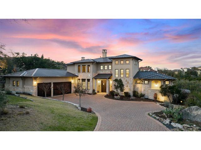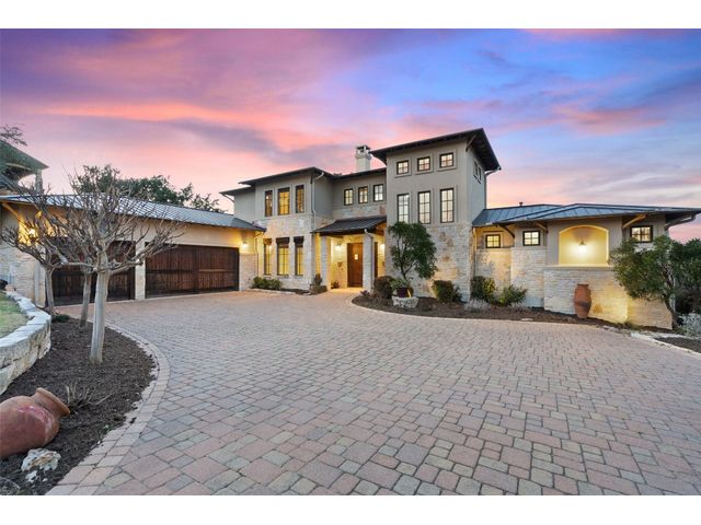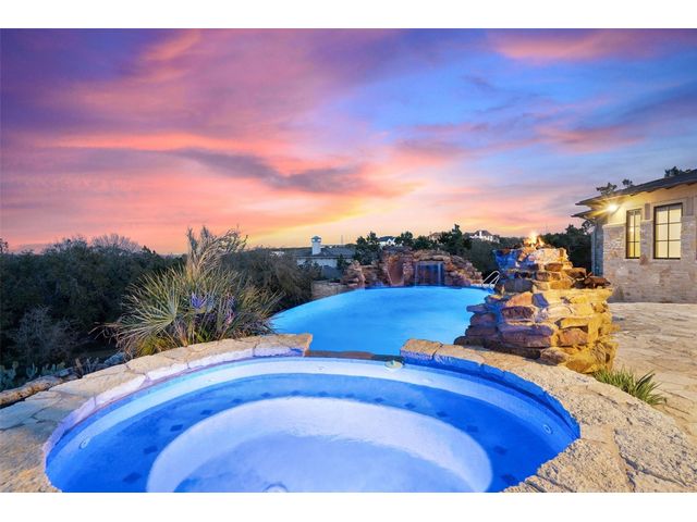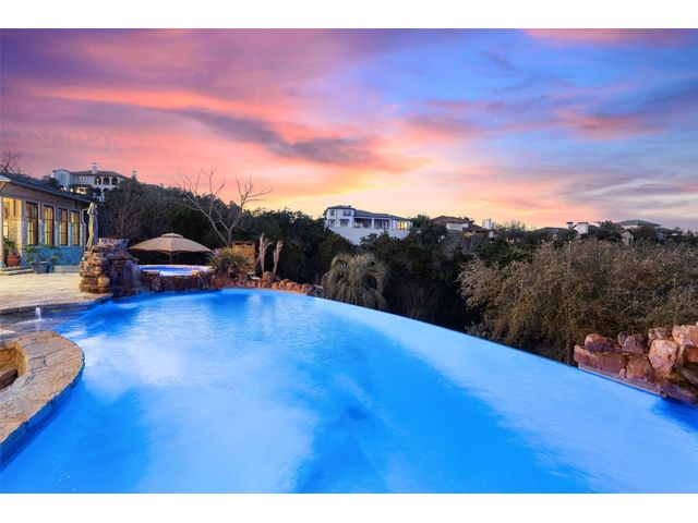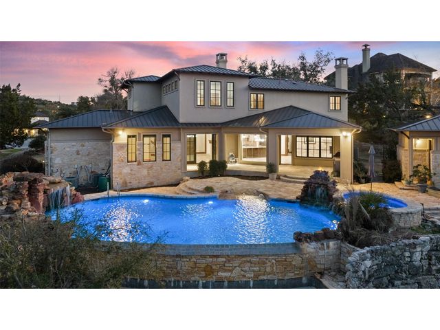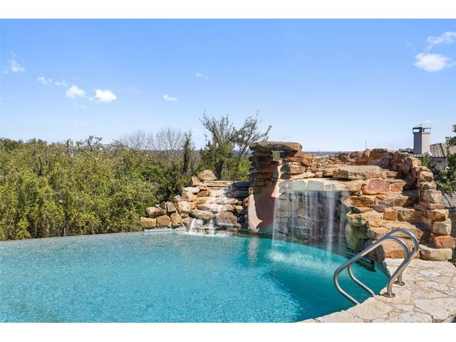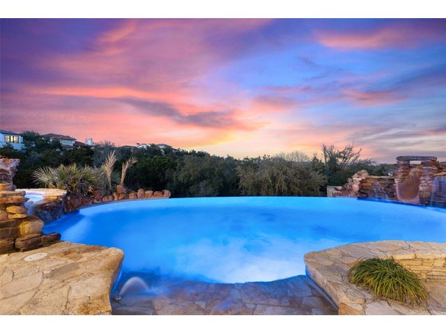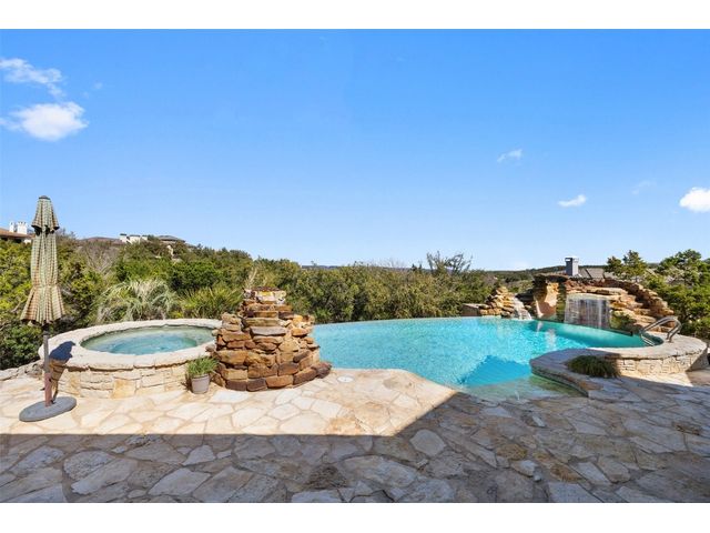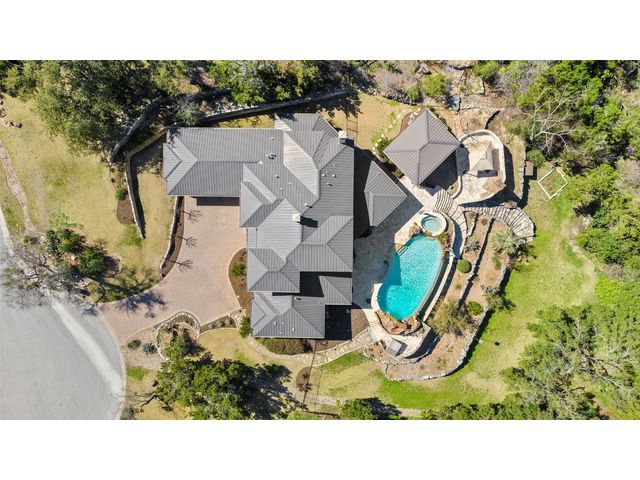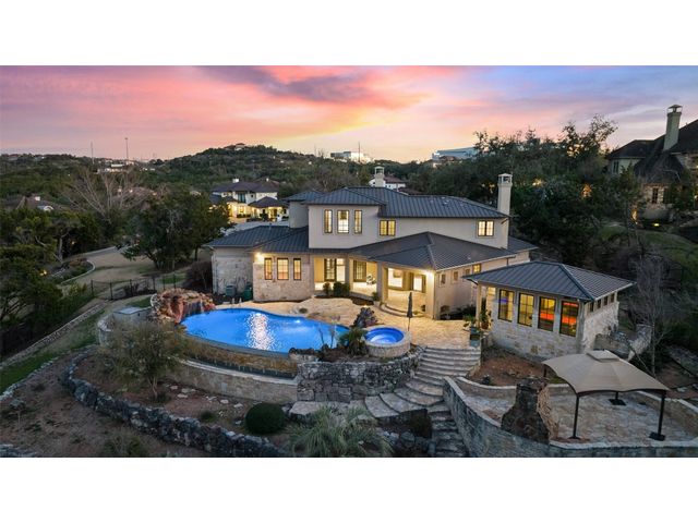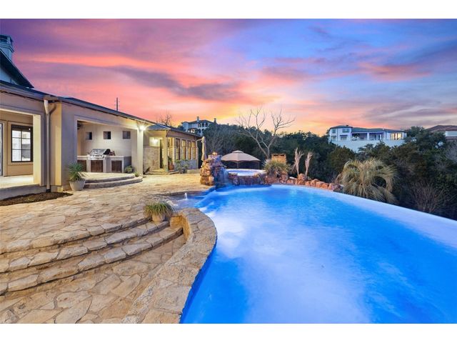 Welcome to 8708 Capehart Cove, a luxurious retreat nestled in the prestigious neighborhood of Seven Oaks - part of Eanes ISD community of Austin, TX. This exquisite 5-bedroom, 5.5-bathroom home boasts an impressive 5394 square feet of living space on a sprawling one-acre home site. Upon entering, you are greeted by a grand 2 story foyer bathed in natural light. The study features French doors and a wall of limestone adding warmth to the room. The formal dining includes a cozy fireplace and makes the perfect stage for entertaining. Both the primary and guest bedroom are conveniently located on the main level. The primary overlooks the relaxing backyard and takes advantage of serene views, it includes a coffee bar, 2 large walk-in closets, primary bath with whirlpool tub, separate shower, and double sinks. Ascend the staircase to discover three additional bedrooms, each with its own ensuite bathroom, large walk-in closets, and a spacious game room. The open concept design seamlessly connects the kitchen, living room, and breakfast area, creating an ideal space for both relaxation and entertaining. The gourmet kitchen is a chef's delight, featuring a sit-up bar, granite counters, steam oven, warming drawer, double ovens, gas cooktop, and an abundance of custom cabinets. Outside, the backyard is a private oasis, complete with a covered verandah, outdoor kitchen, and a stunning negative edge pool with fire features, spa, grotto, and slide. The expansive hardscape provides ample room for gatherings around the outdoor fireplace, while a separate pool house offers potential as an exercise room, additional study, or playhouse. Experience luxury living at its finest in this remarkable Austin residence. Don't miss the opportunity to make this extraordinary property your own.