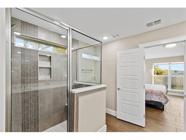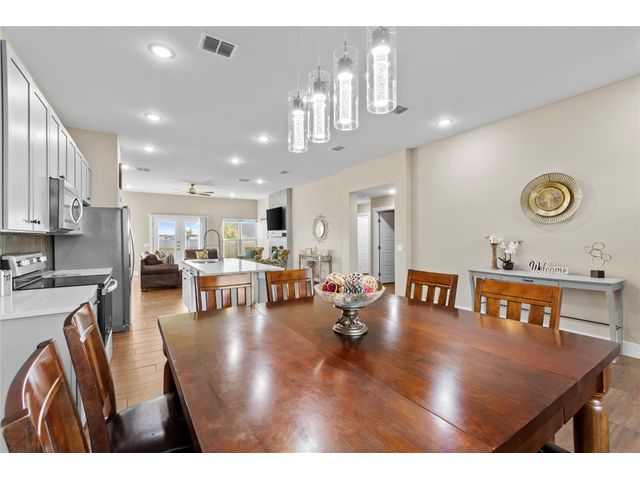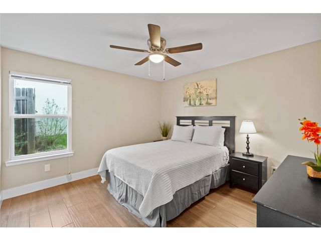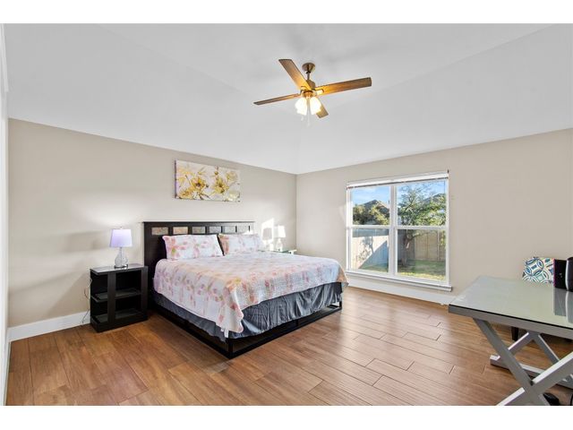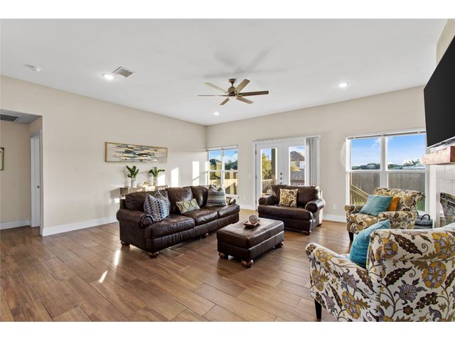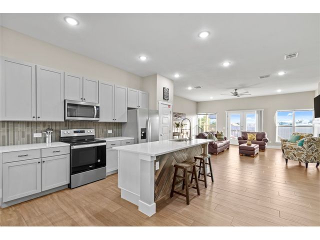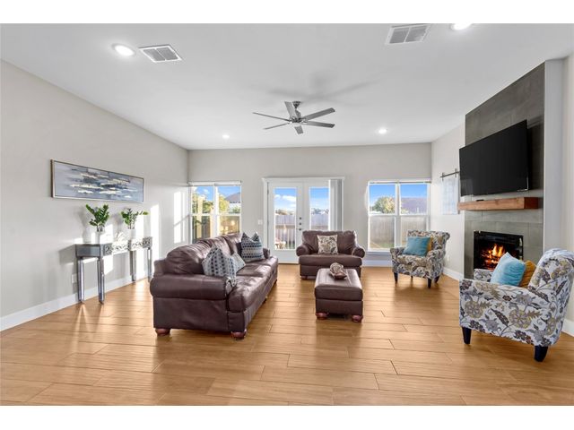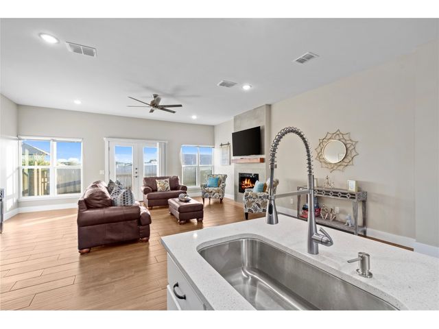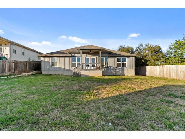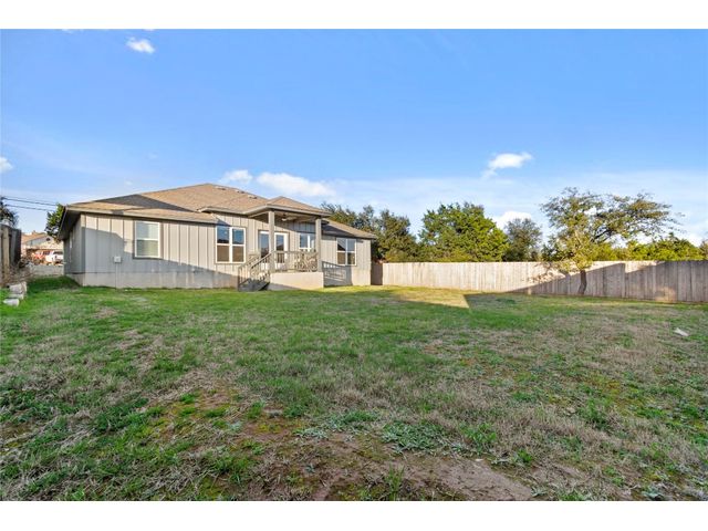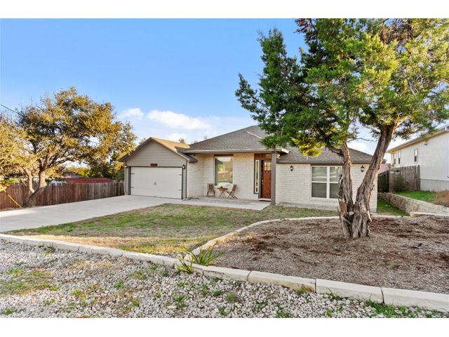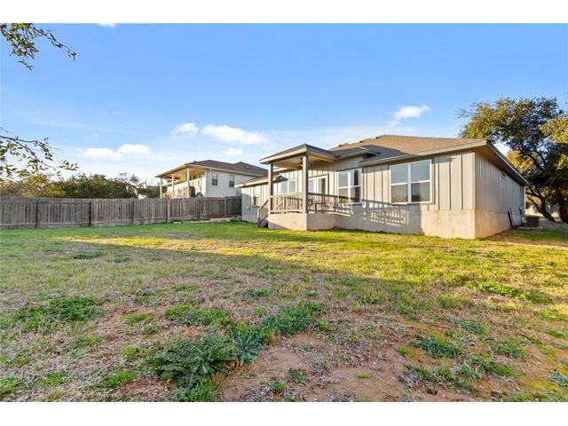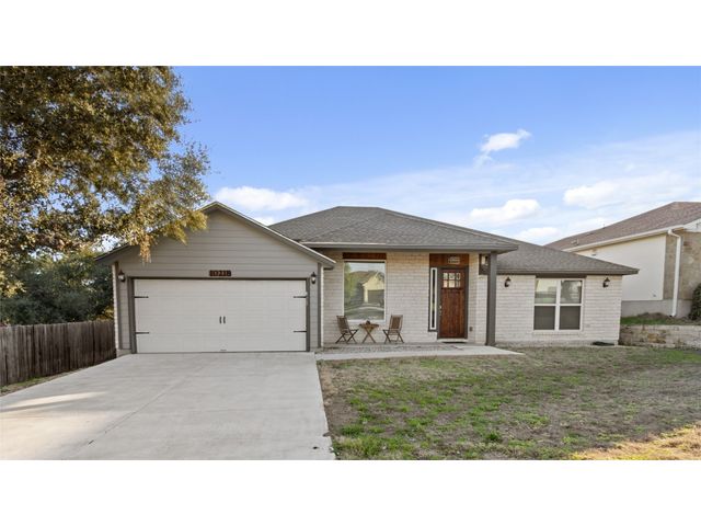 Welcome to 10218 Longhorn Skwy, in Dripping Springs, TX. This charming house boasts 2056 square feet of living space, featuring 4 bedrooms and 2 full baths. Upon entering, you'll be greeted by an inviting open concept layout with 10ft high ceilings, the wood-like TILE flooring throughout the house adds an elegant look while ensuring easy maintenance. Say goodbye to carpet!! Blinds are already installed, and ceiling fans grace every room. Step outside to relax on the front porch or unwind on the covered back patio accessed through double doors. The back yard is large and leveled perfect for sports or pets. Inside, you'll notice the attention to detail with extra wide baseboards and a modern wood front door with glass windowpanes. The kitchen has quartz countertops, a center island, and stainless-steel appliances. Enjoy the convenience of an undermount stainless steel single bowl sink with a pull-out spray faucet and soap dispenser, complemented by a modern backsplash that adds flair to the space. Cozy up on chilly evenings beside the fireplace in the living room, creating the perfect ambiance for gatherings or quiet nights in. Retreat to the master suite, complete with a spacious closet featuring extra shelving. The master bath has a walk-in shower with modern tile design, a shampoo compartment, and a double vanity. Additional highlights include a laundry room with extra shelving, a voluntary HOA, and zoning for Lake Travis ISD, ensuring access to quality education. Plus, enjoy the benefits of a low tax rate of just 1.56, making this home both desirable and affordable.